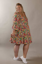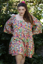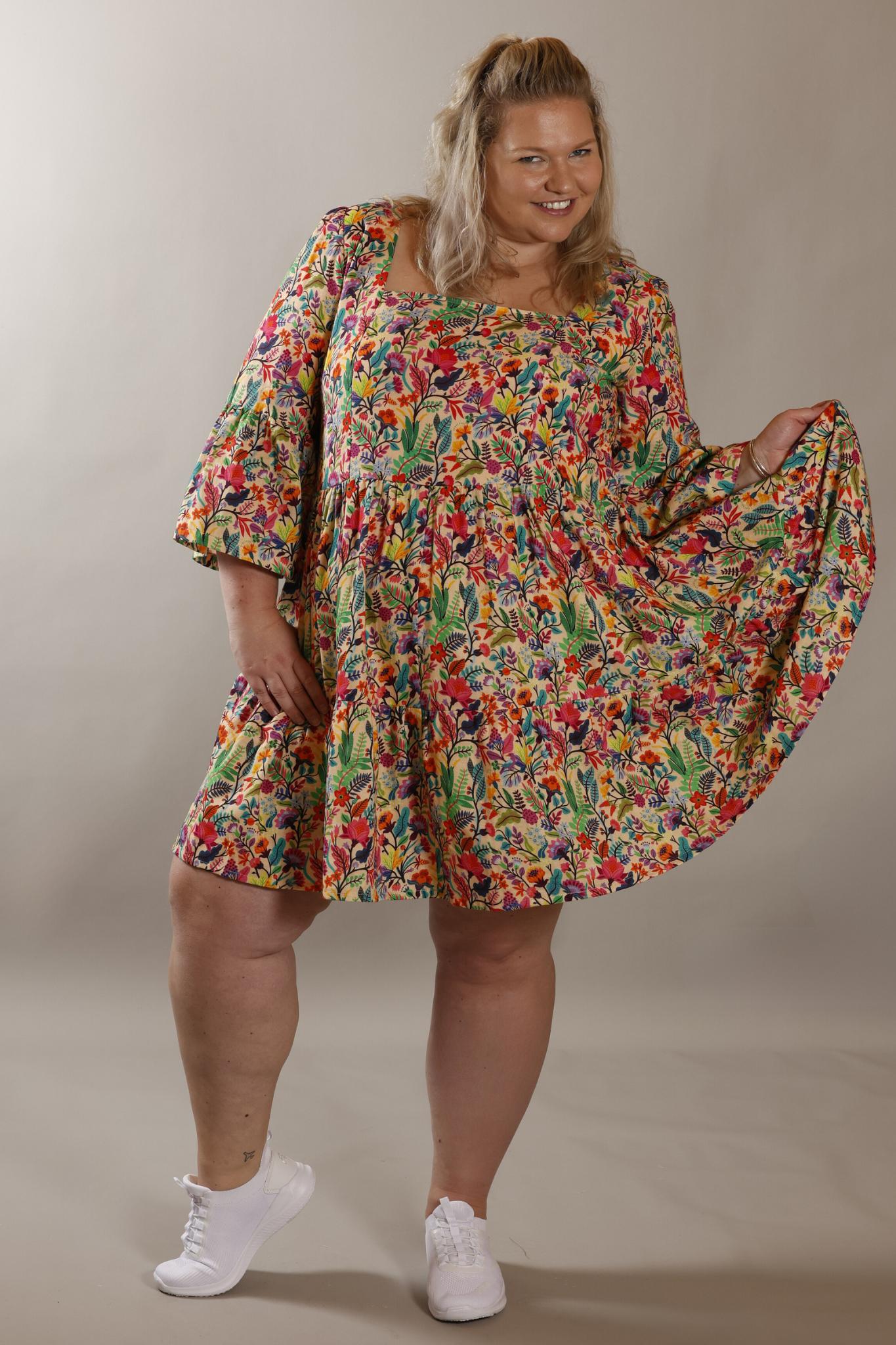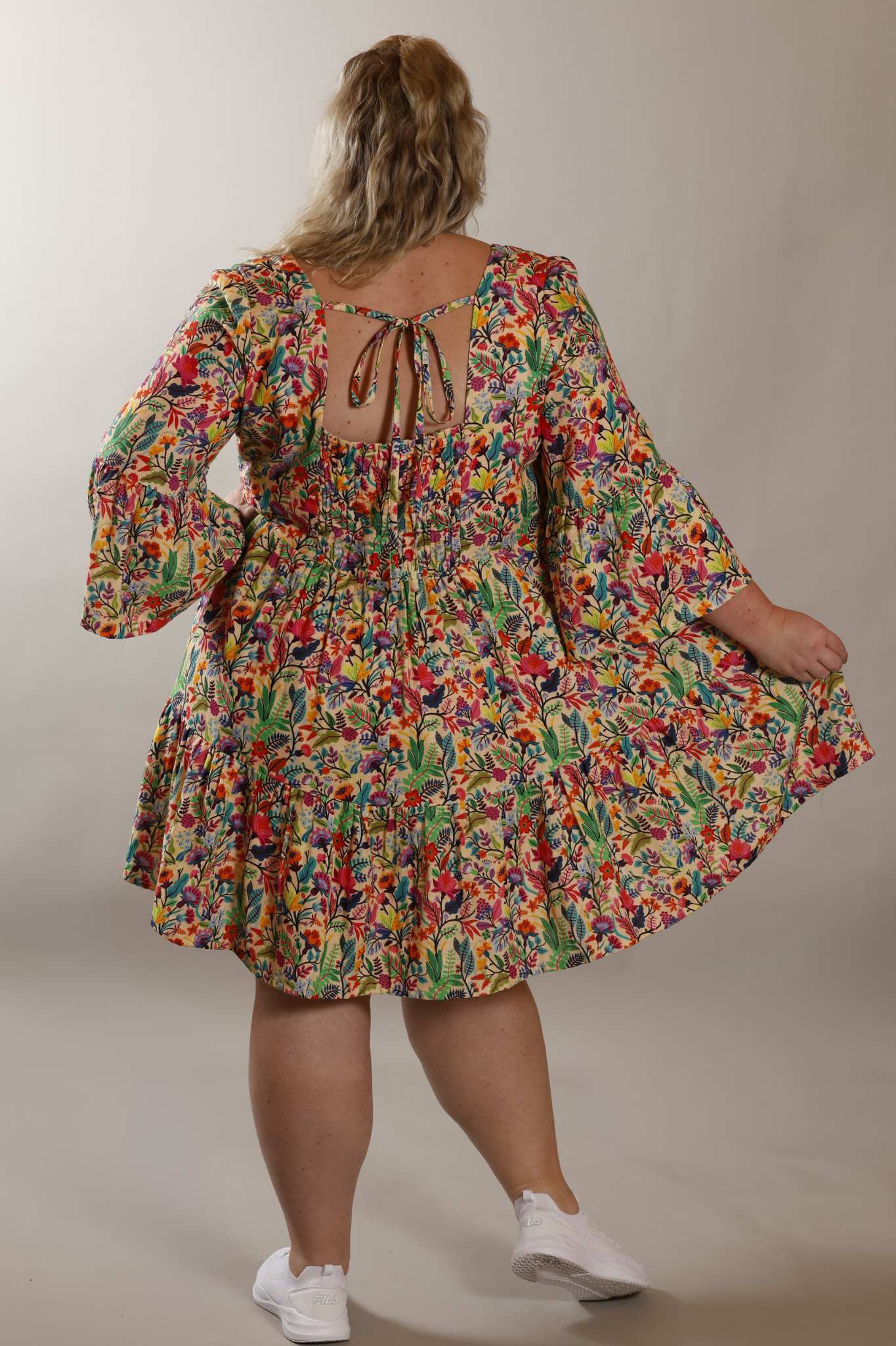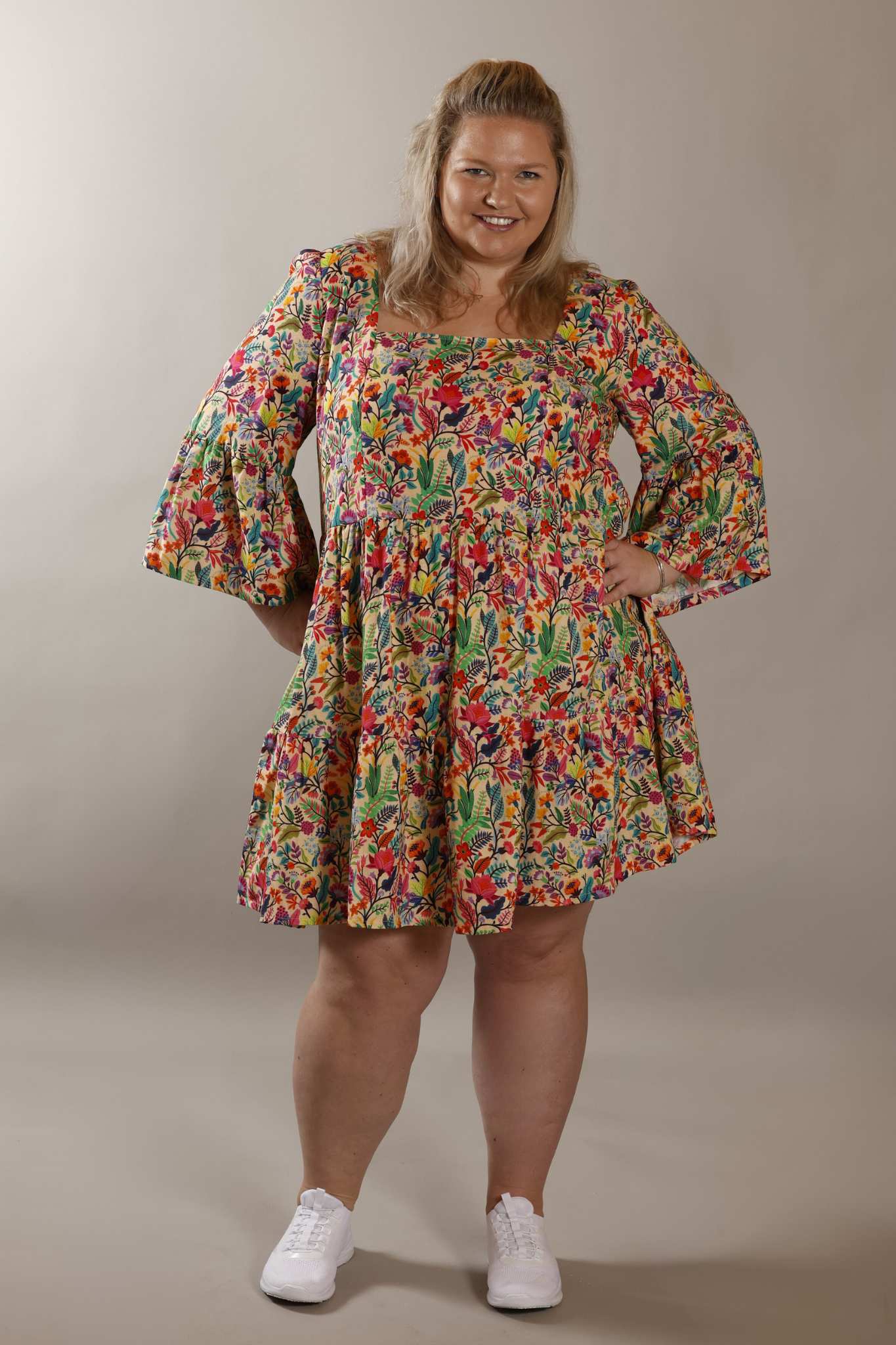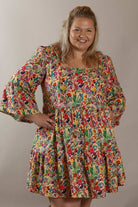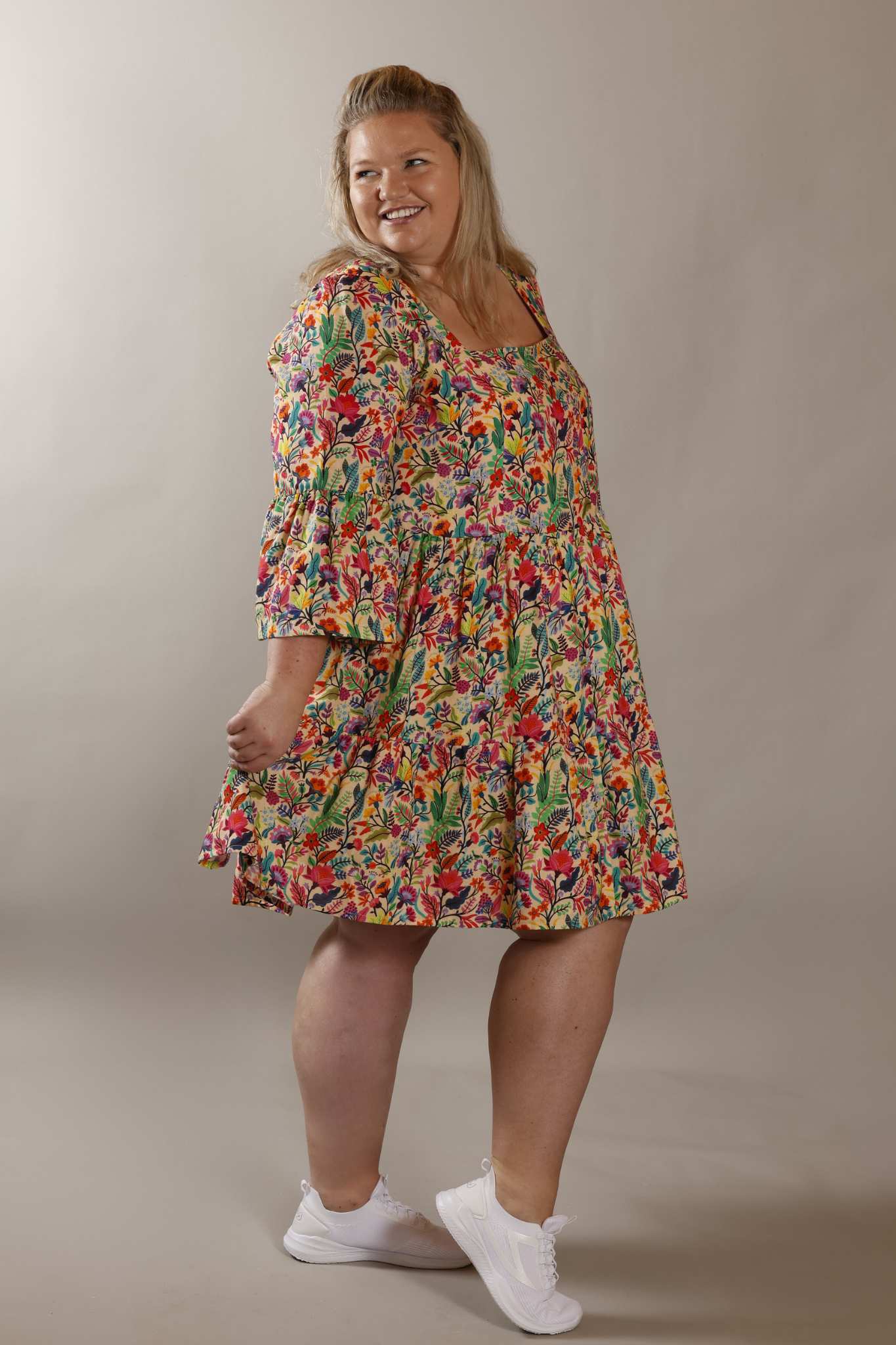 PLUS SIZE and ALL SIZES 100% soft cotton dress in multi coloured floral on a cream background print. This dress is a loose fitting smock style, which is so easy to wear for summer or layered up for cooler weather. The sizing is very generous.