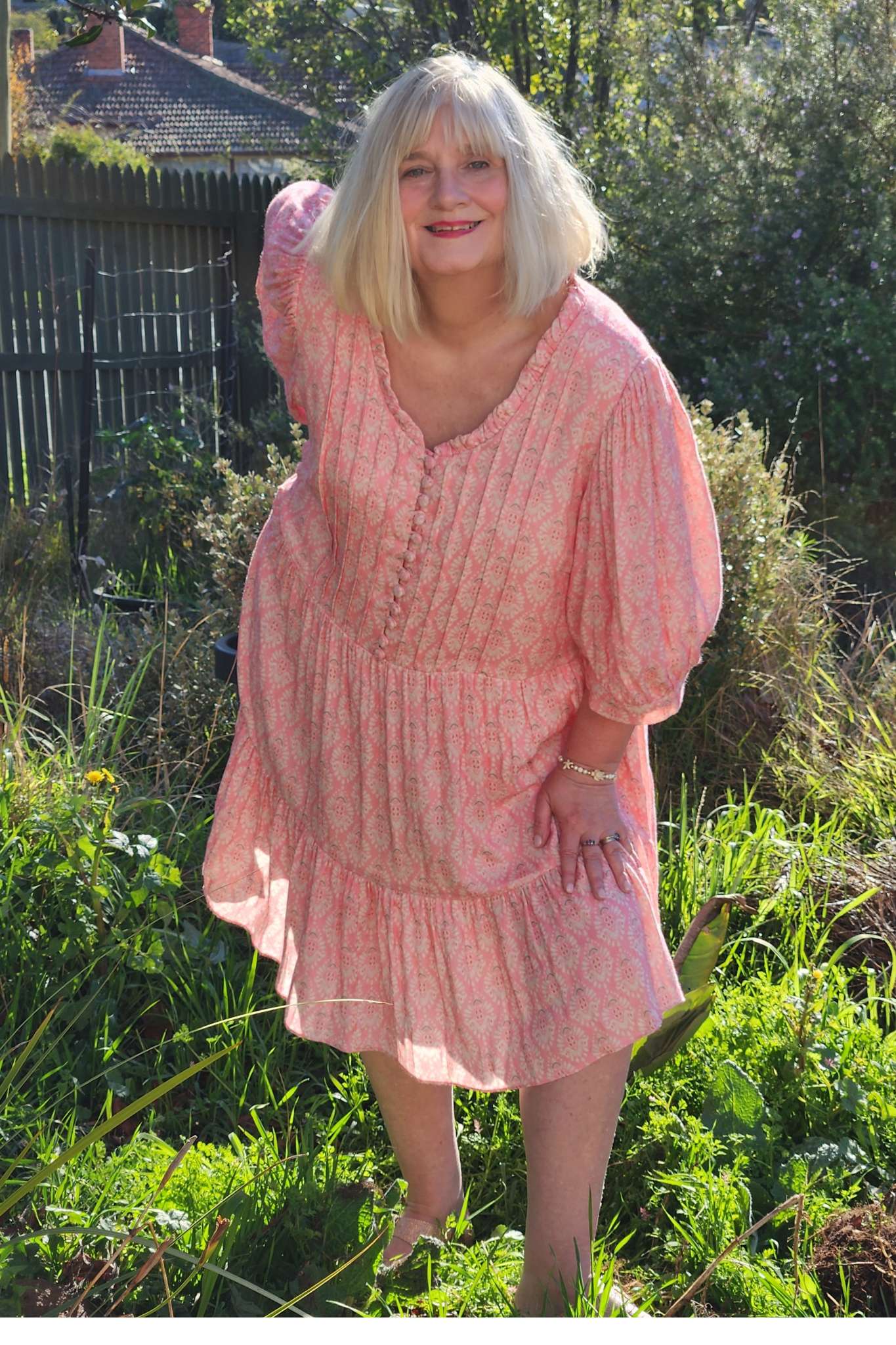 Features are a pintucked bodice with a frill at the neckline. It has covered buttons and loop opening at the front. Bump and breastfeeding friendly dress.