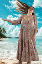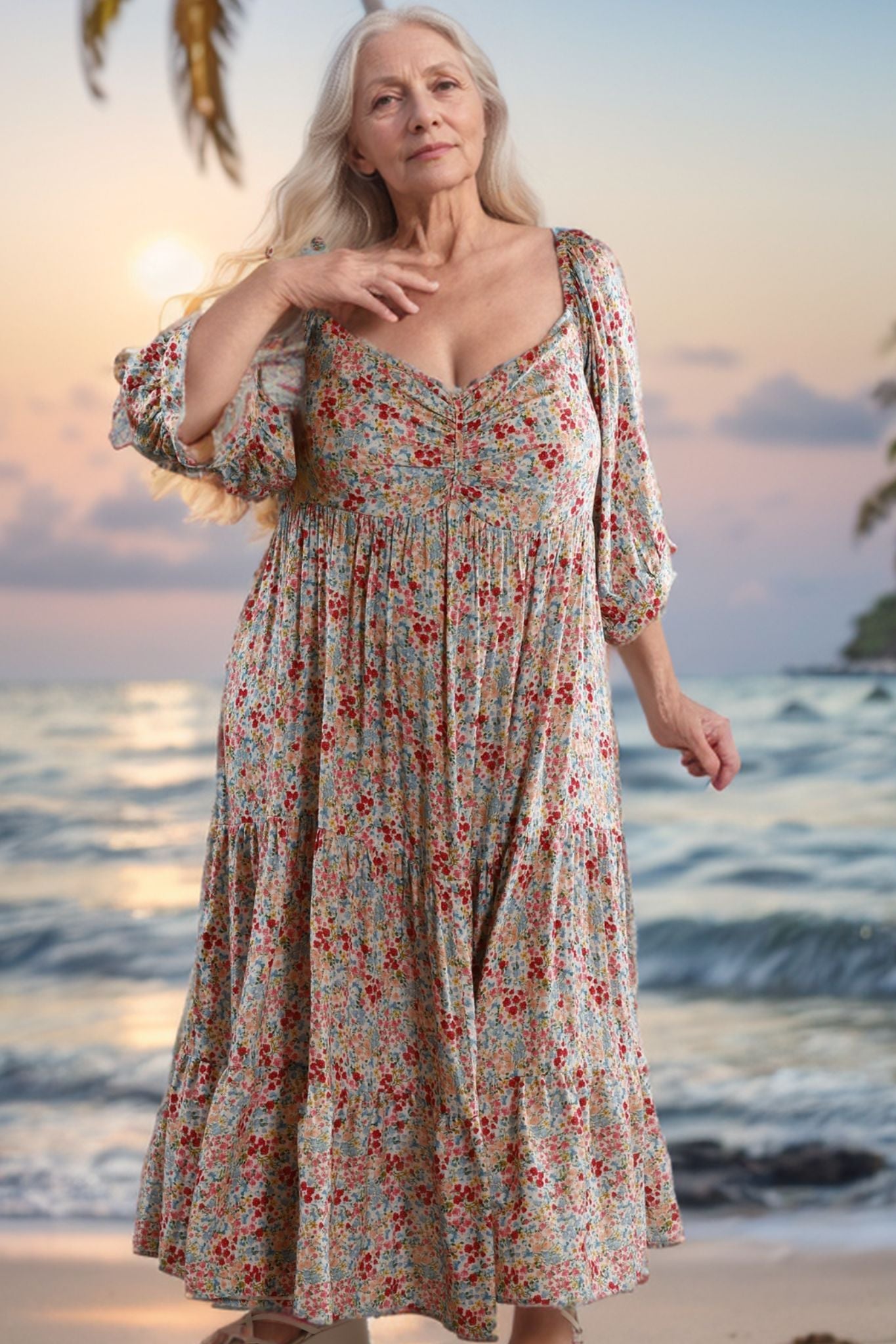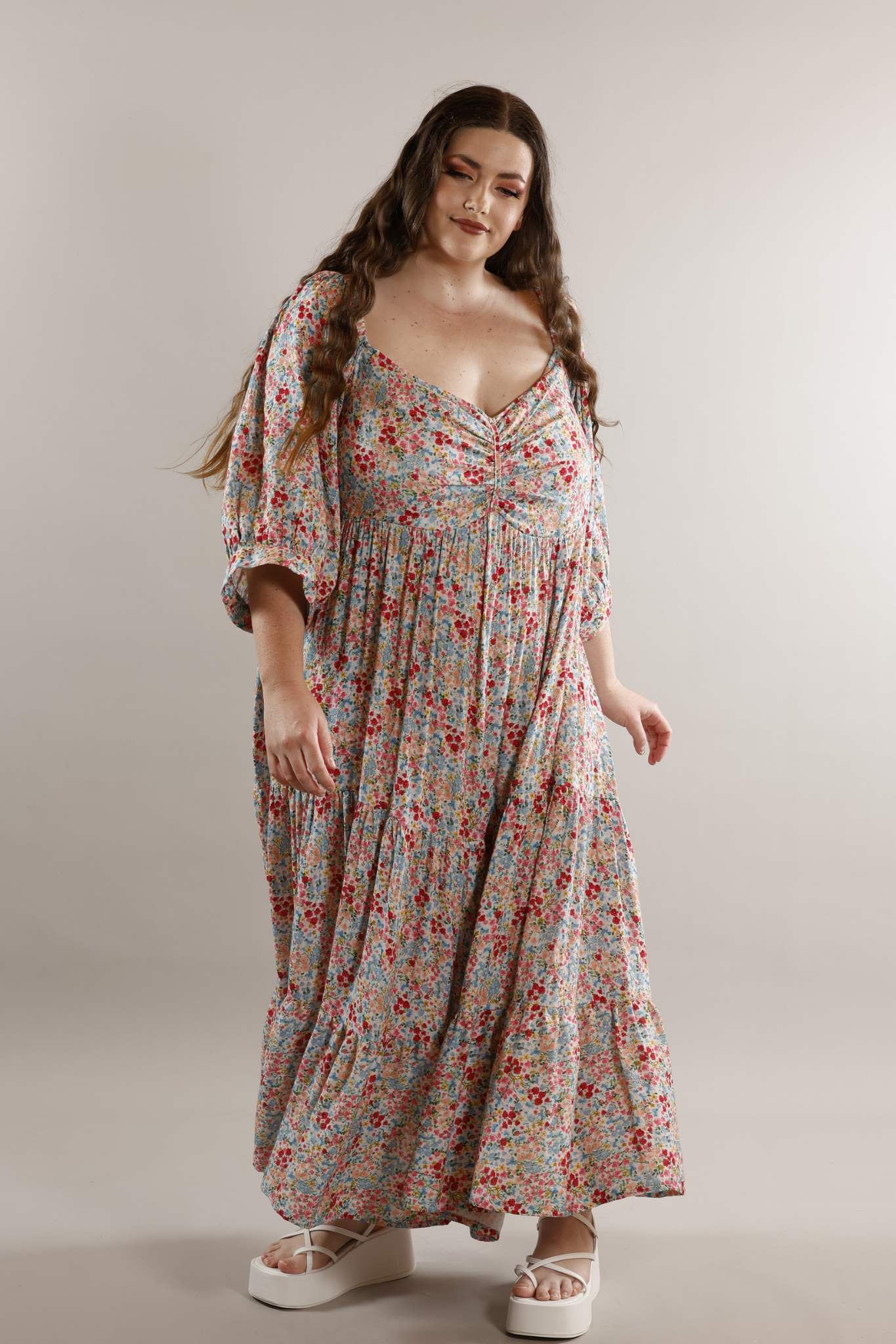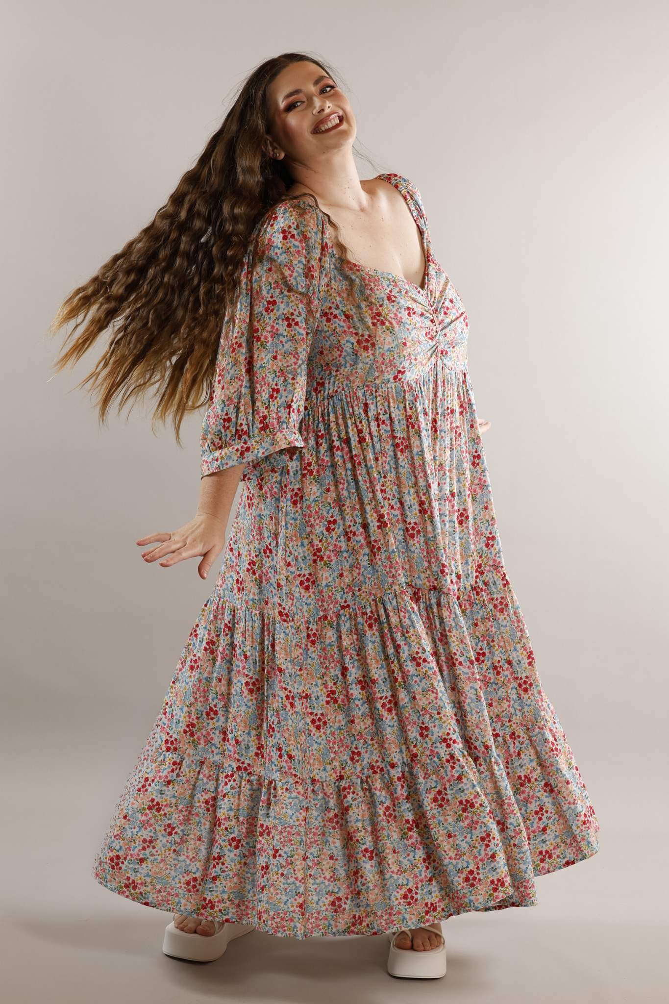 PLUS SIZE and ALL SIZES in this pure cotton soft and floaty smock style maxi dress in a beautiful flower field print . It has an on trend wide sweetheart neckline, which is ruched across the bust. This dress has a shaped empire line, which adds to the dreamy quality. Sleeves are gathered with elastic on the shoulder line and 3/4 length with loose cuffs. The skirt has 3 tiers and finishes at the ankle.