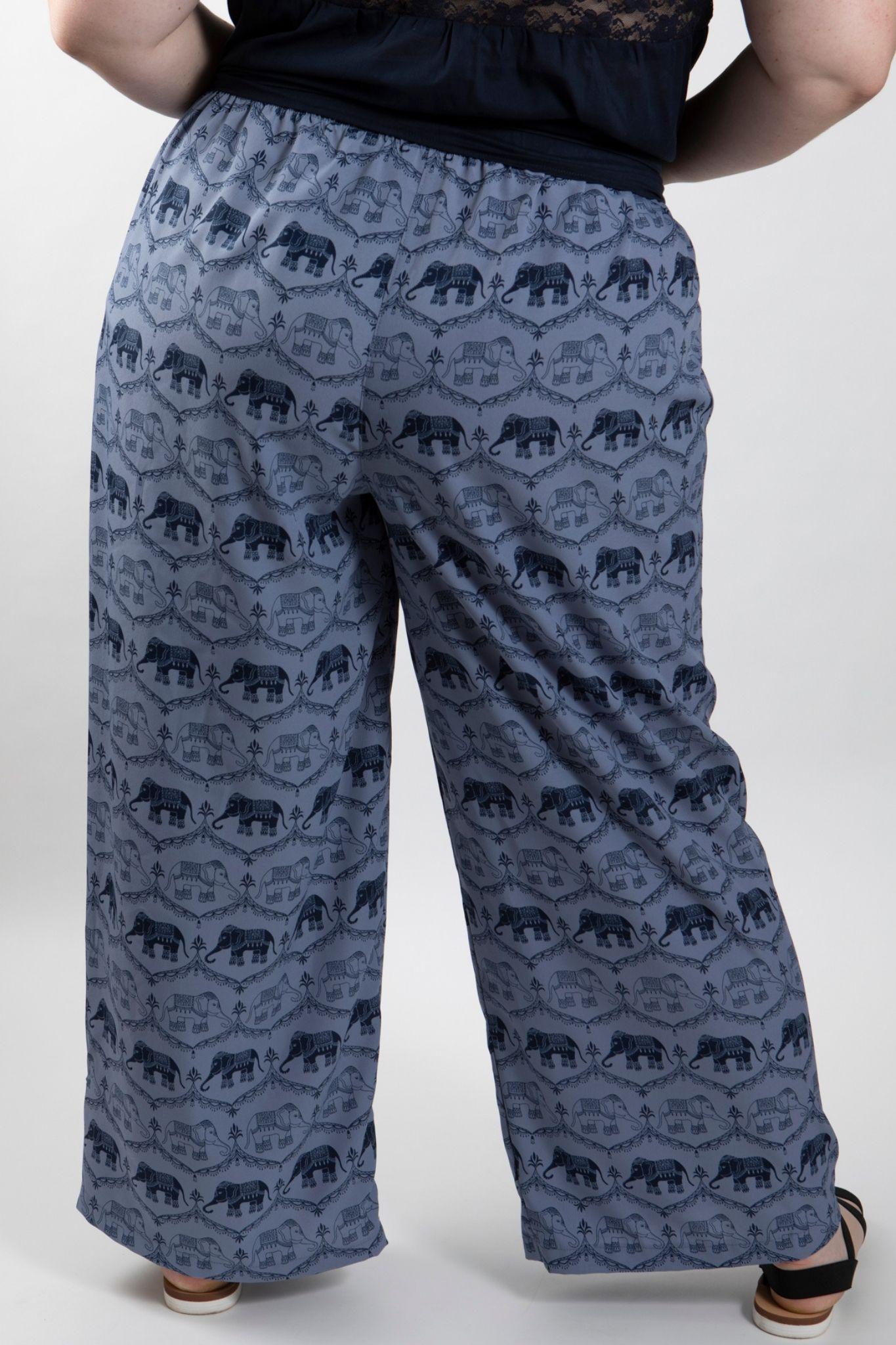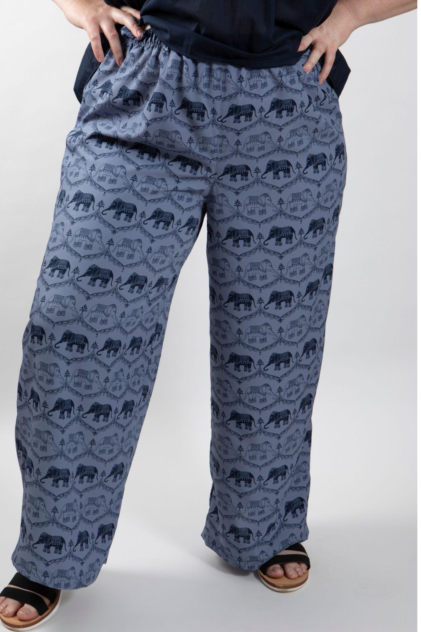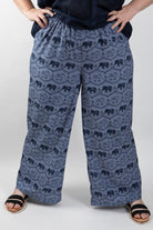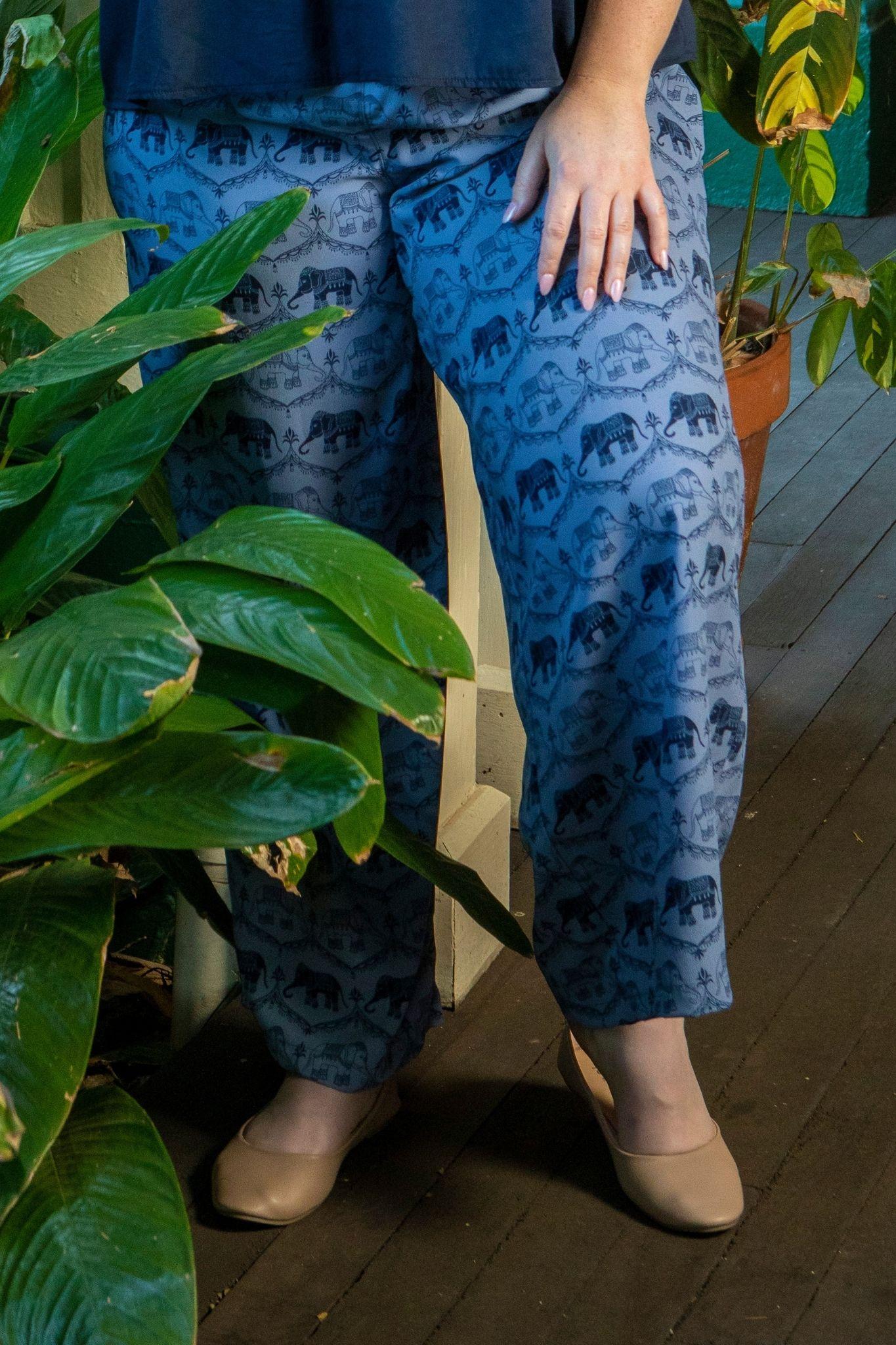 PLUS SIZE and ALL SIZES oh-so-lovely elephant print pajama/lounging pants. A gorgeous mid blue backgound with navy elephant design.