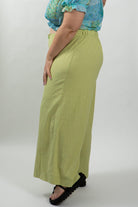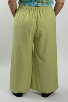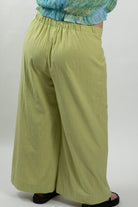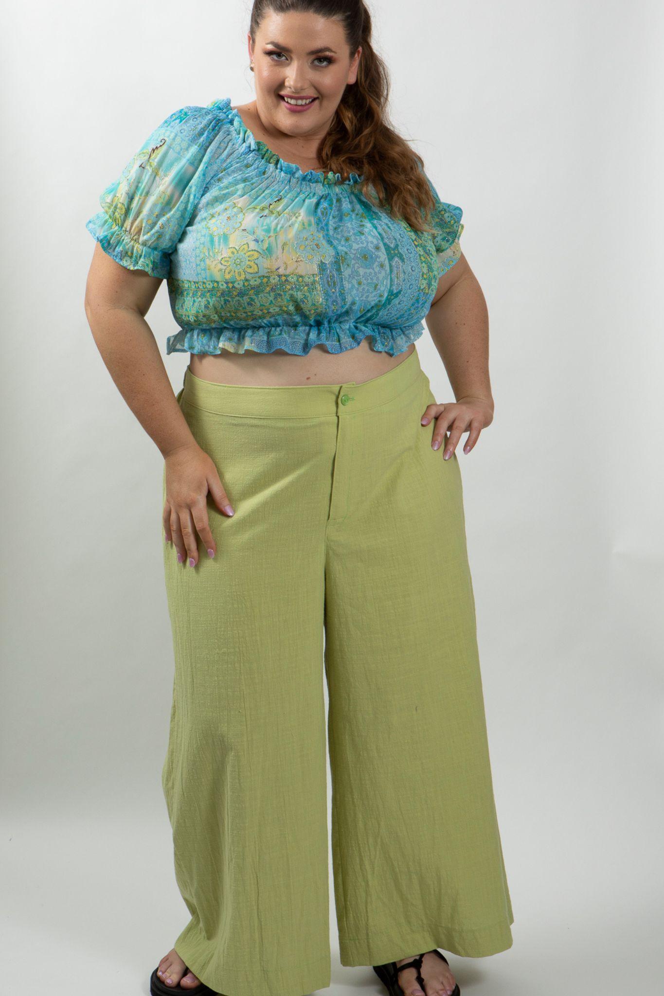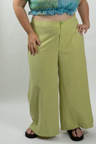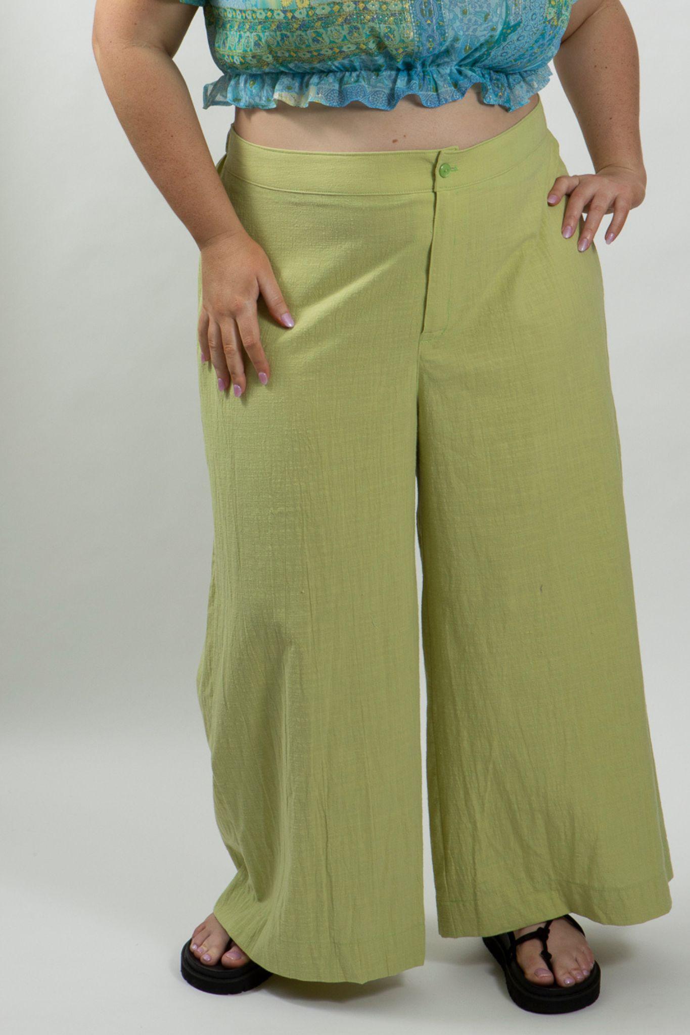 PLUS SIZE and ALL SIZES flat front pure cotton slub weave tailored wide leg trousers in moss green. Mix and match with our variety of tops, and can be dressed up or down with heels or flats.