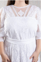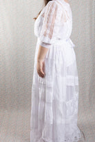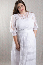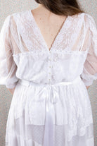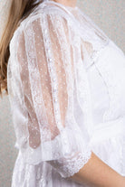 Bodice features lace over chiffon and hailspot tulle romantic styling, with a diamond shaped lace motif at centre front. Further detail is eyelet lace with satin ribbon, repeated on the hailspot tulle sleeves which are gathered into a stretch lace cuff just below the elbow. Pearl buttons and loops finish the back.