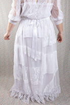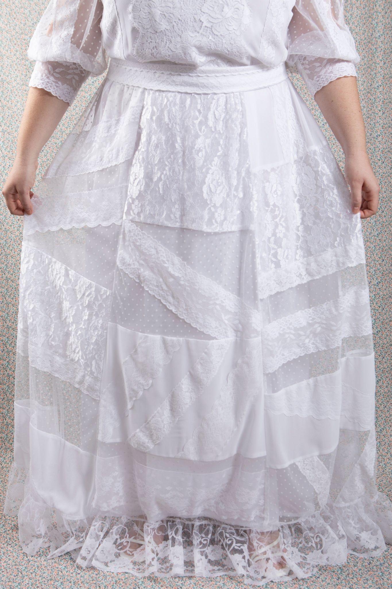 Skirt is "random" patchwork in shabby chic style in lace, chiffon and hailspot tulle with stitched lace placements for effect.