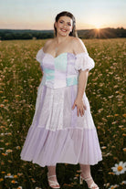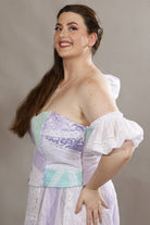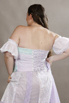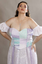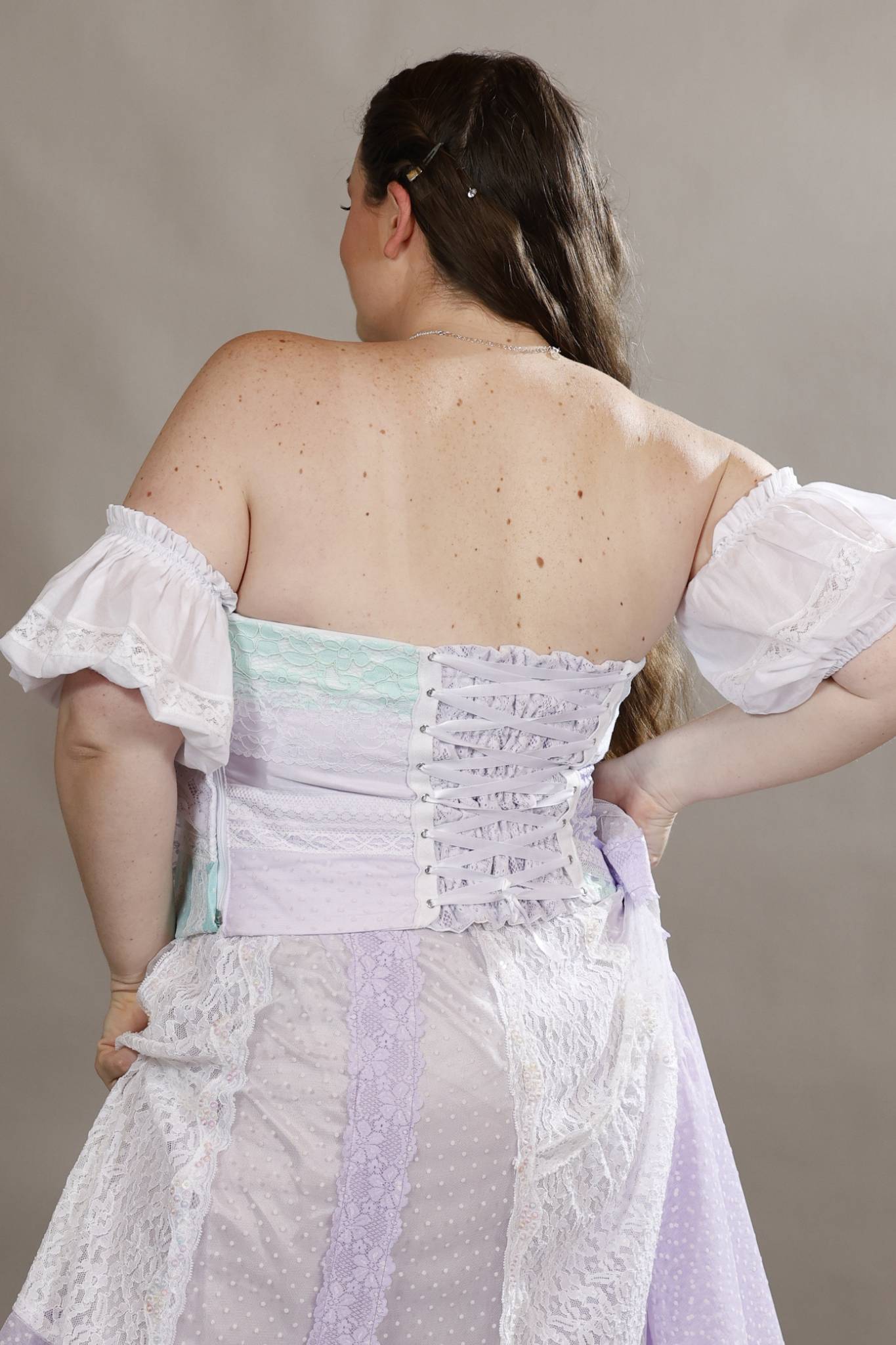 Stunning patchwork corset bodice, with lace and satin randomly pieced together to create a boho and cottage core vibe. The corset top features a sweetheart neckline, with princess seams and nylon boning for shape. There is an elastic panel at the back and eyelet tape with ribbon to adjust to size. An open end side zip allows for easy on/easy off.