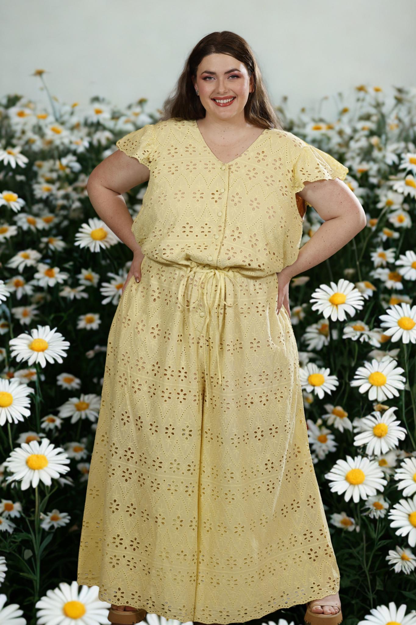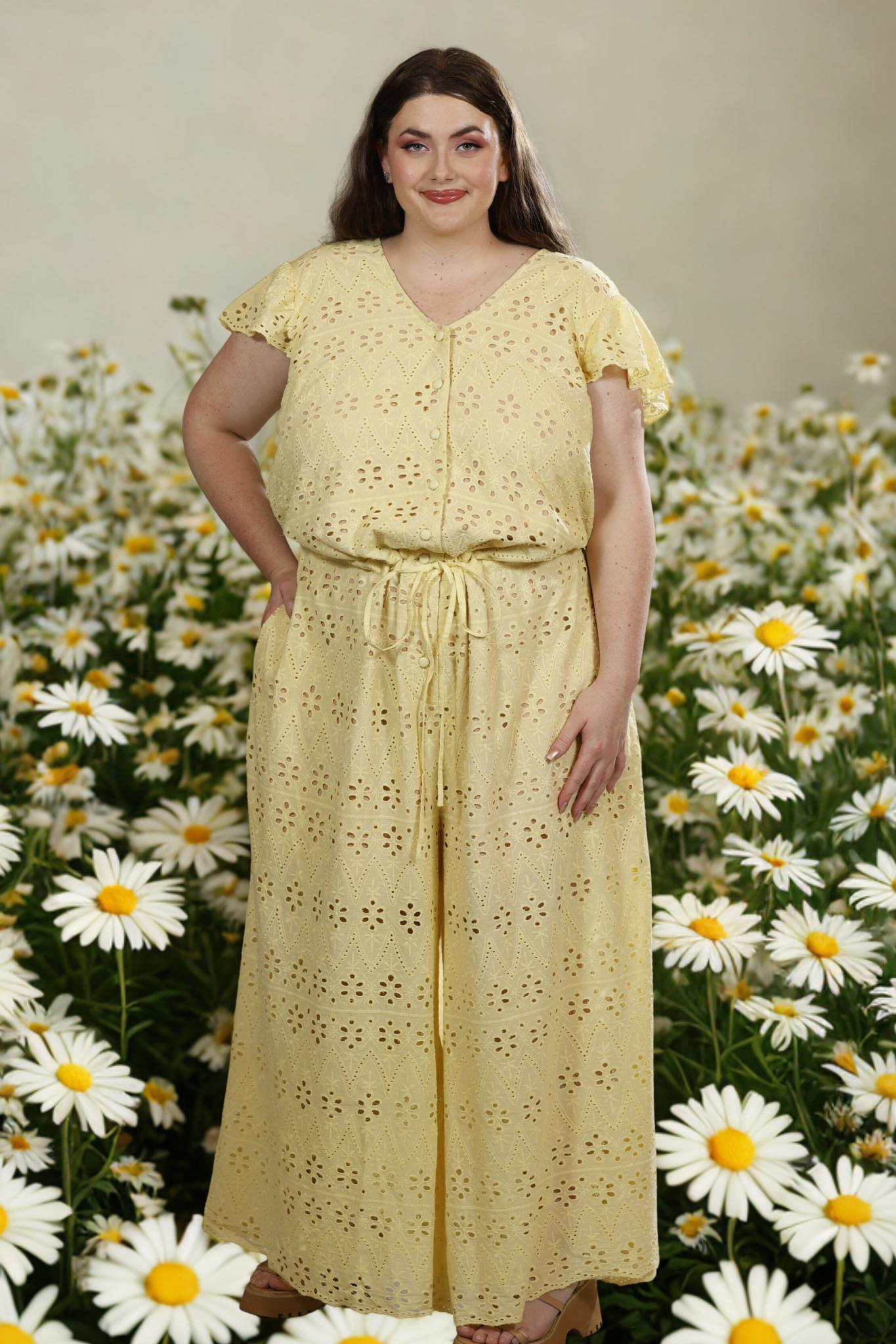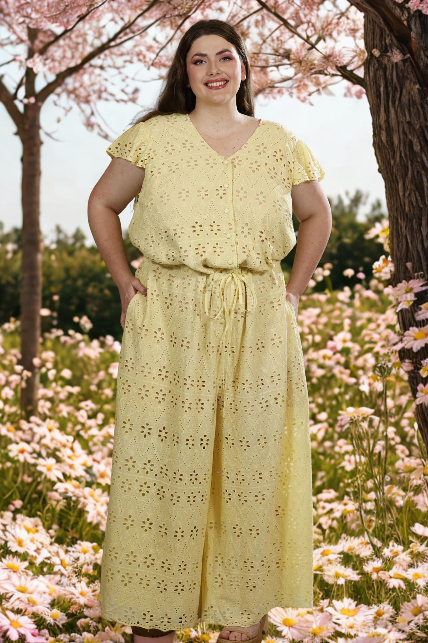 PLUS SIZE and ALL SIZES in jumpsuits and playsuits. 100% broderie anglaise cotton and nude cotton lining. On-trend styling with a cottage core aesthetic. Front buttoning and adjustable tie waist for pregnancy and/or nursing mothers.