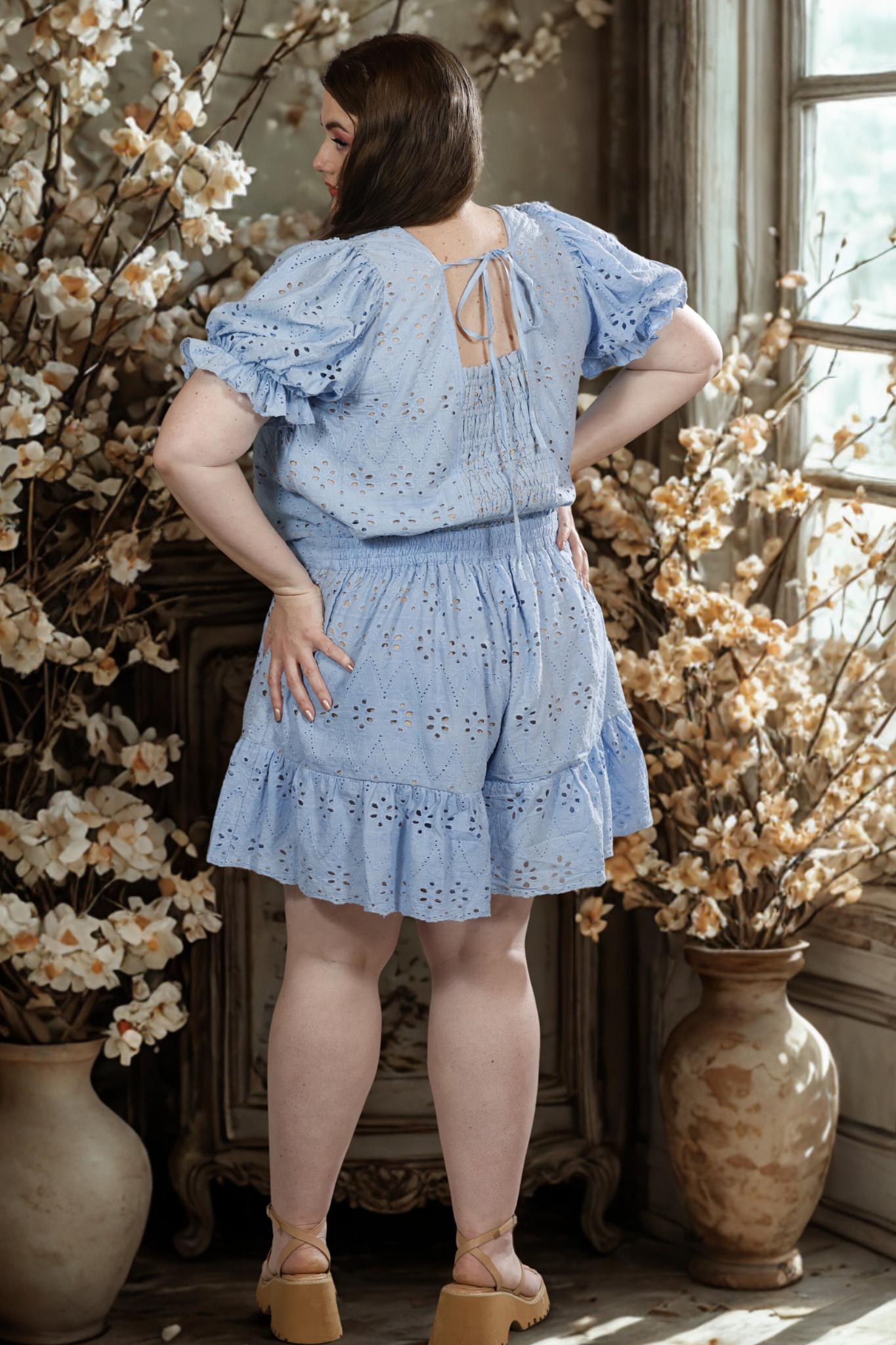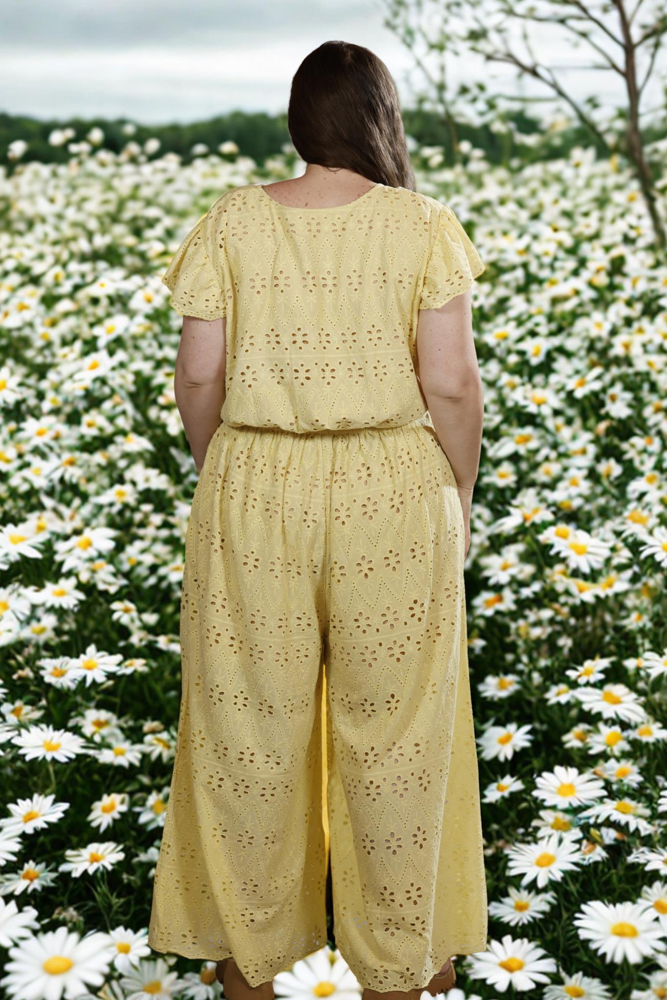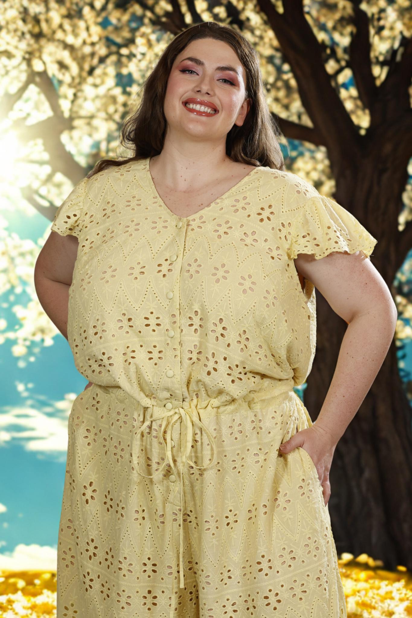 PLUS SIZE and ALL SIZES in jumpsuits and playsuits. 100% broderie anglaise cotton and nude cotton lining. On-trend styling with a cottage core aesthetic. Front buttoning and adjustable tie waist for pregnancy and/or nursing mothers.