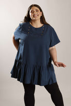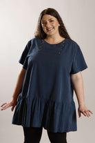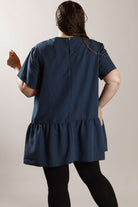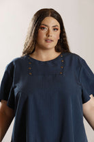 PLUS SIZE smock style dress in peacock blue polyester "dobby weave" microfibre fabric. It features antique bronze button detailing on the front and short sleeves, with a button and loop closure at the back. Lowered waistline and frill completes the look.
