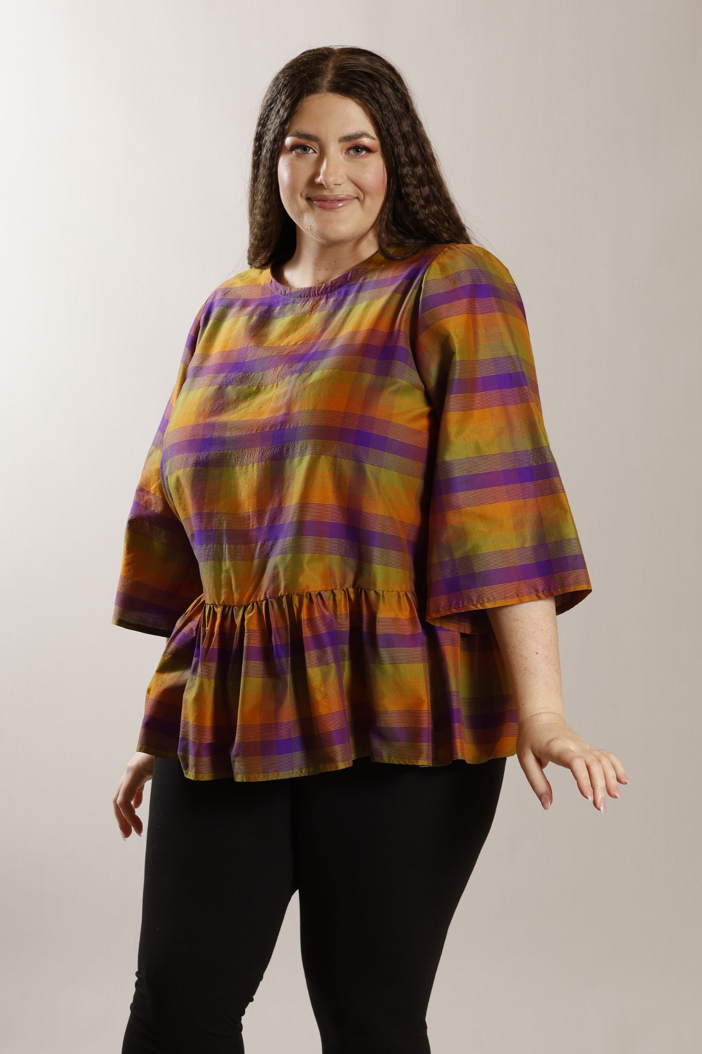 PLUS SIZE silk/cotton check pattern top in tones of olive/purple/maize. It features bell shaped 3/4 sleeves, with a zip closure at the back. A peplum frill at the hipline, finishes the look.