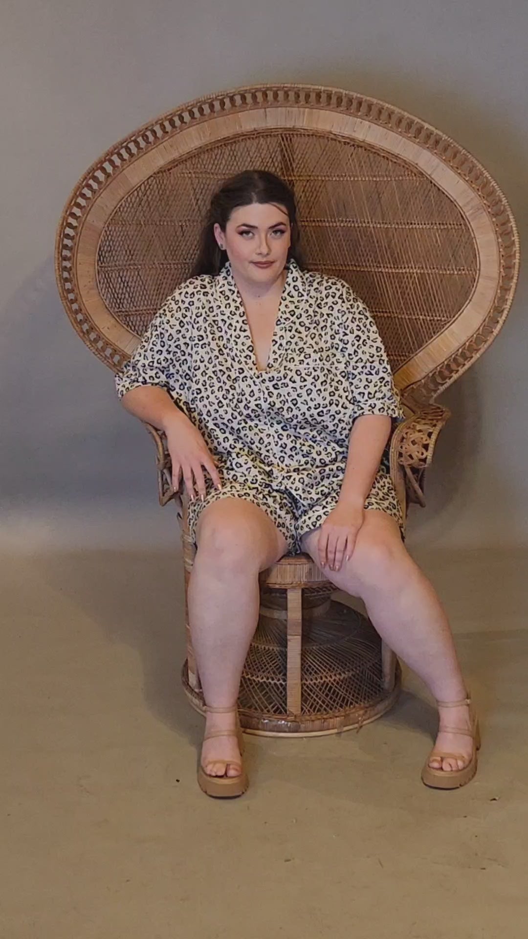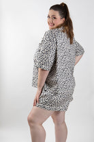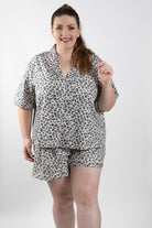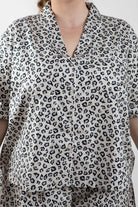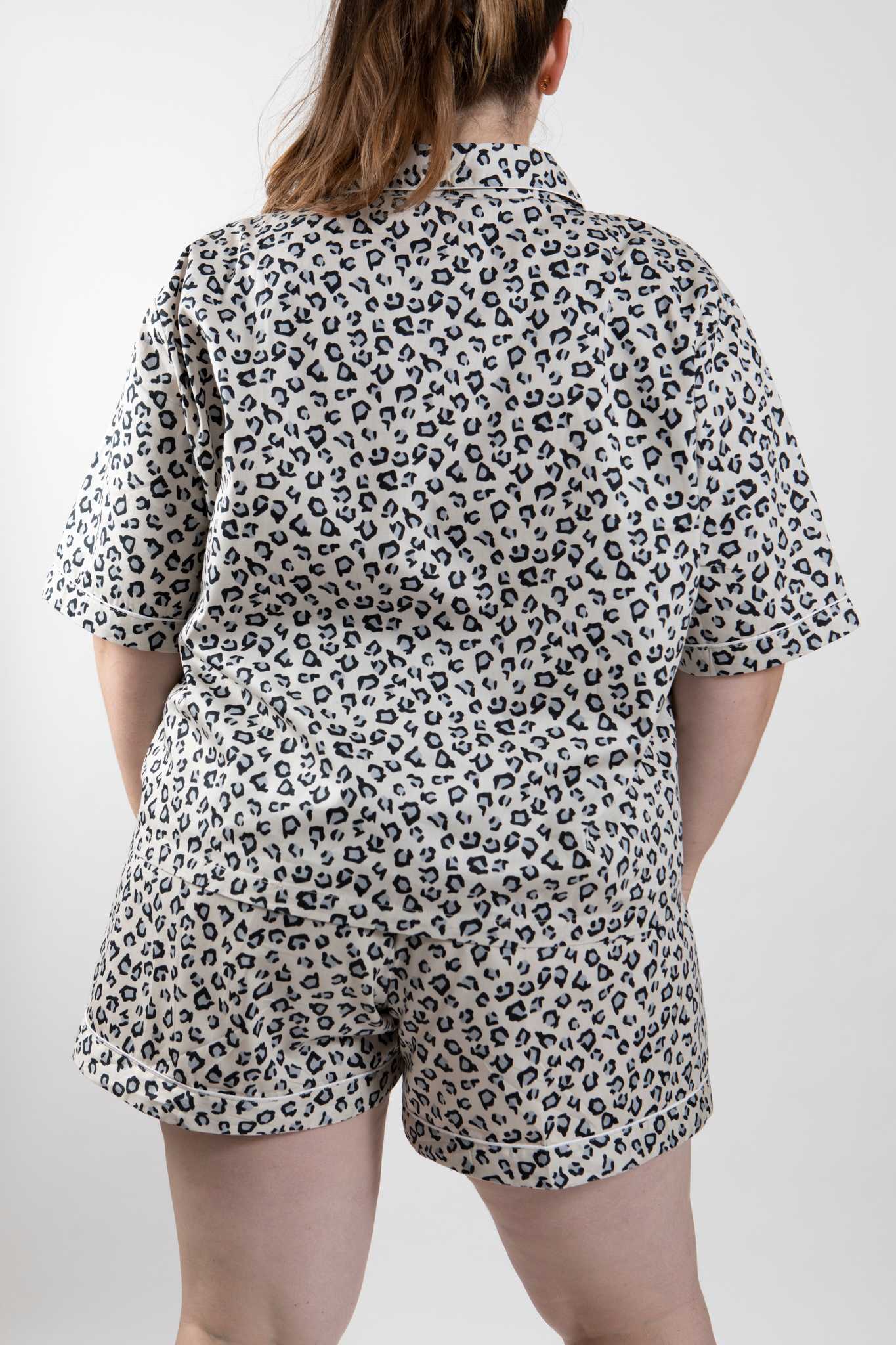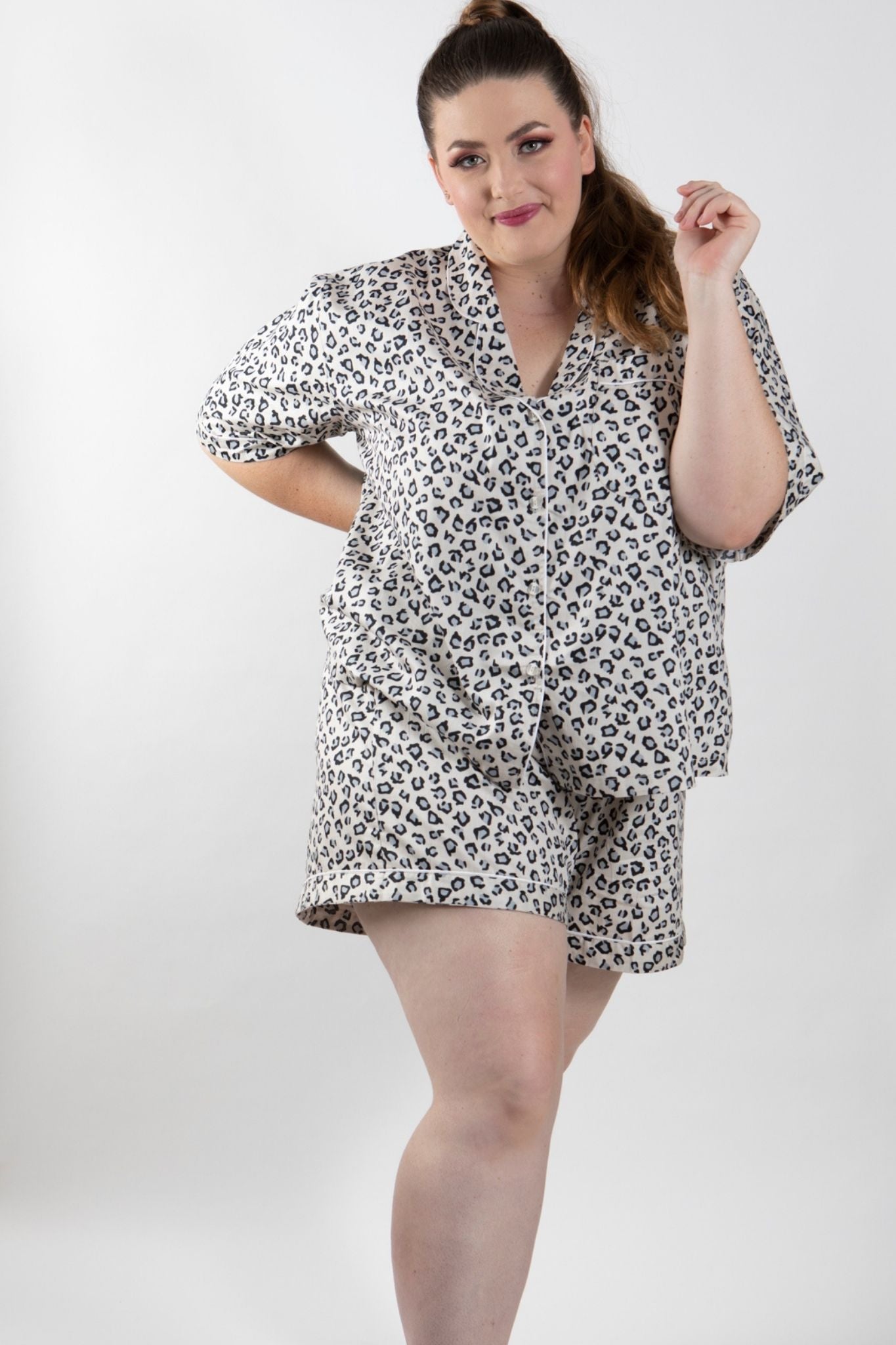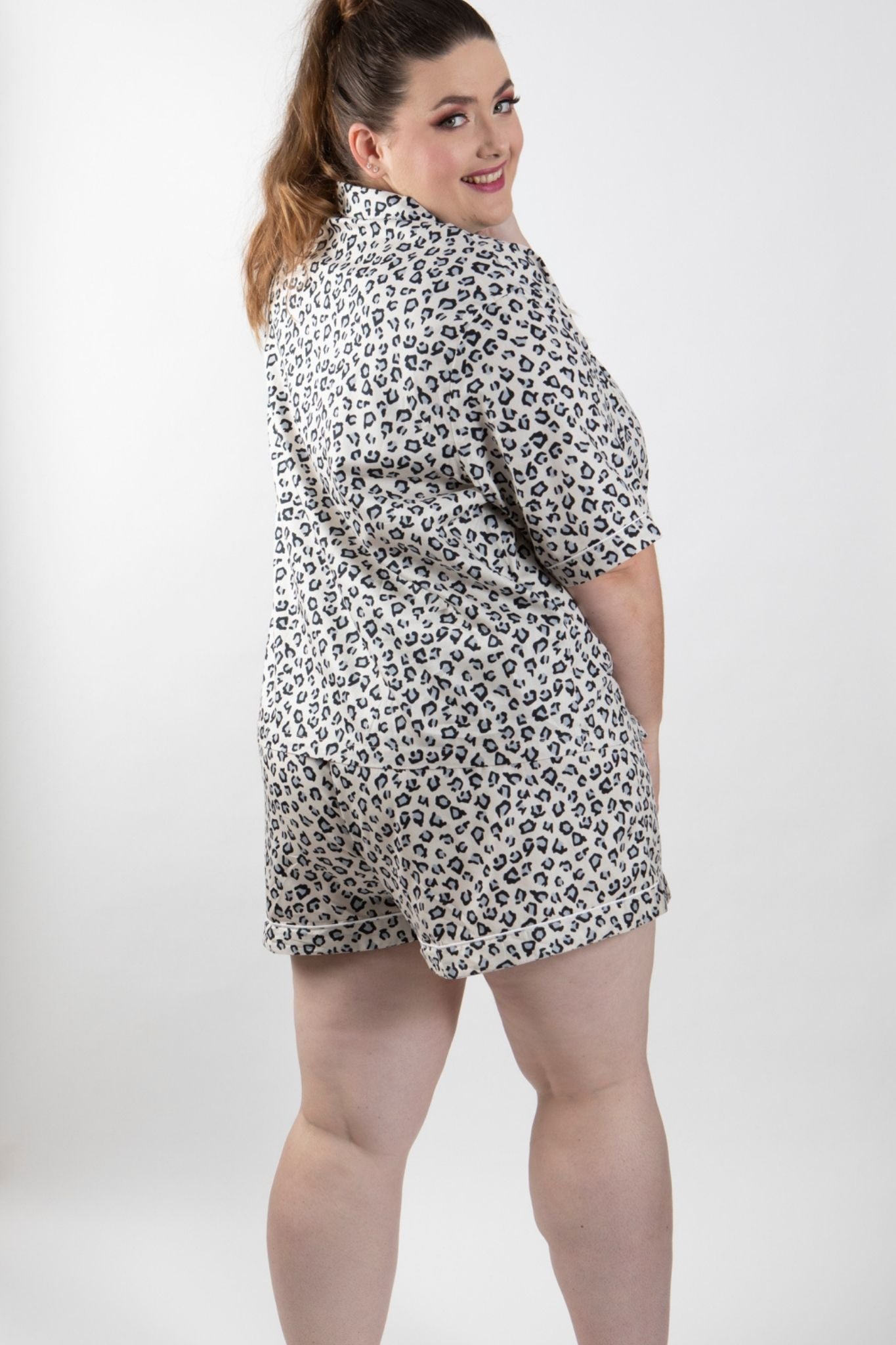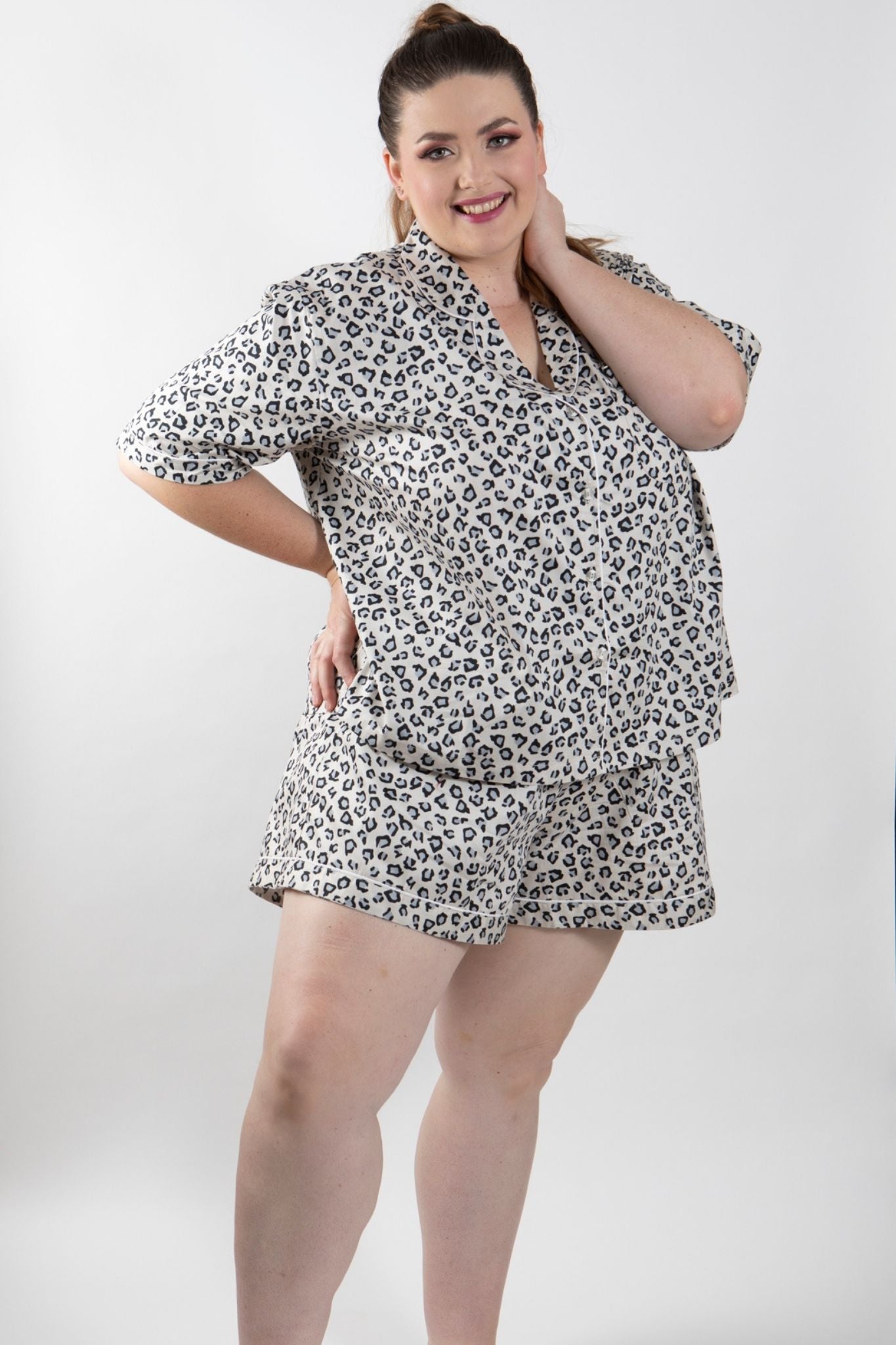 PLUS SIZE and ALL SIZES leopard print in grey/black/white pure cotton shortie pajamas. Traditional style top has piping on the collar, sleeves and patch pocket. Nothing beats cotton for summer sleepwear.