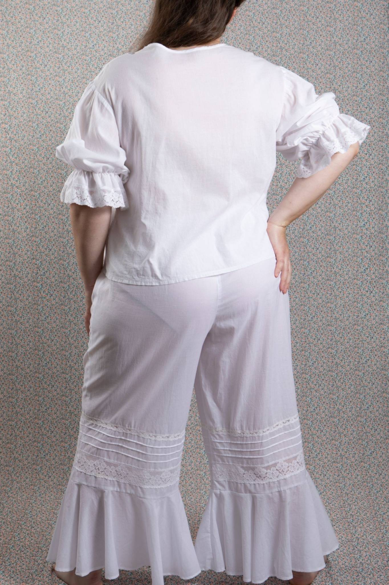 Pants have lace insertions and pintucks and a semi-circular flounce to add that slice of retro/vintage flair. They are elasticated at the waist.