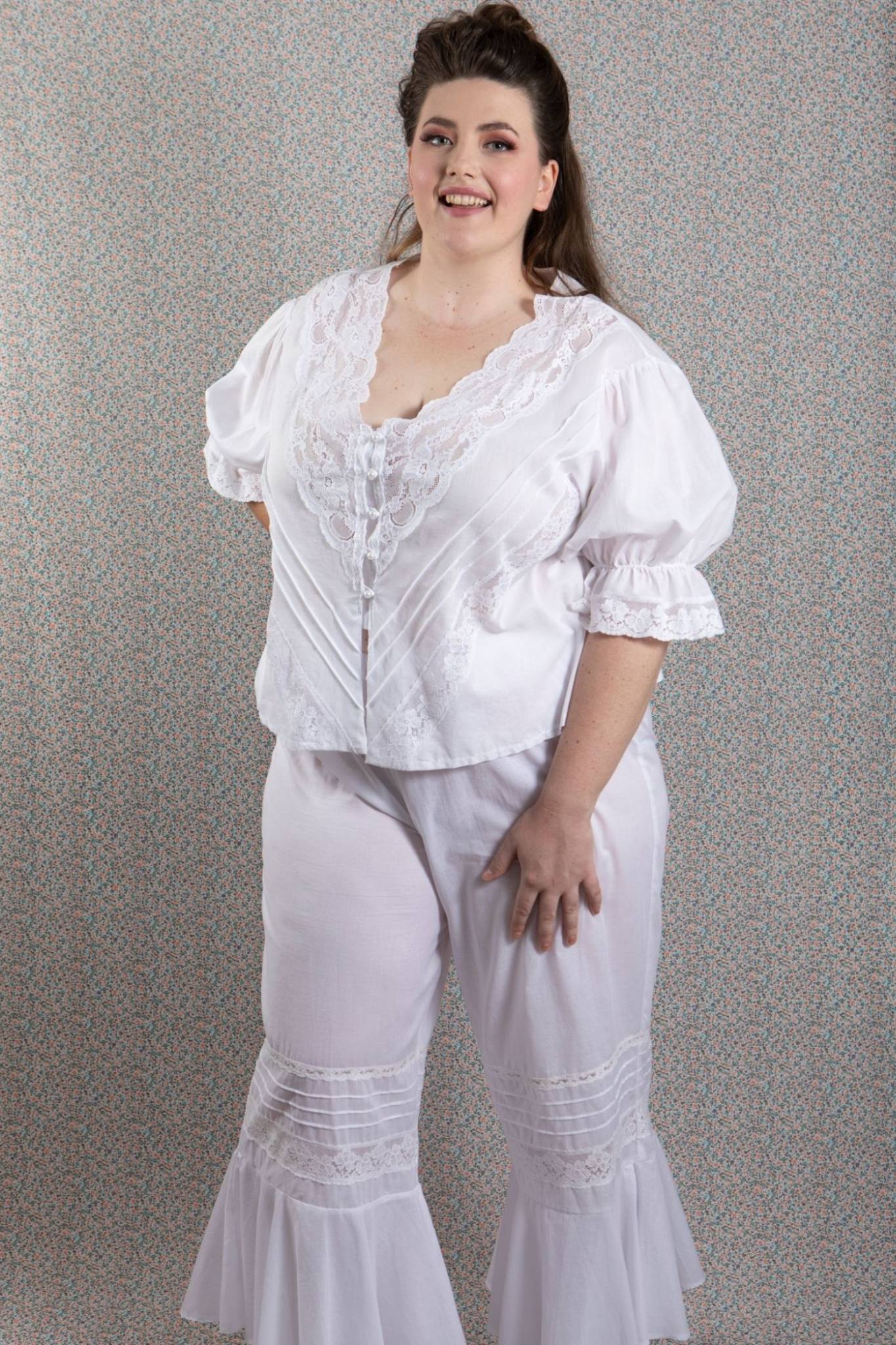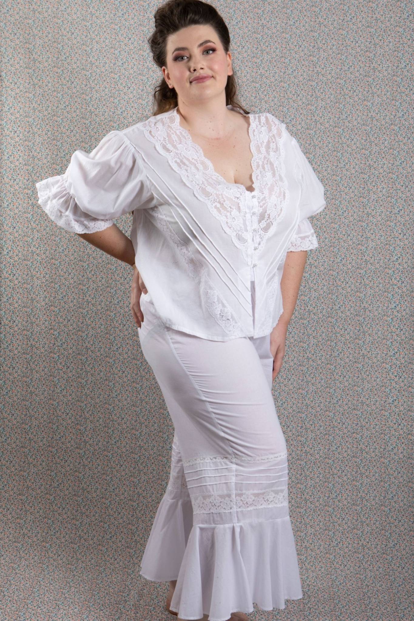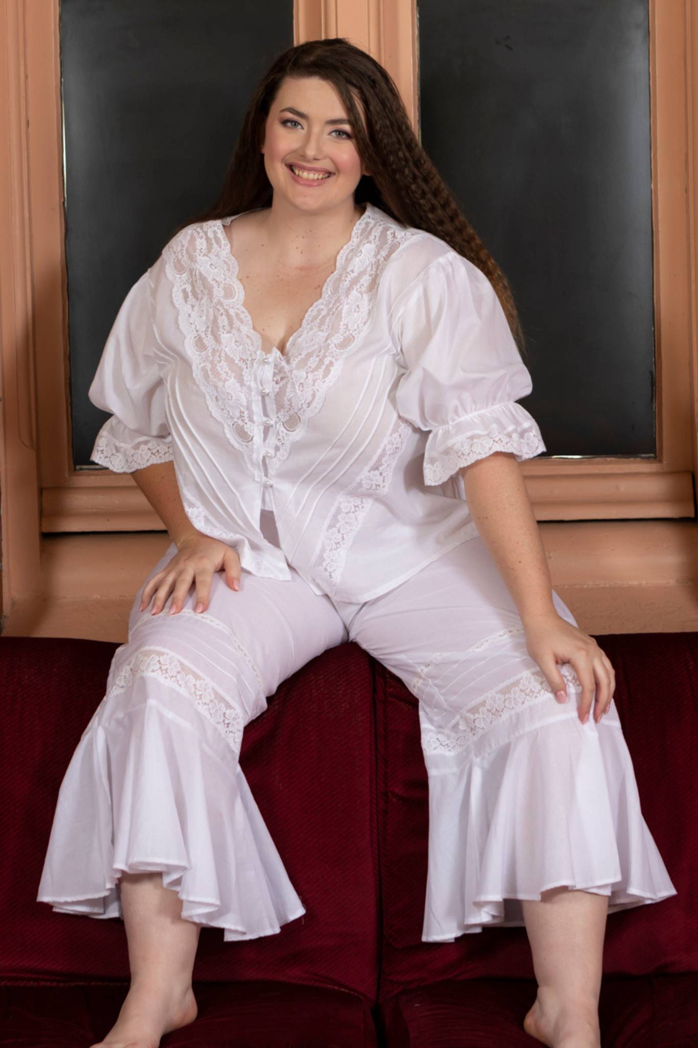 PLUS SIZE and ALL SIZES white cotton voile and French leavers lace top with matching pajama pants. Top has lace insertions and diagonal pintucks to mirror the wide delicate lace at the v-neck, and elasticated puff sleeves. It is finished with pearl buttons and loops at the front.