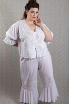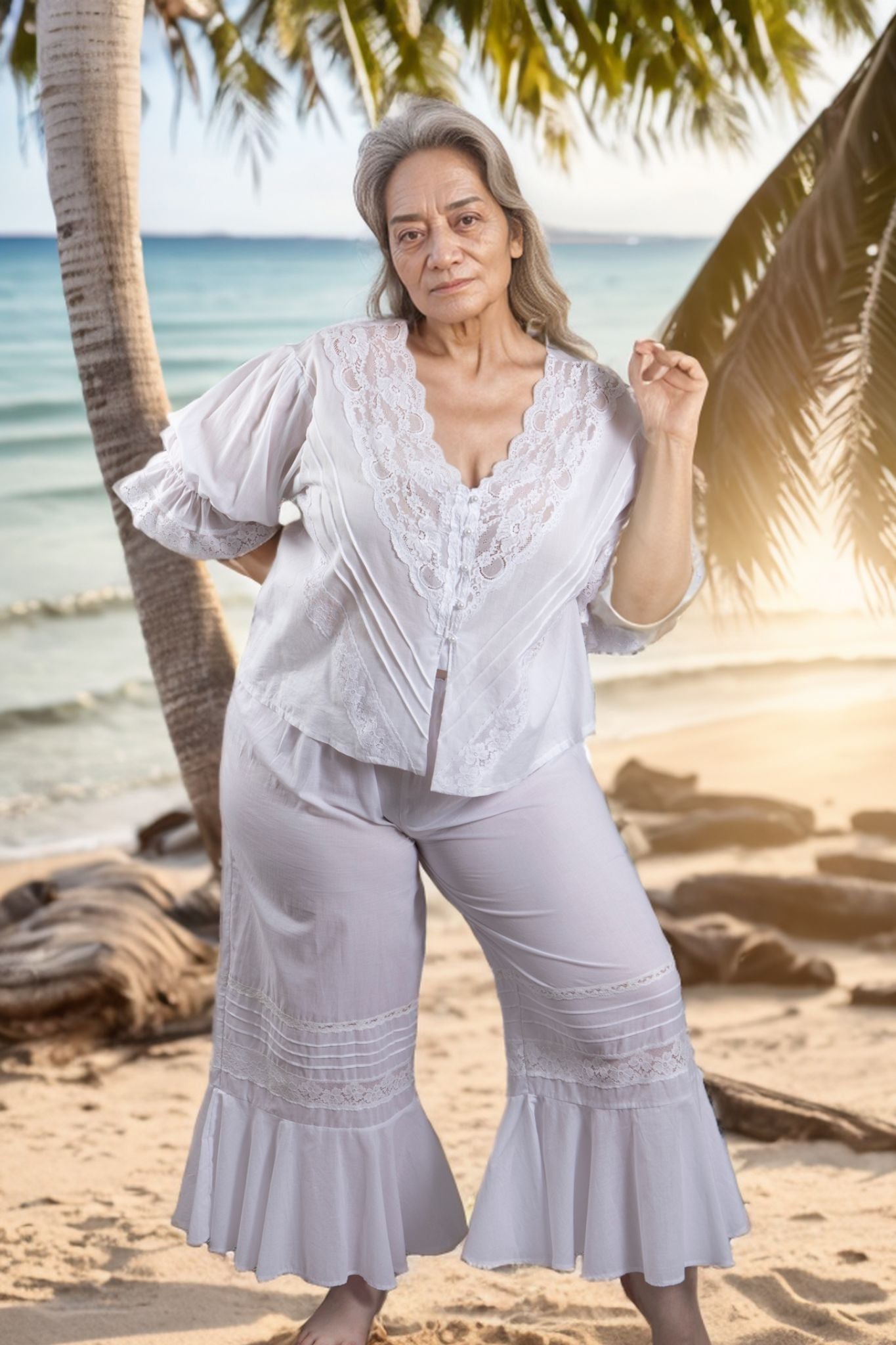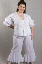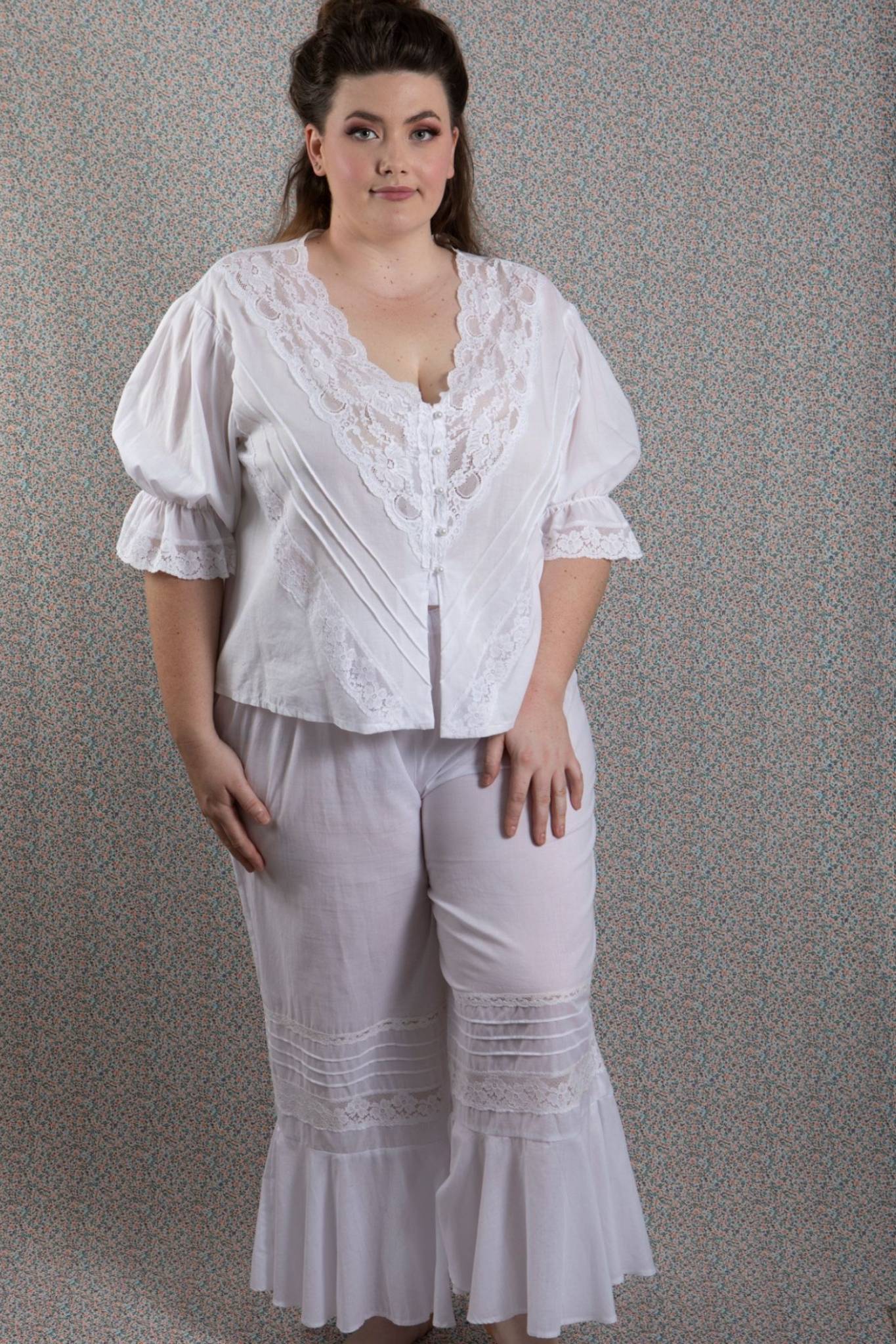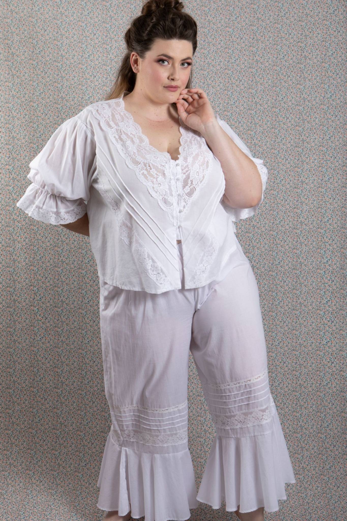 PLUS SIZE and ALL SIZES white cotton voile and French leavers lace top with matching pajama pants. Top has lace insertions and diagonal pintucks to mirror the wide delicate lace at the v-neck, and elasticated puff sleeves. It is finished with pearl buttons and loops at the front.