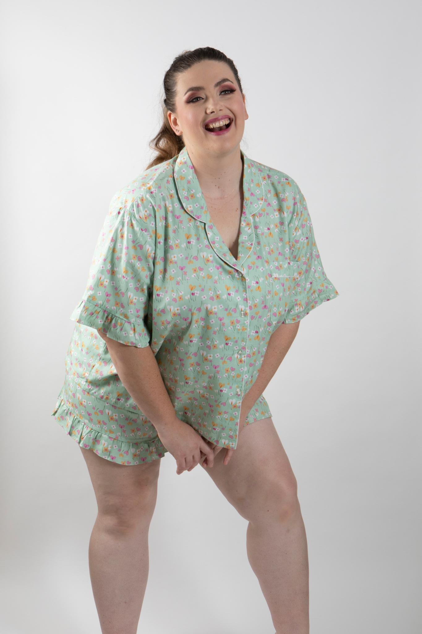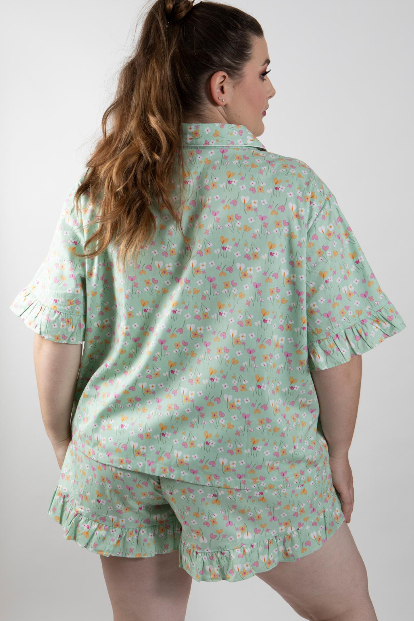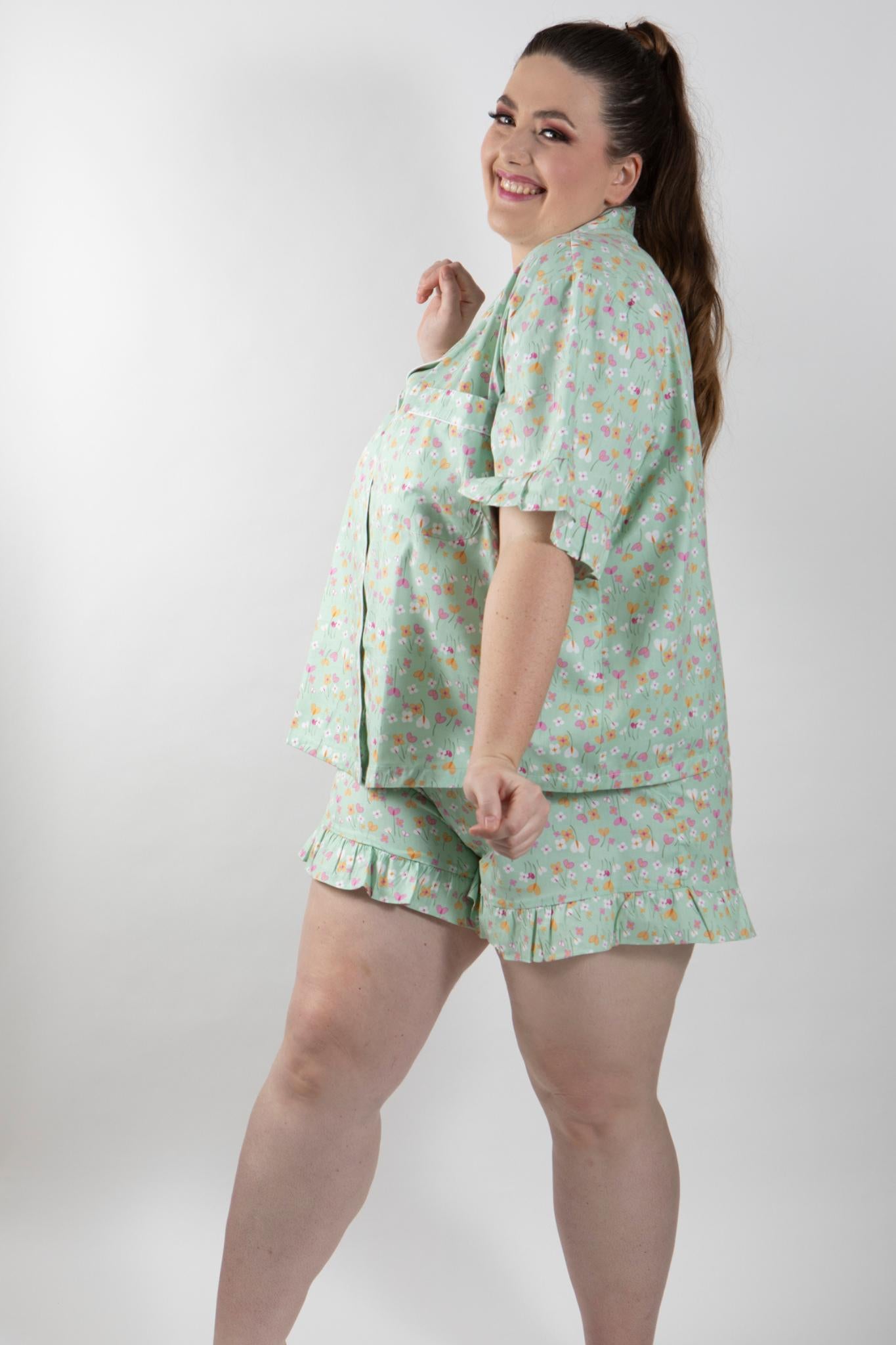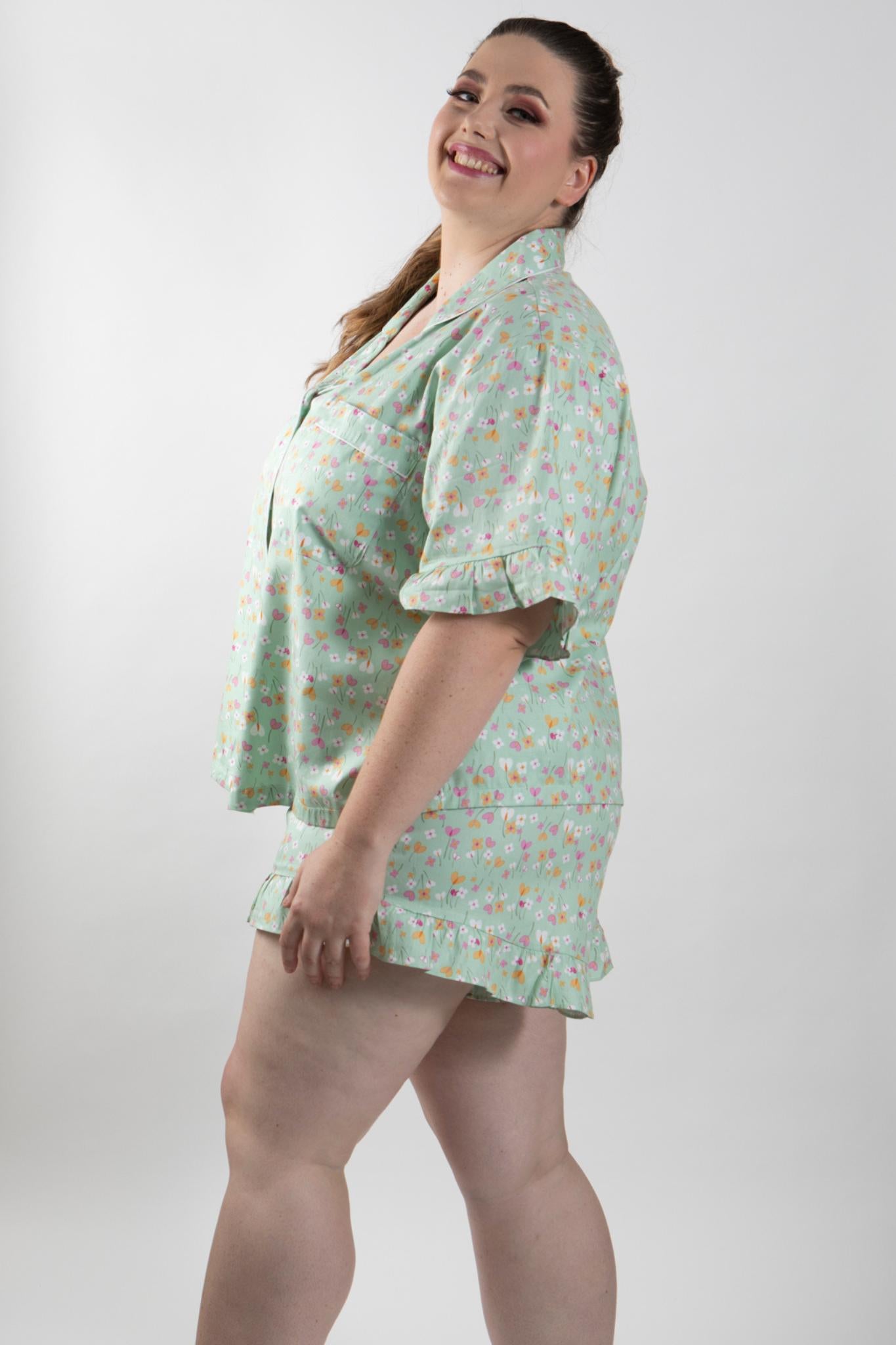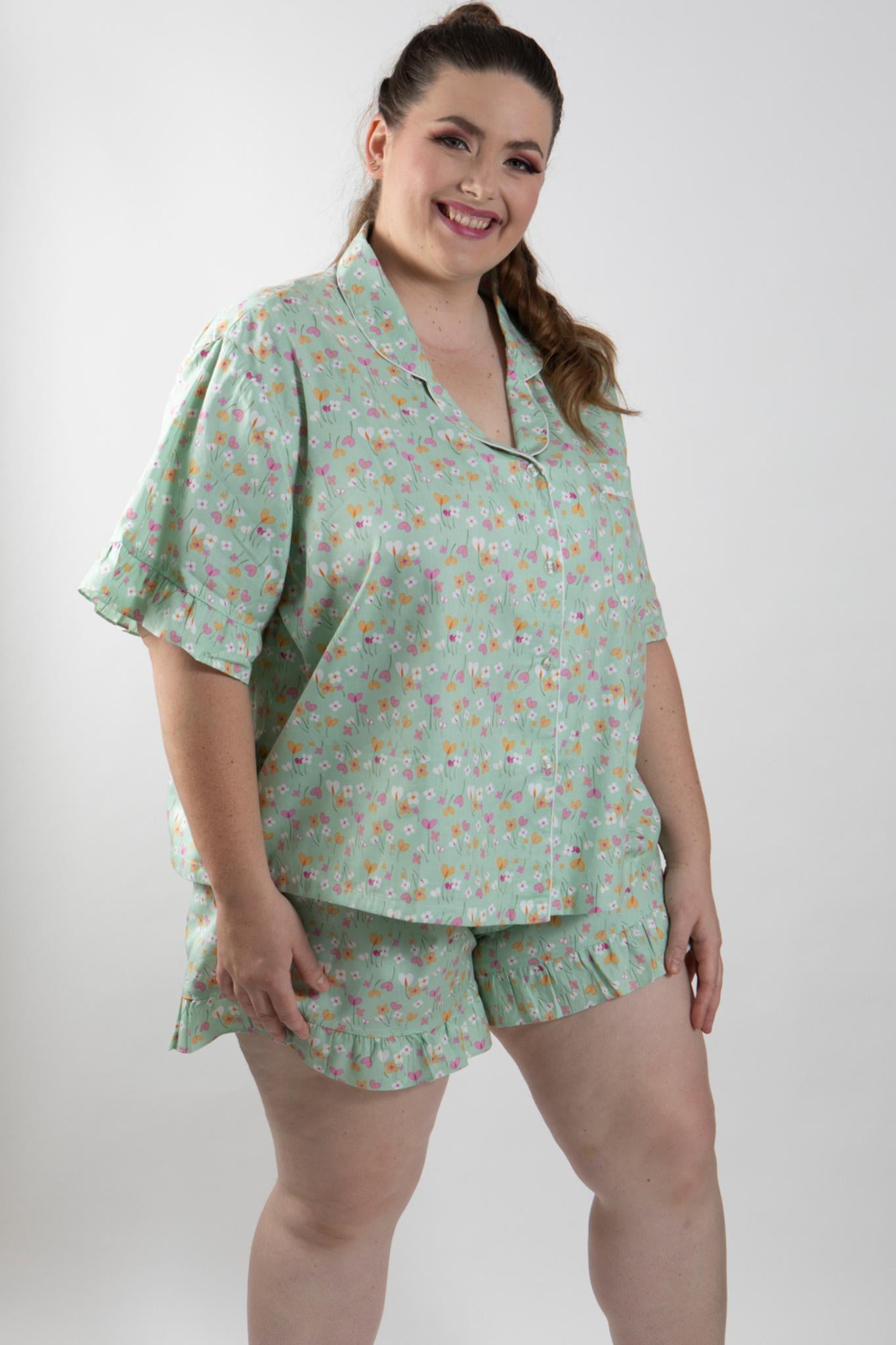 PLUS SIZE and ALL SIZES apple green print beautiful quality pure cotton shortie pajamas. Traditional style top has piping on the collar, and patch pocket. A flirty feminine touch is the frill on the sleeve edge. Loose fitting and comfortable for hot summer nights in cool cotton.