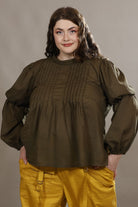 Pure cotton voile shirt features pintucks and a high rolled neckline, and side splits at the hipline.
