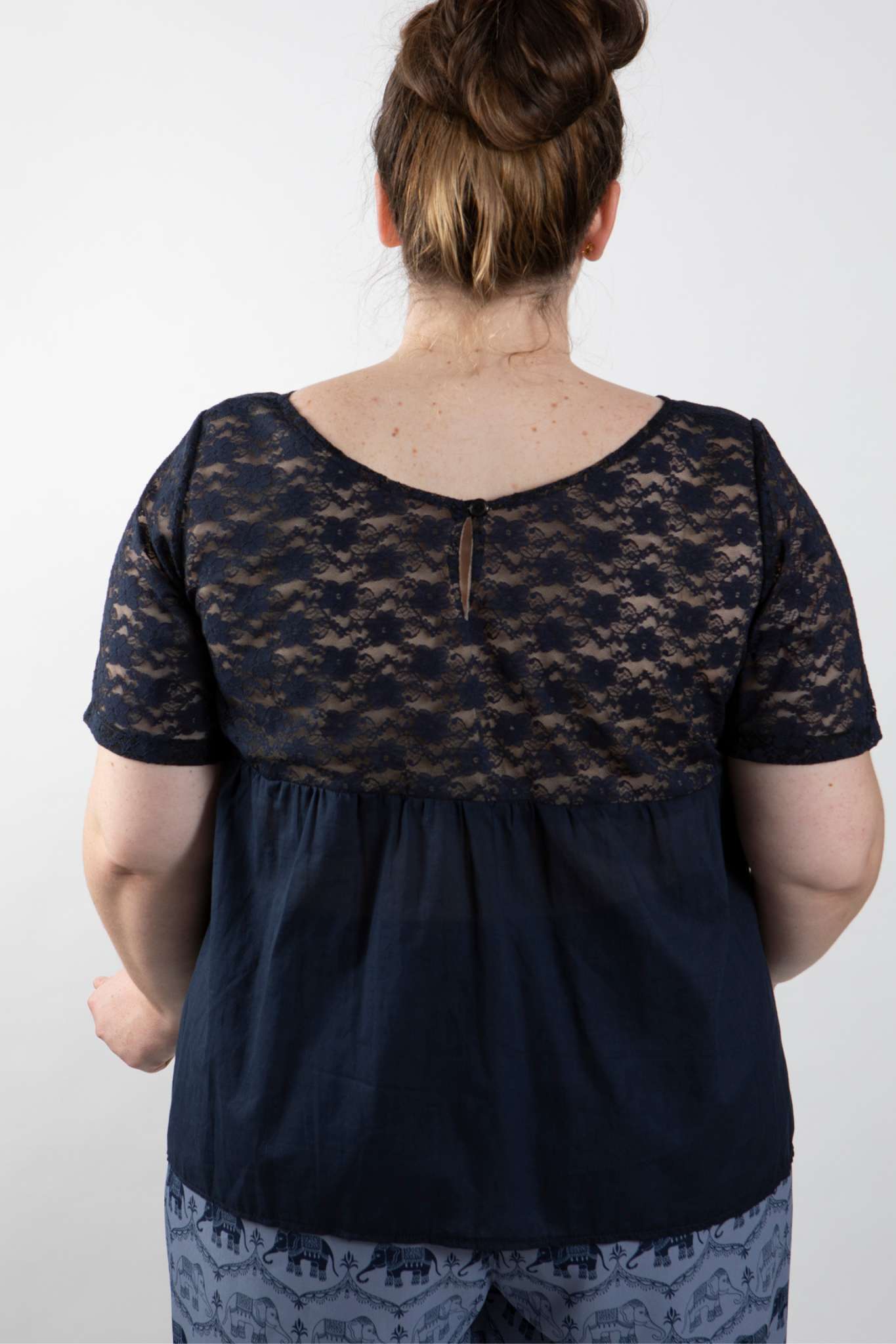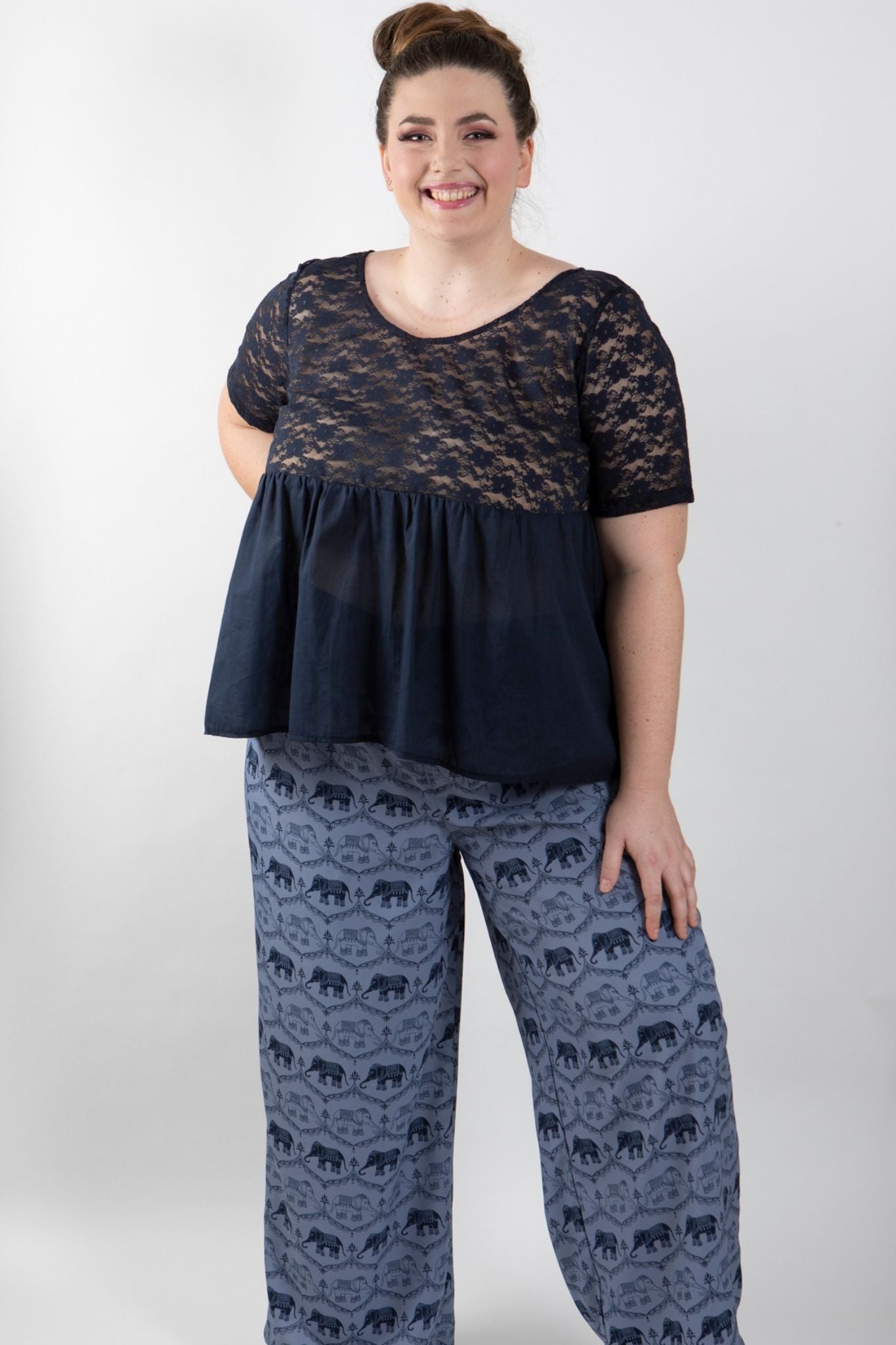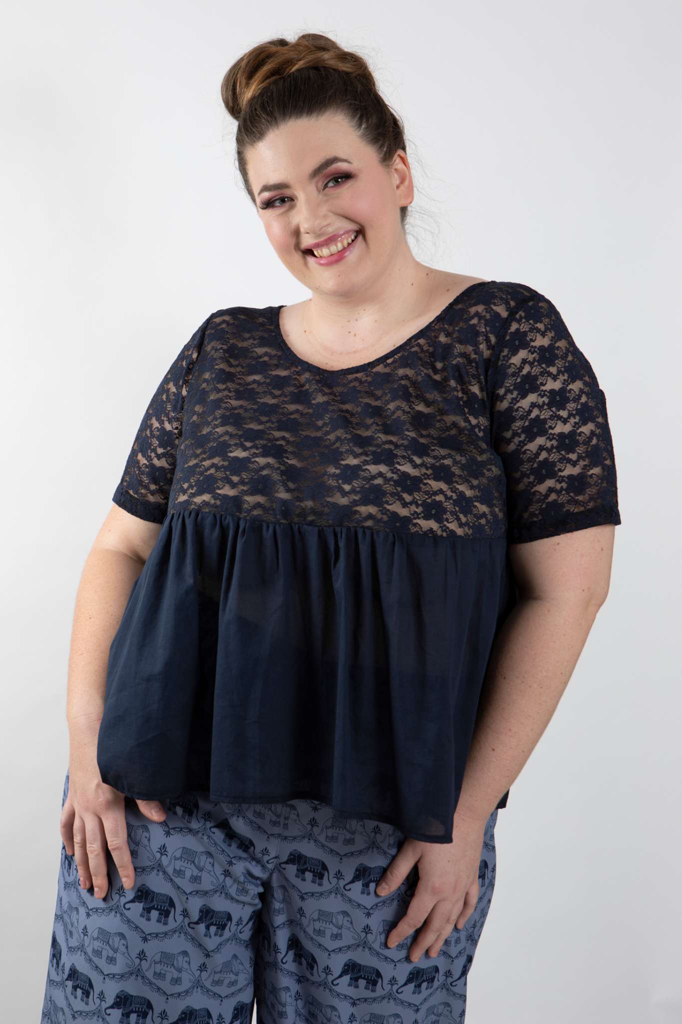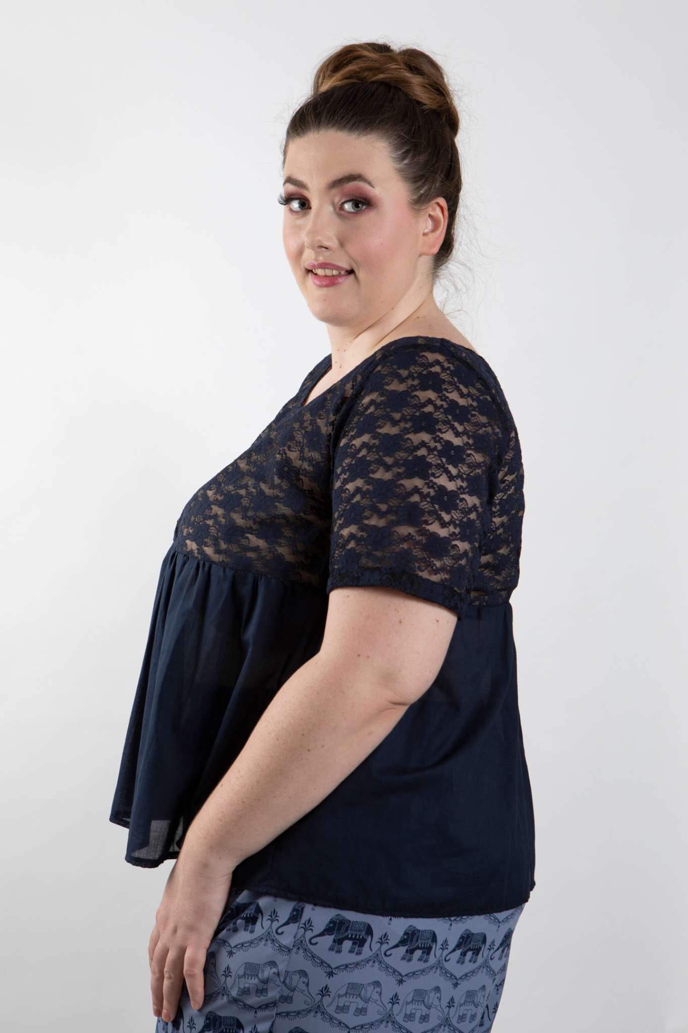 PLUS SIZE and ALL SIZES navy lace and cotton top in stretch lace with a nude stretch mesh lining, and navy cotton frill gathered at the bust. Sleeves are just above the elbow and it has button and loop closing at the back. A very comfortable top to wear for lounging on that welcome holiday break.