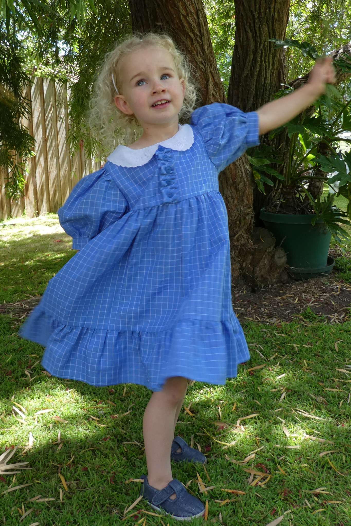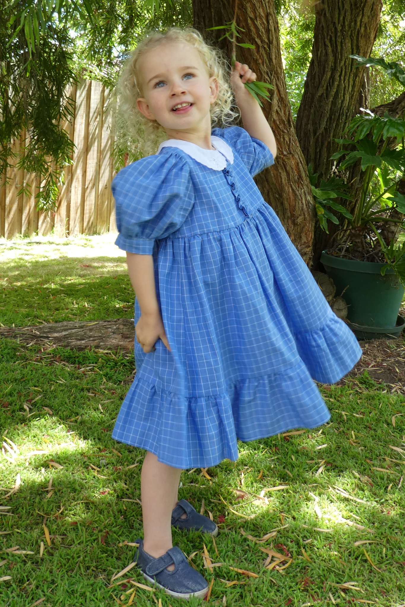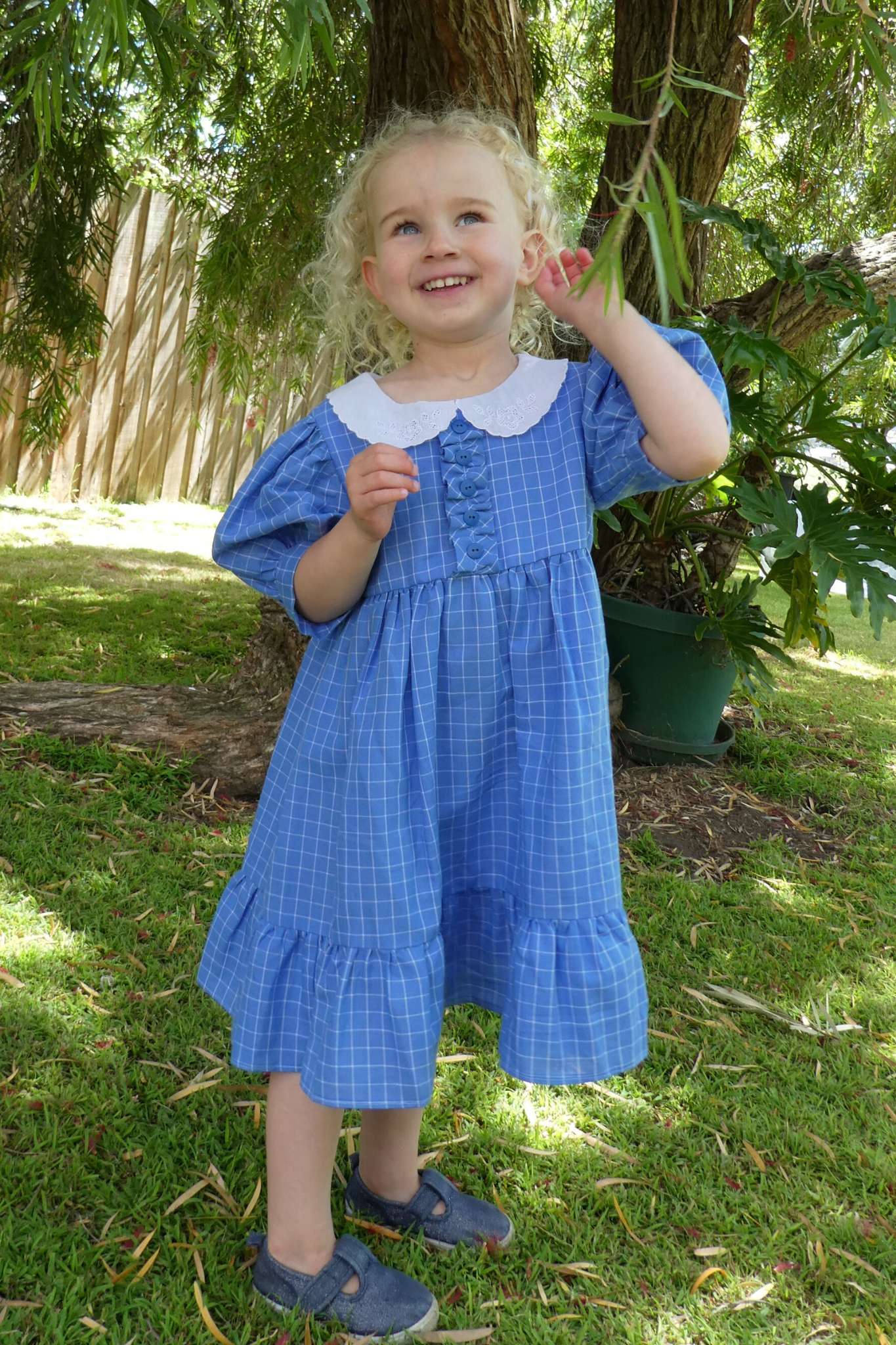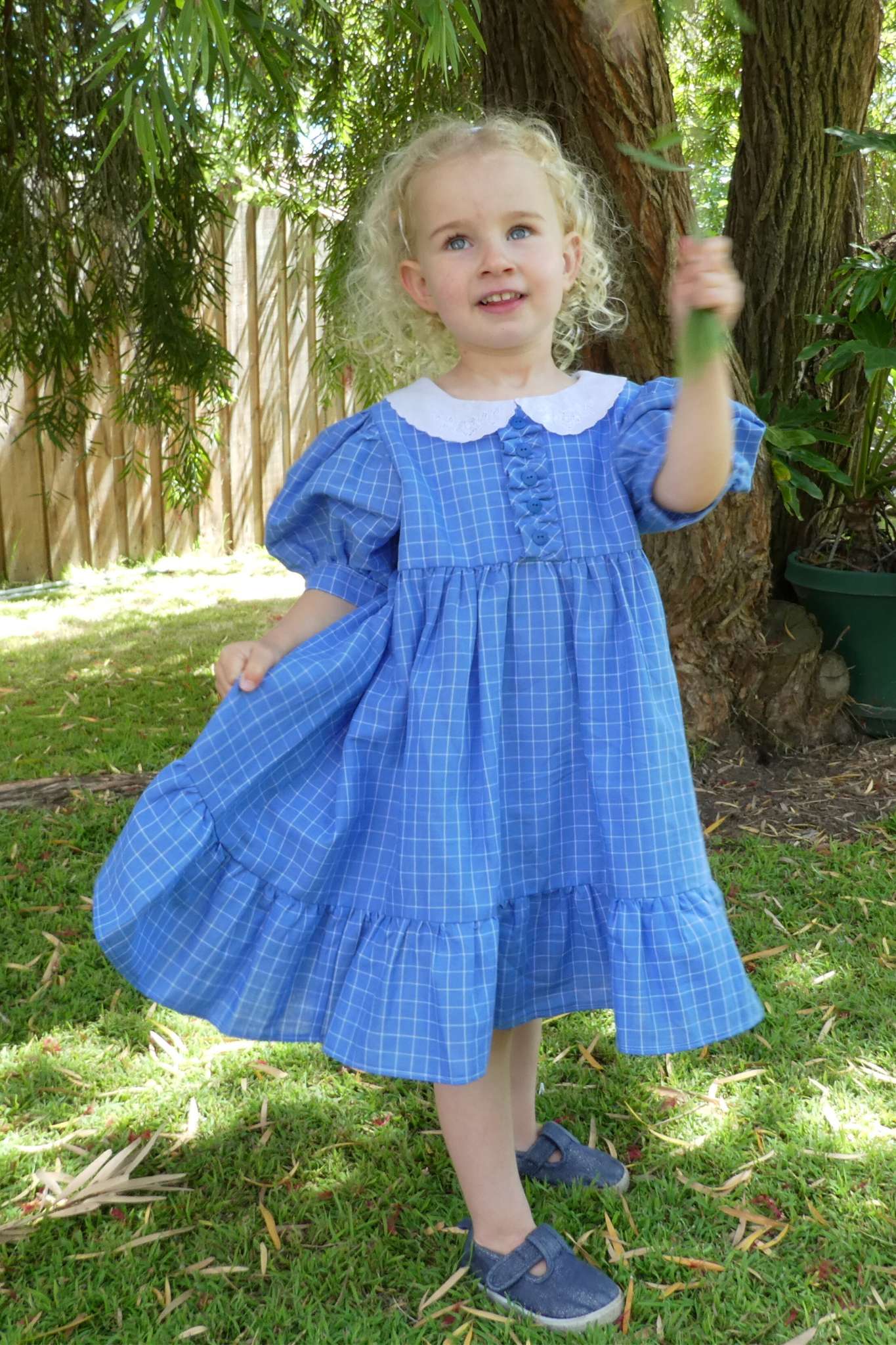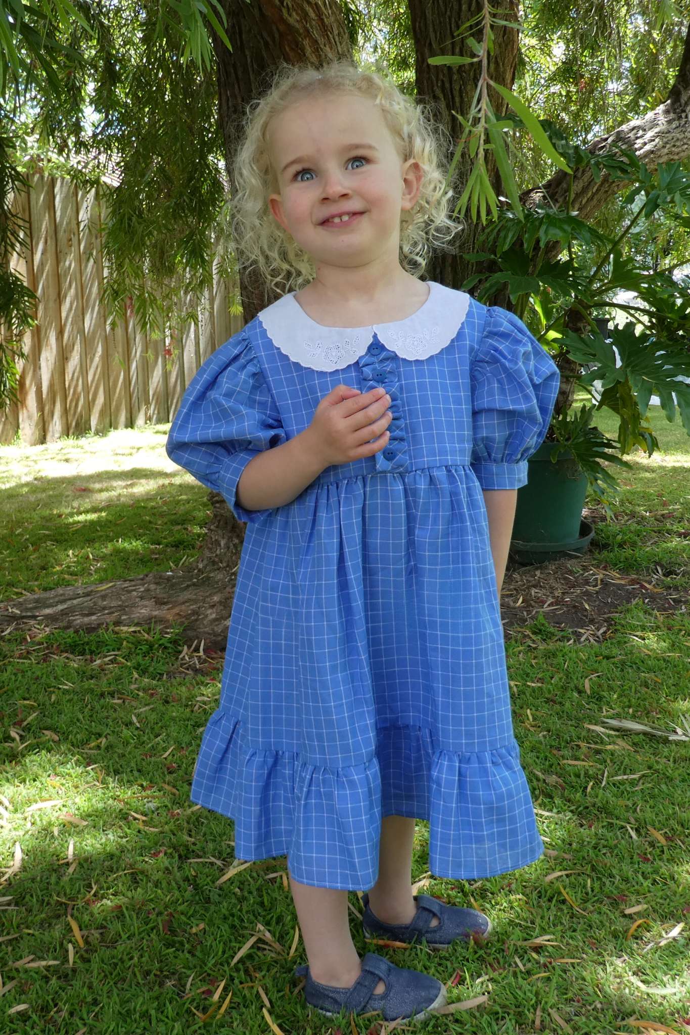 The finishing touches are a white broderie anglaise collar and frilled hemline..