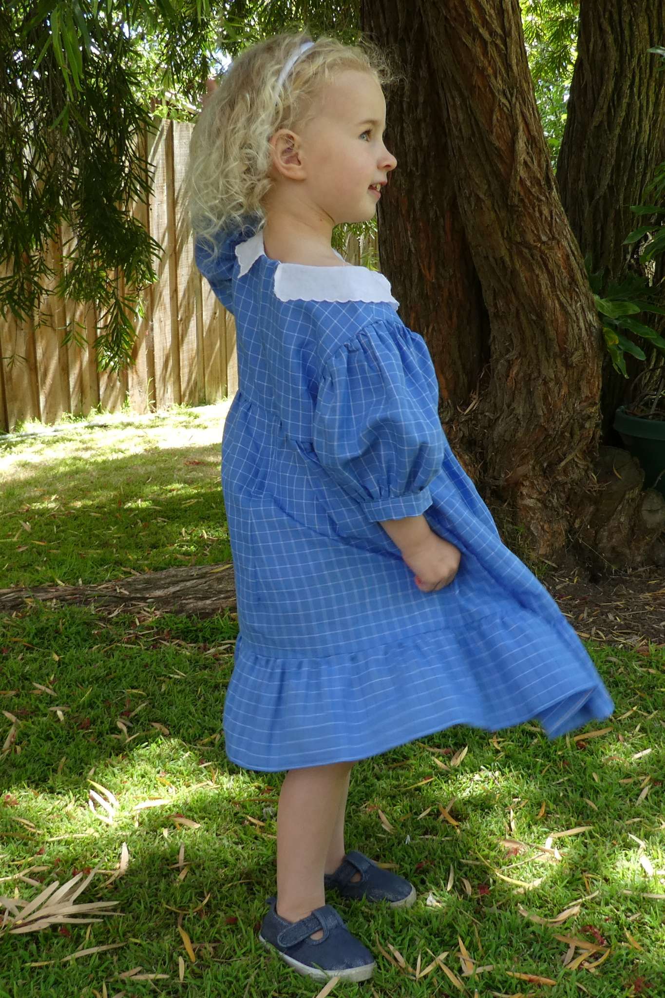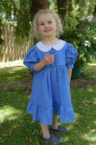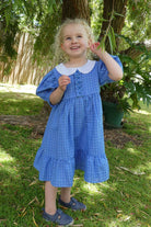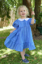 A very pretty vintage style dress in periwinkle blue with a white check pattern. The fabric is ramie linen blend. Available in size 2 - 8 years.