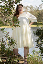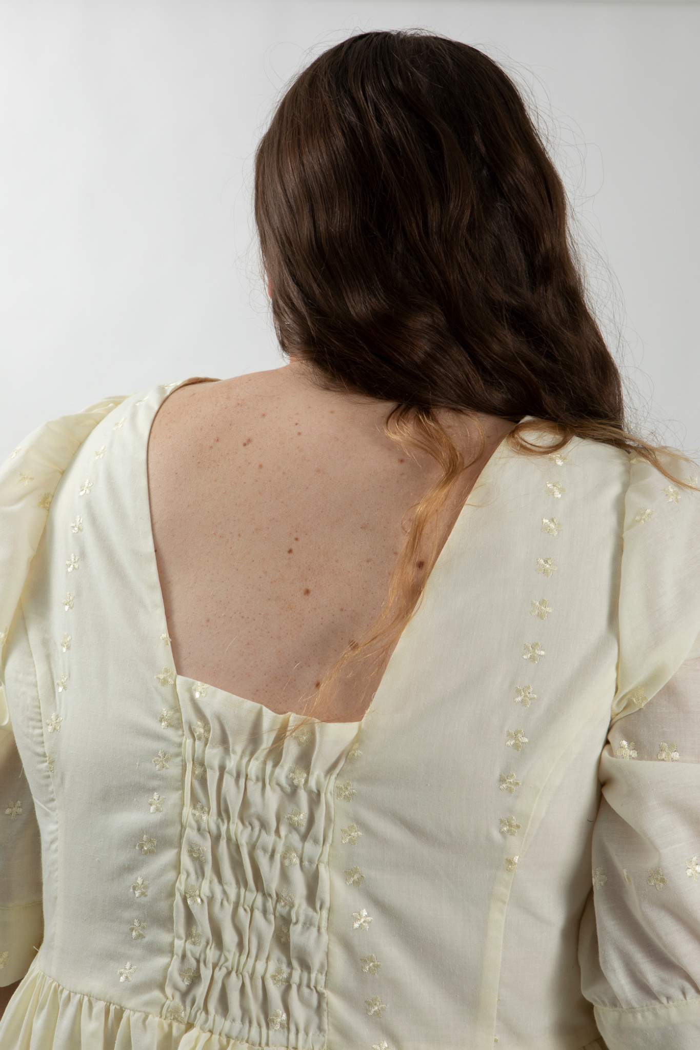 Dress is lined in cream cotton voile, has a rounded neckline with pintuck detail on the princess seamed bodice, and is gathered at the waist.