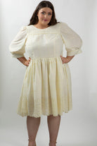 PLUS SIZE and ALL SIZES pale lemon poly/cotton broderie anglaise waisted smock style knee length dress with embroidered border.