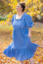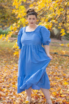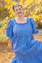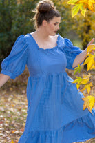 PLUS SIZE and ALL SIZES ramie linen blend smock style midi dress in gorgeous periwinkle blue colour overlaid with a white check pattern.