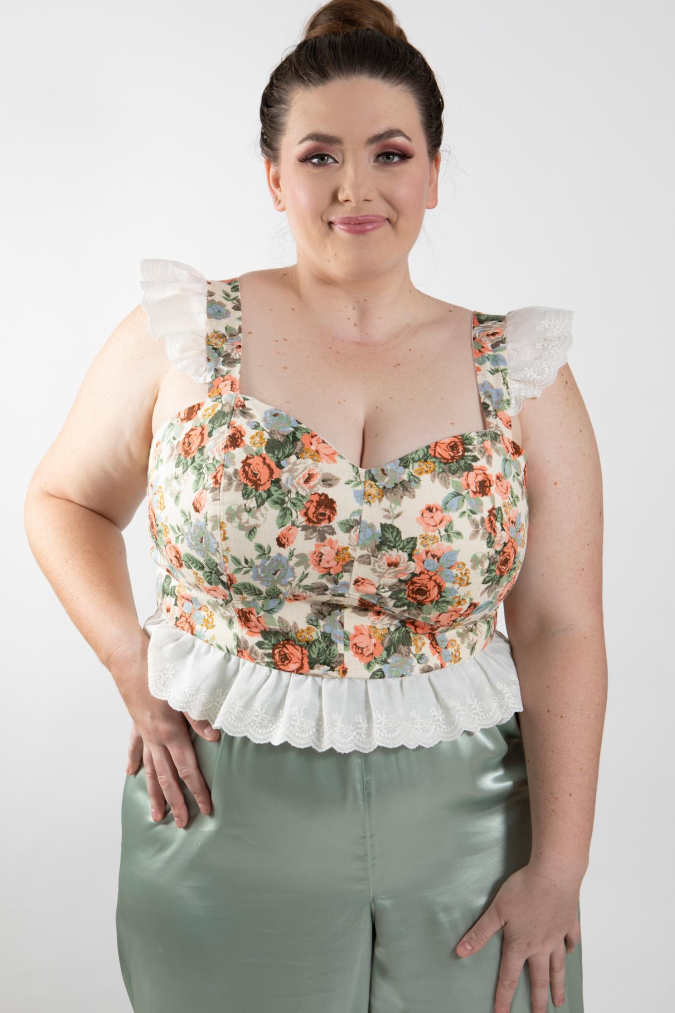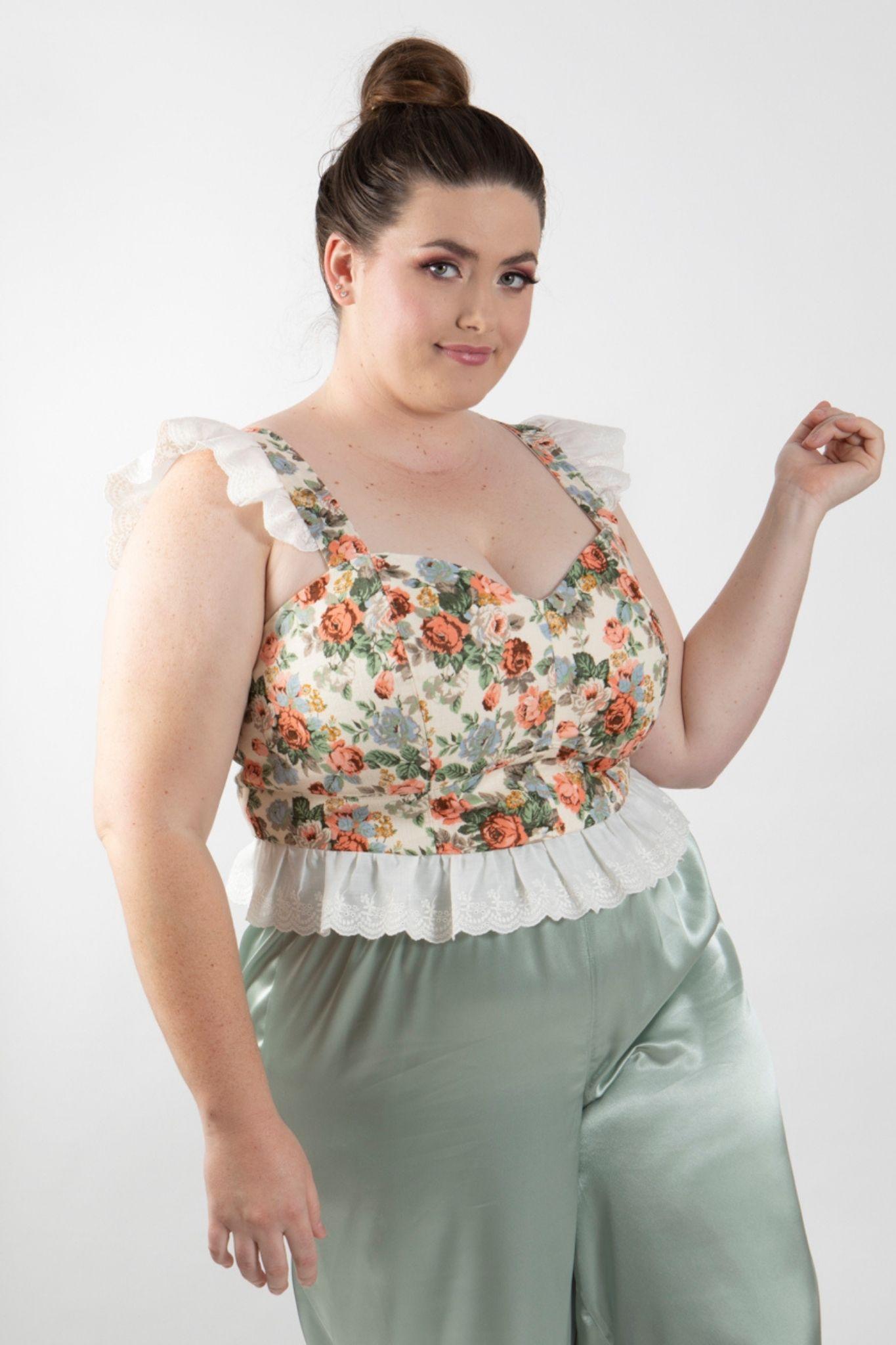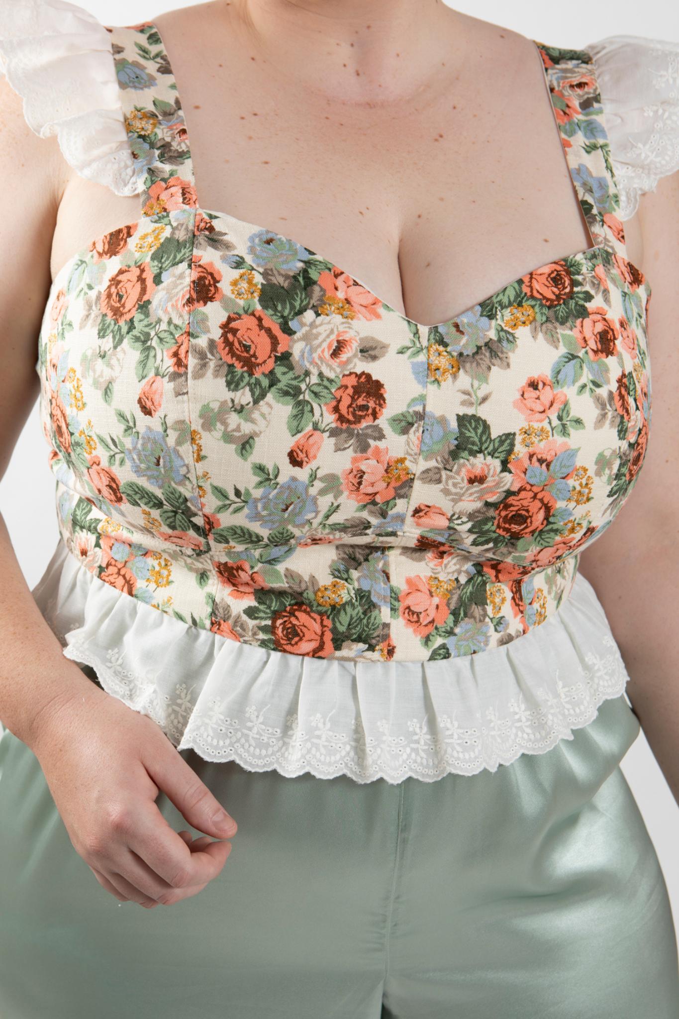 PLUS SIZE and ALL SIZES bralette/crop top in vintage linen/cotton fabric in pretty floral pattern of apricot/sage/olive green on a cream background.