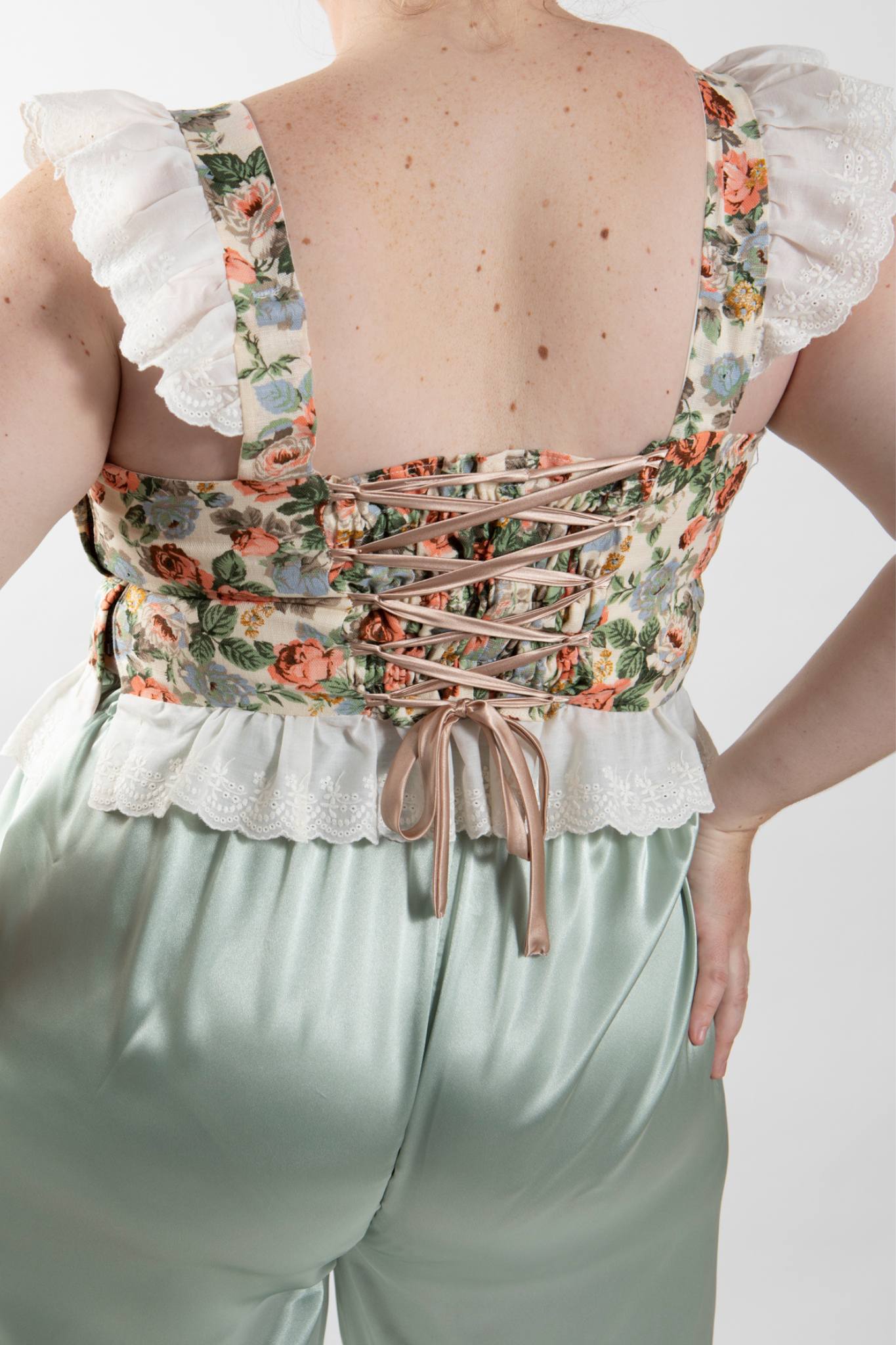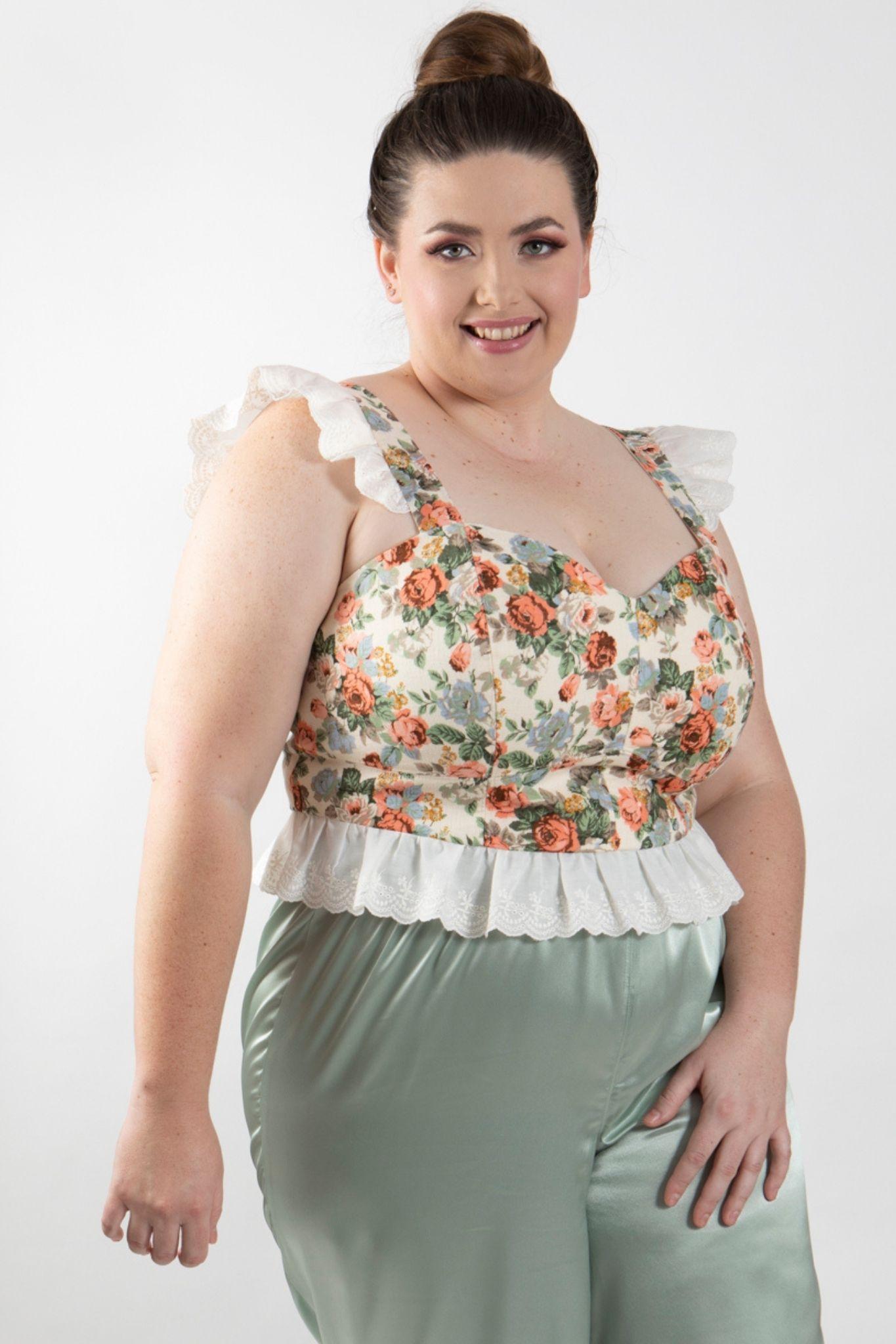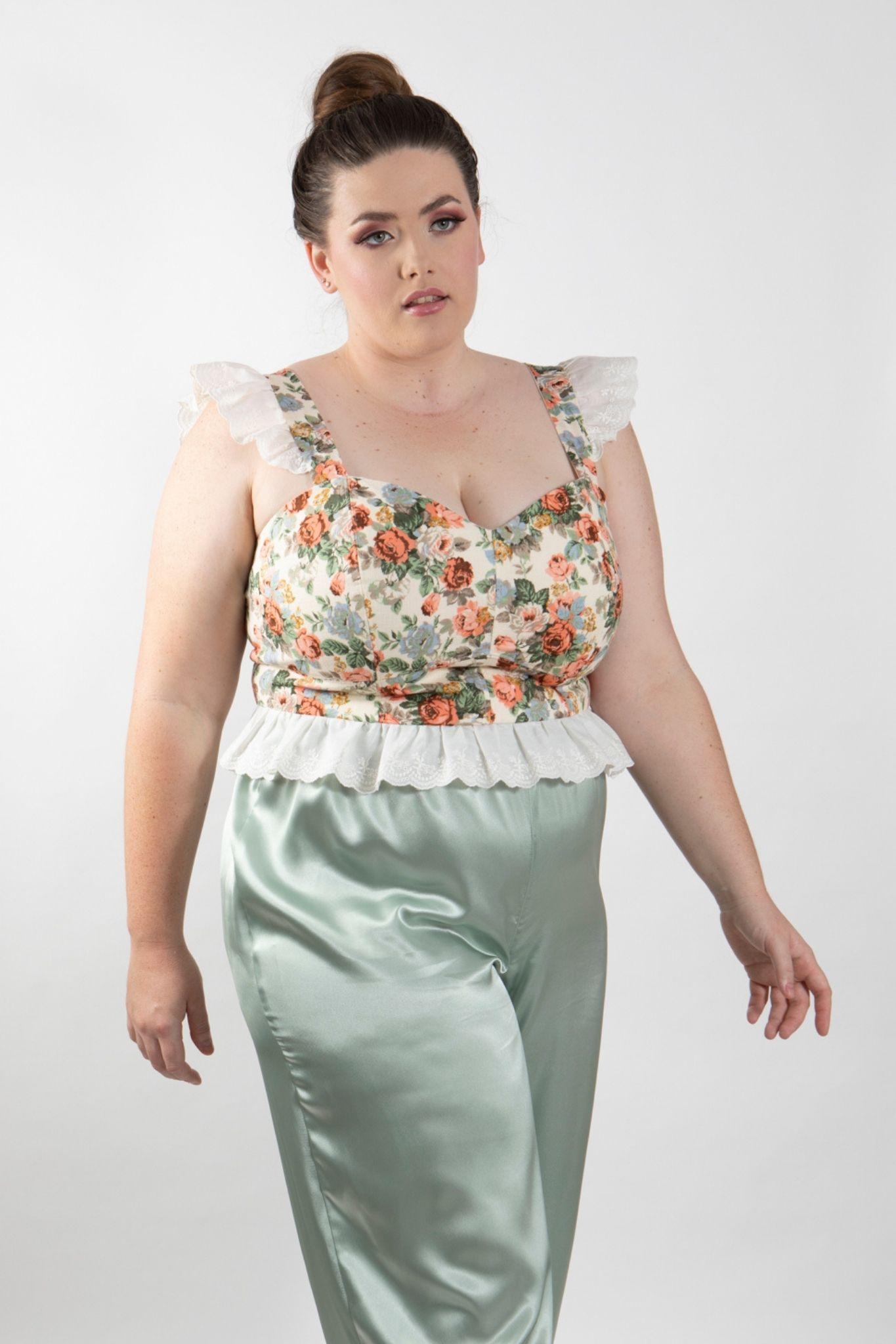 PLUS SIZE and ALL SIZES bralette/crop top in vintage linen/cotton fabric in pretty floral pattern of apricot/sage/olive green on a cream background.