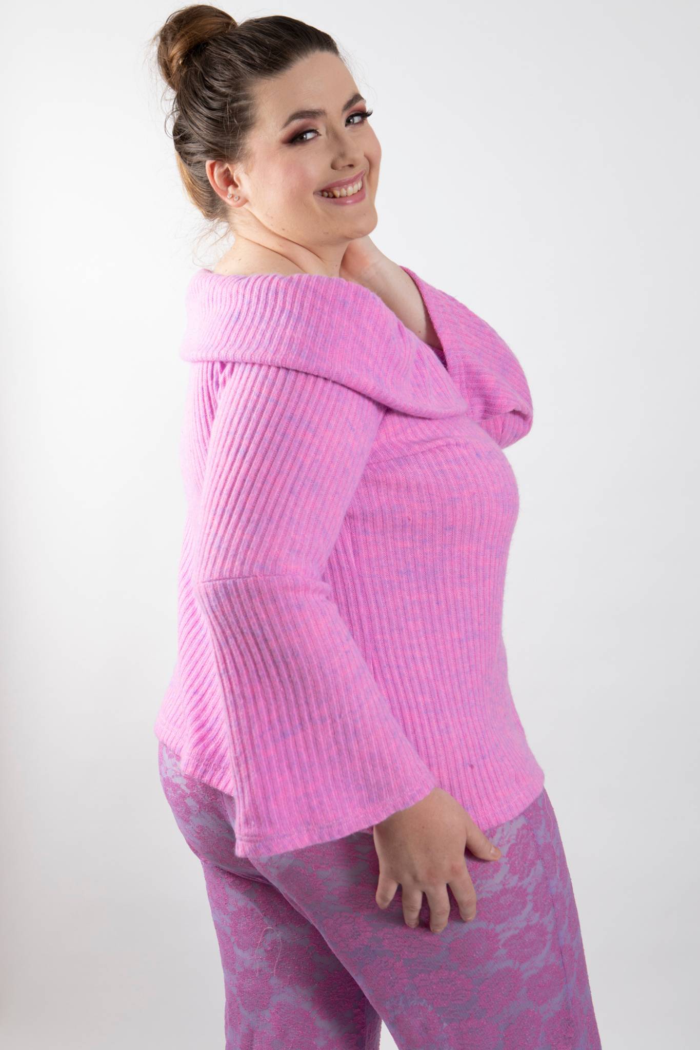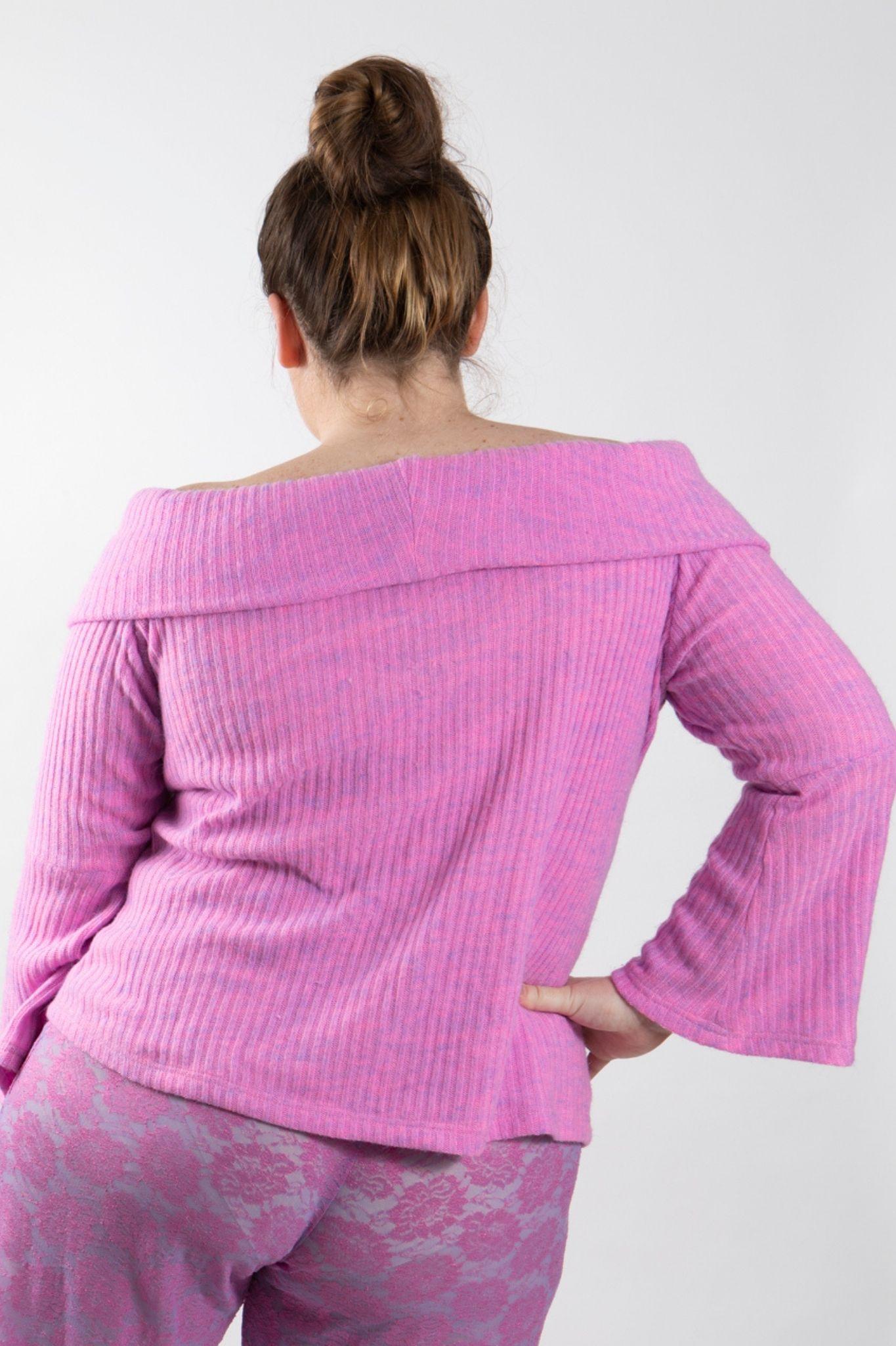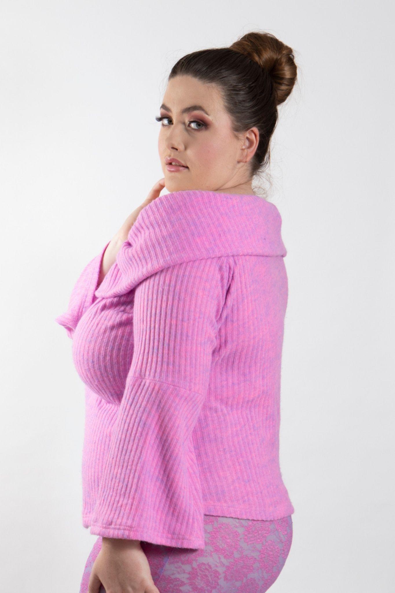 PLUS SIZE and ALL SIZES soft, cosy and warm stretch cashmillon (faux cashmere) bardot-style off the shoulder jumper in lilac-pink tonings. Teams perfectly with stretch lace LILAC TIME pants.