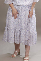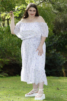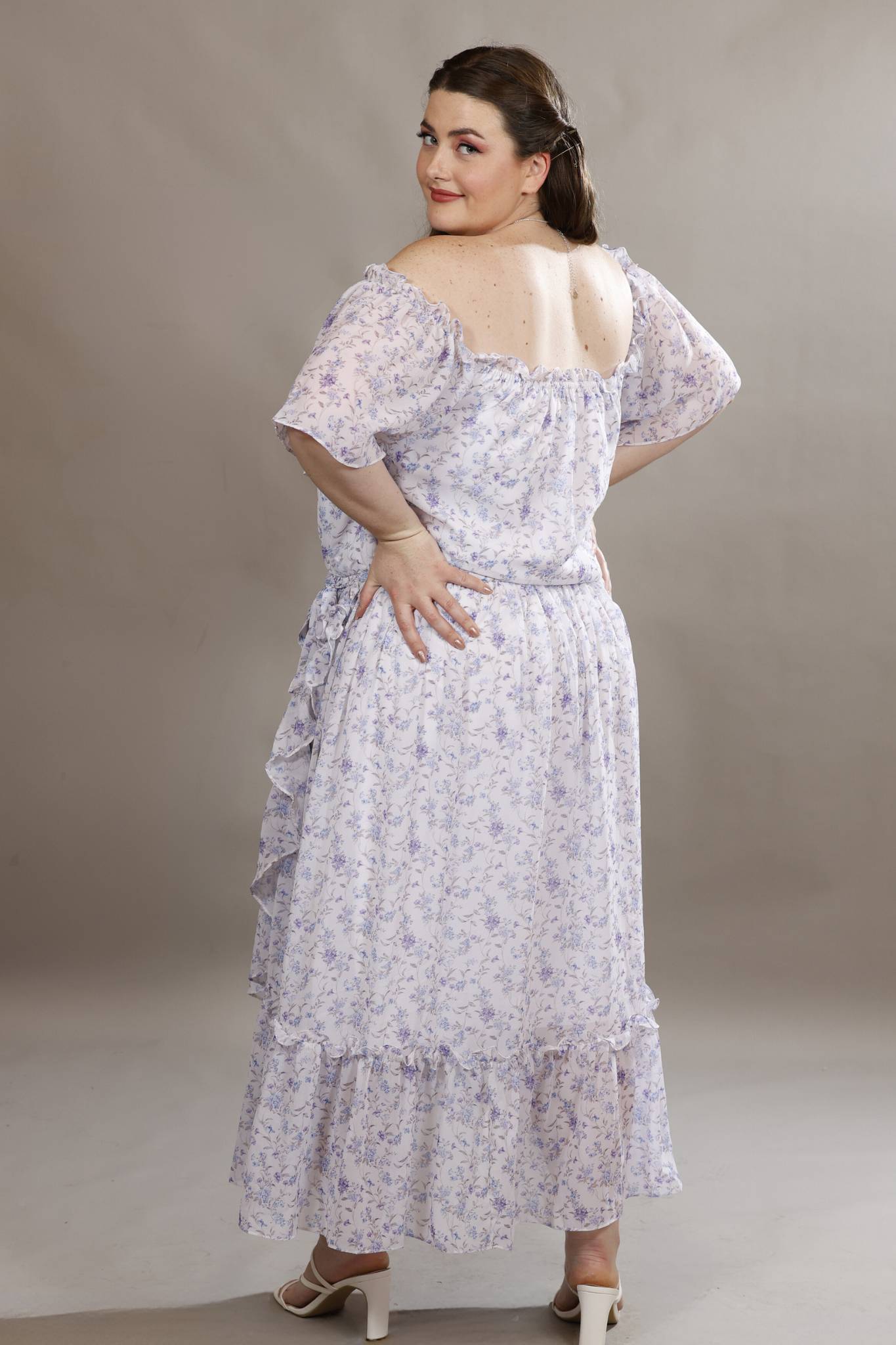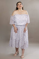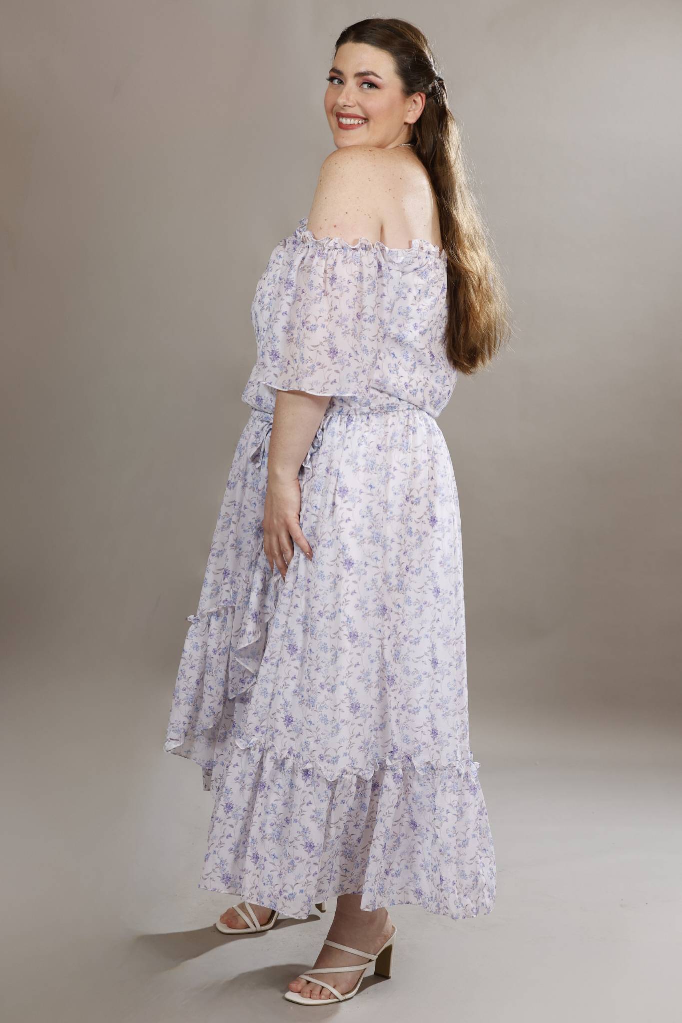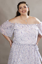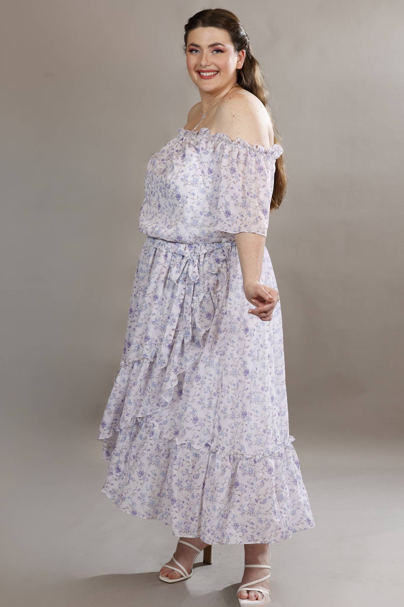 Pretty polyester chiffon dress in lavender flower print on white. It is a very easy to wear pull on style with elasticated neckline and off the shoulder sleeves. The waist is also elasticated and finished with a self fabric belt. The sleeves can be worn on or off the shoulders.