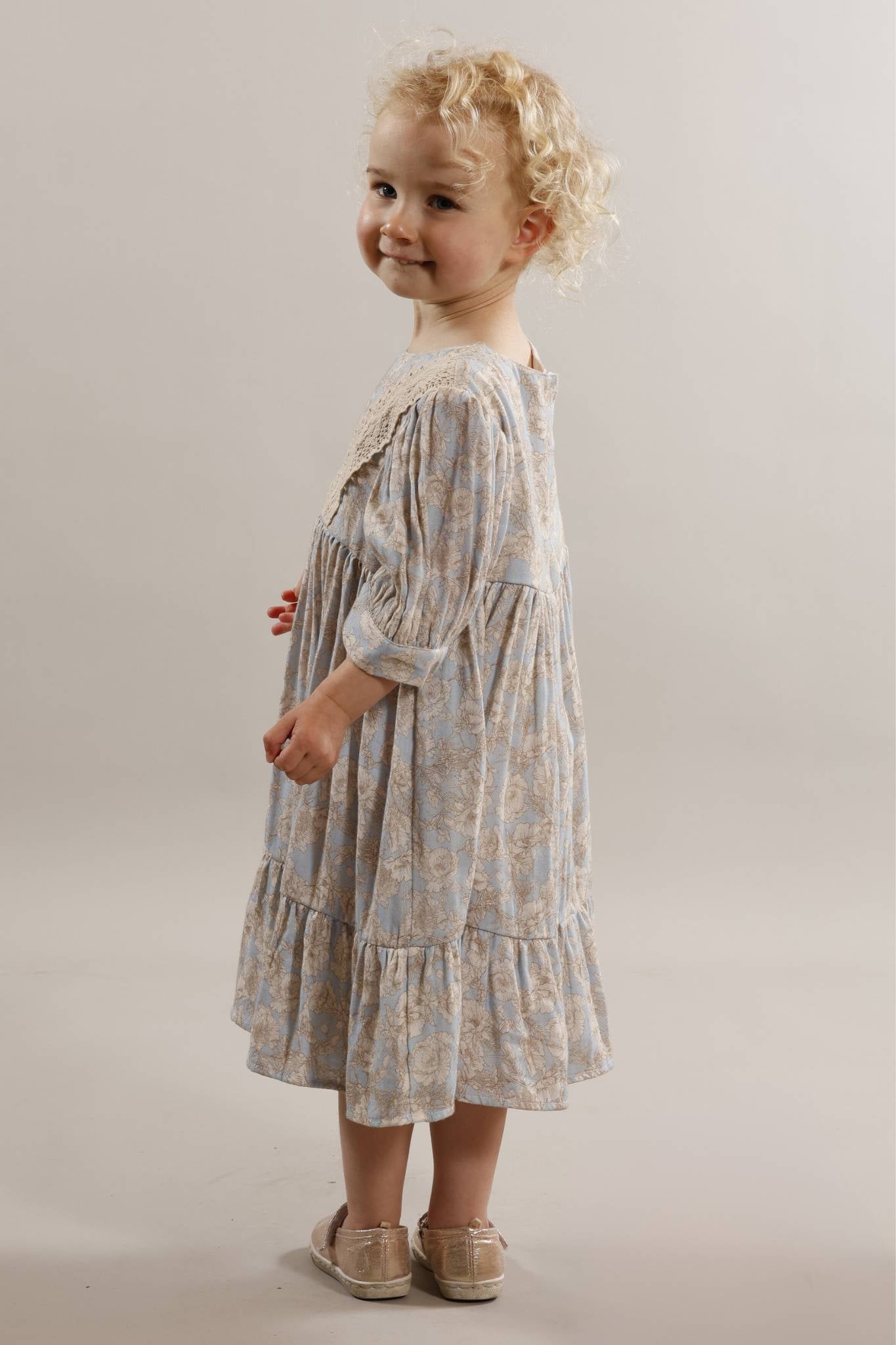 It is gathered onto a yoke with identical lace trim to the adult's version, and a zipper at the back. The cute longer puff sleeves finish the look with vintage charm. Skirt has a frill at the hem.