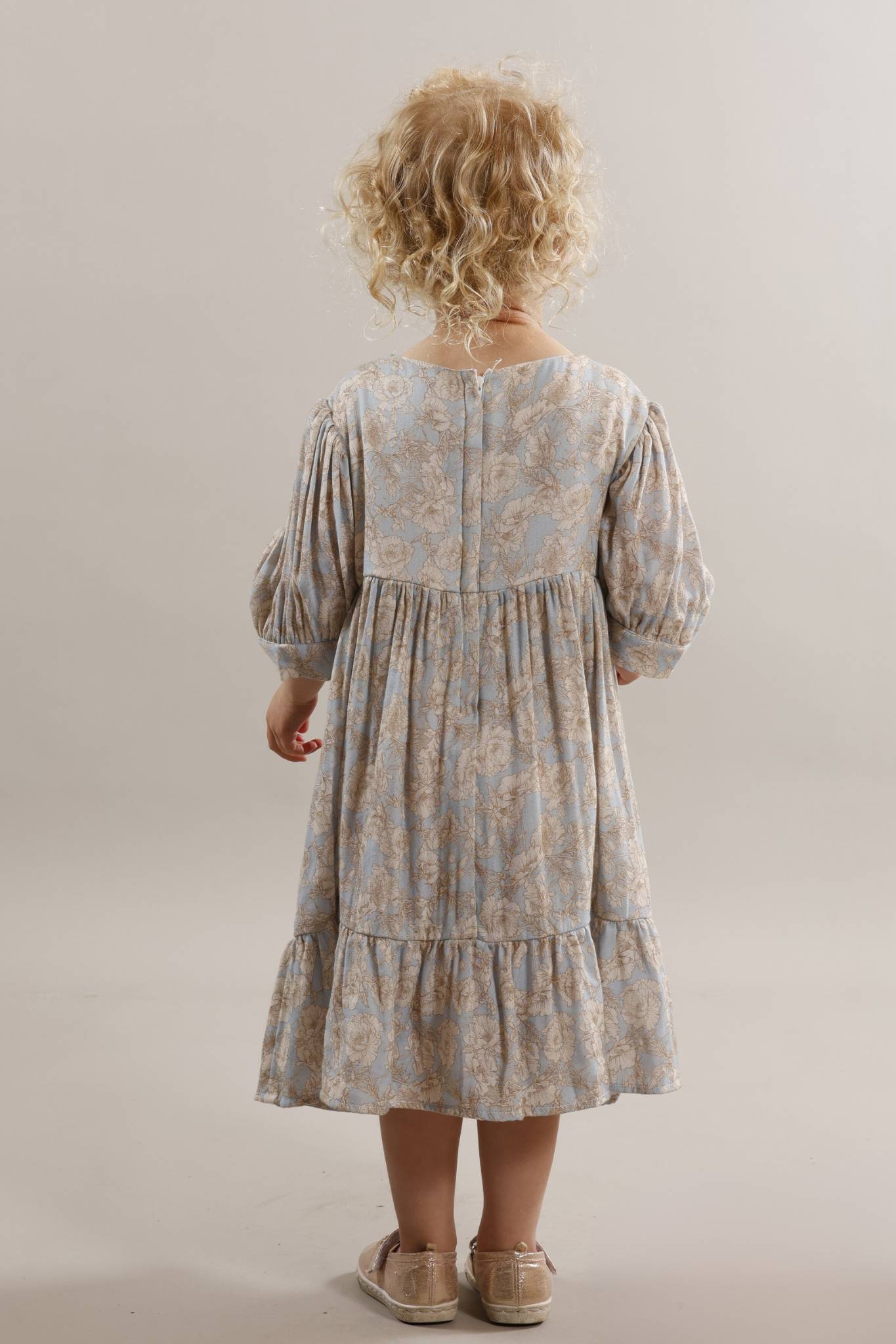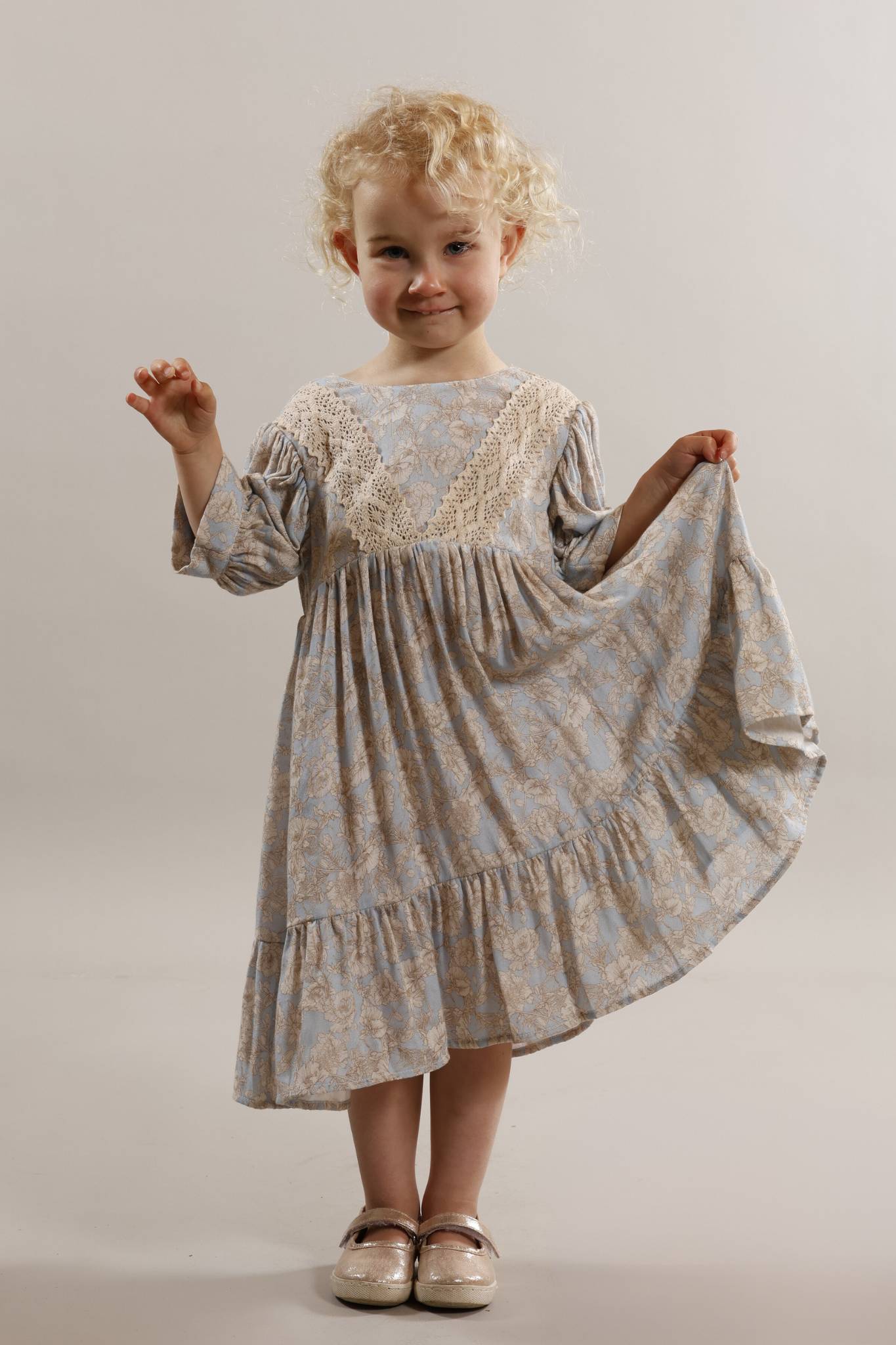 Pure cotton gorgeous dress in pale blue/cream print. - available in sizes 2 - 8 years.