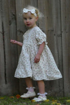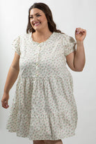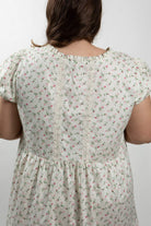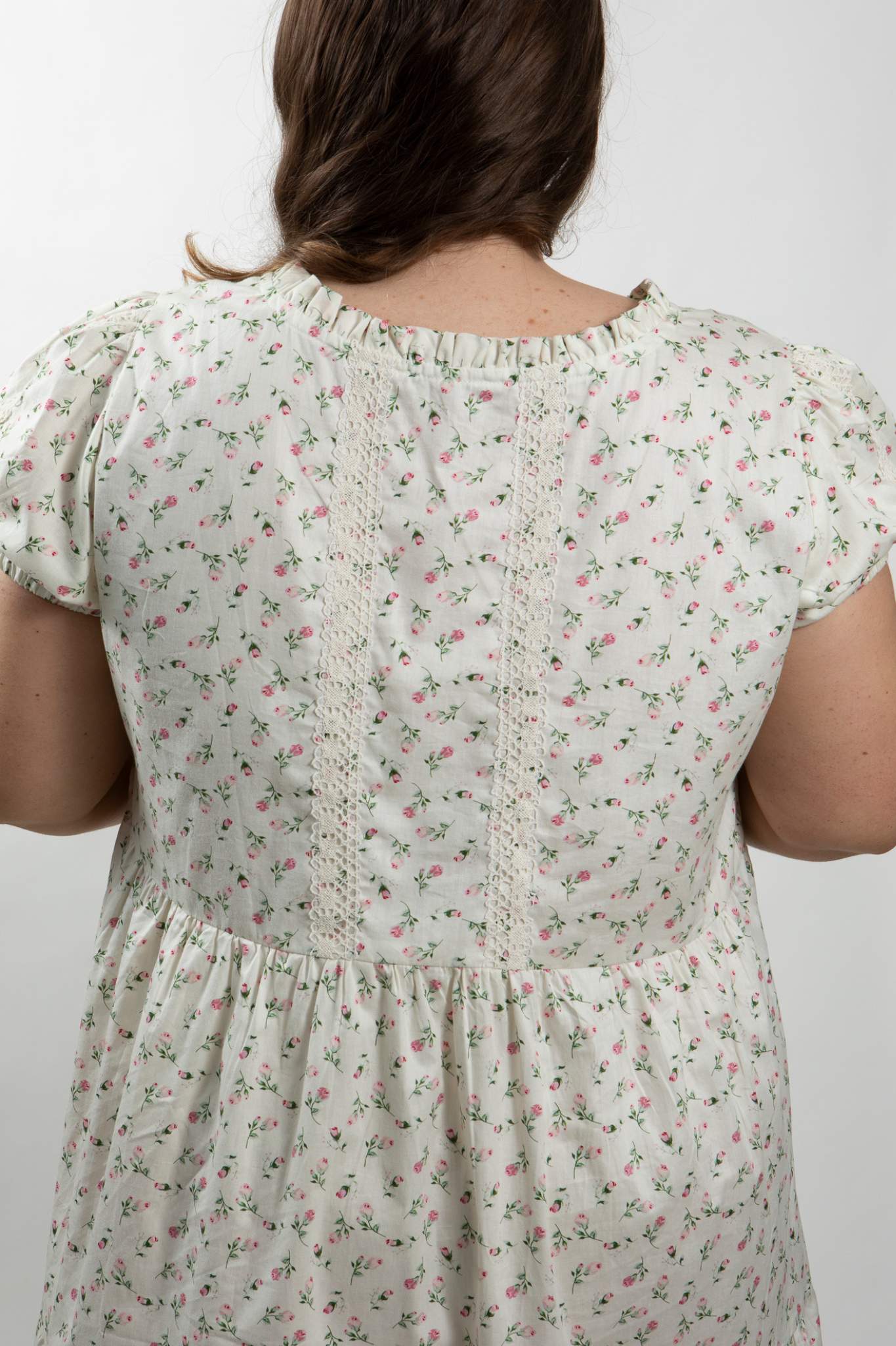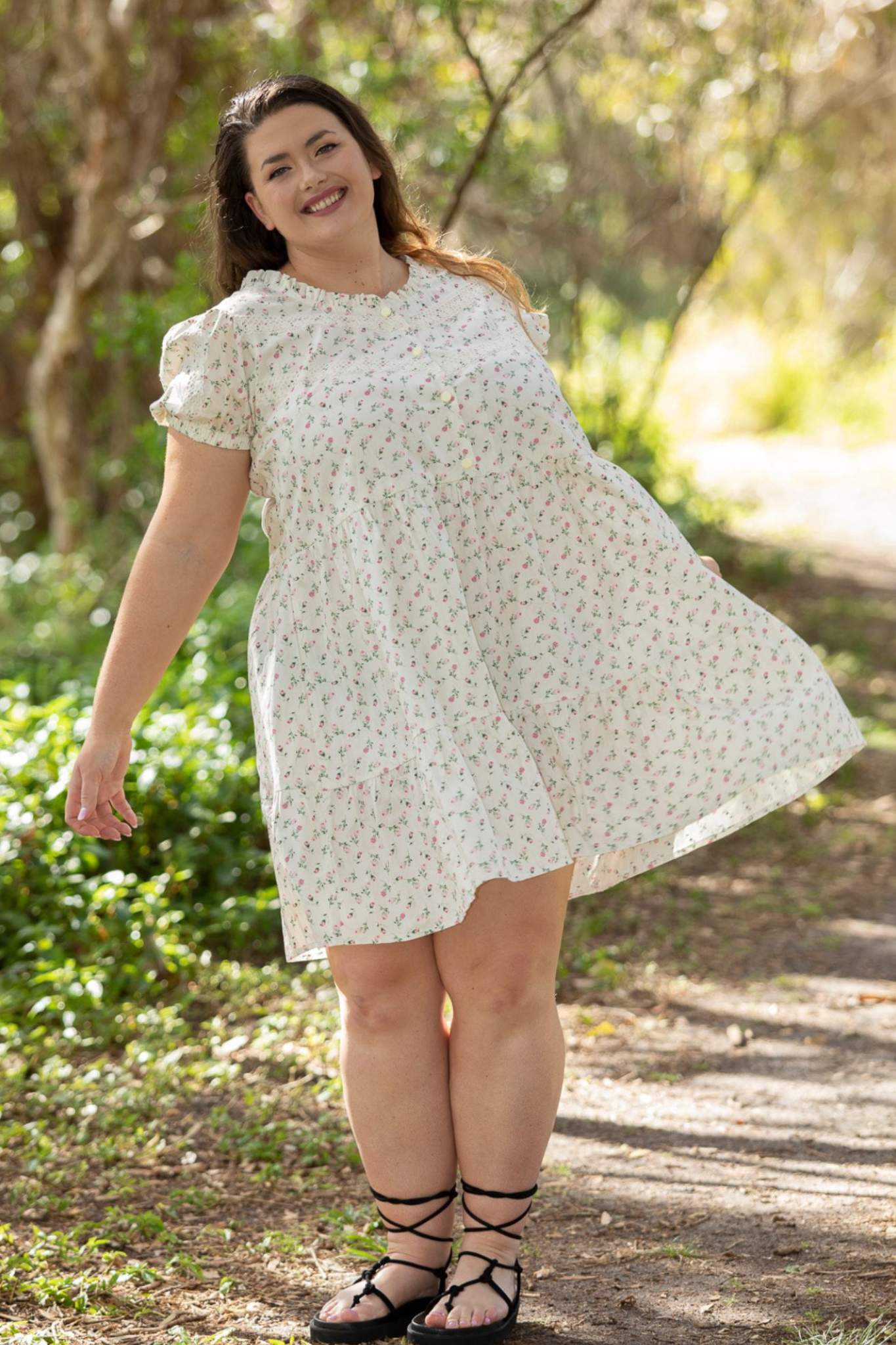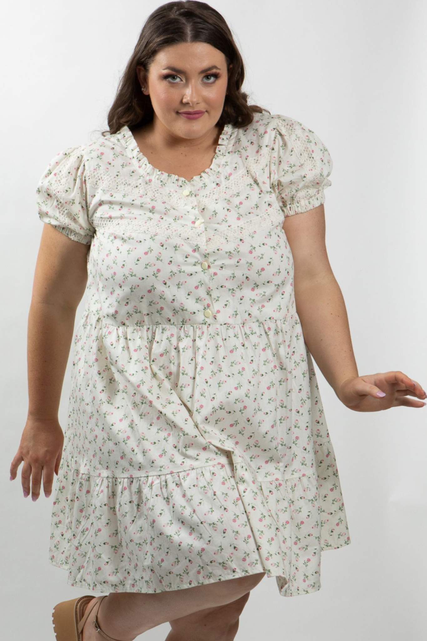 PLUS SIZE and ALL SIZES pure cotton high waisted mini dress in cream rosebud print. Features are vintage style lace across the bodice and front button closure, layered skirt and short elasticised puff sleeves, also trimmed with lace.