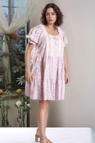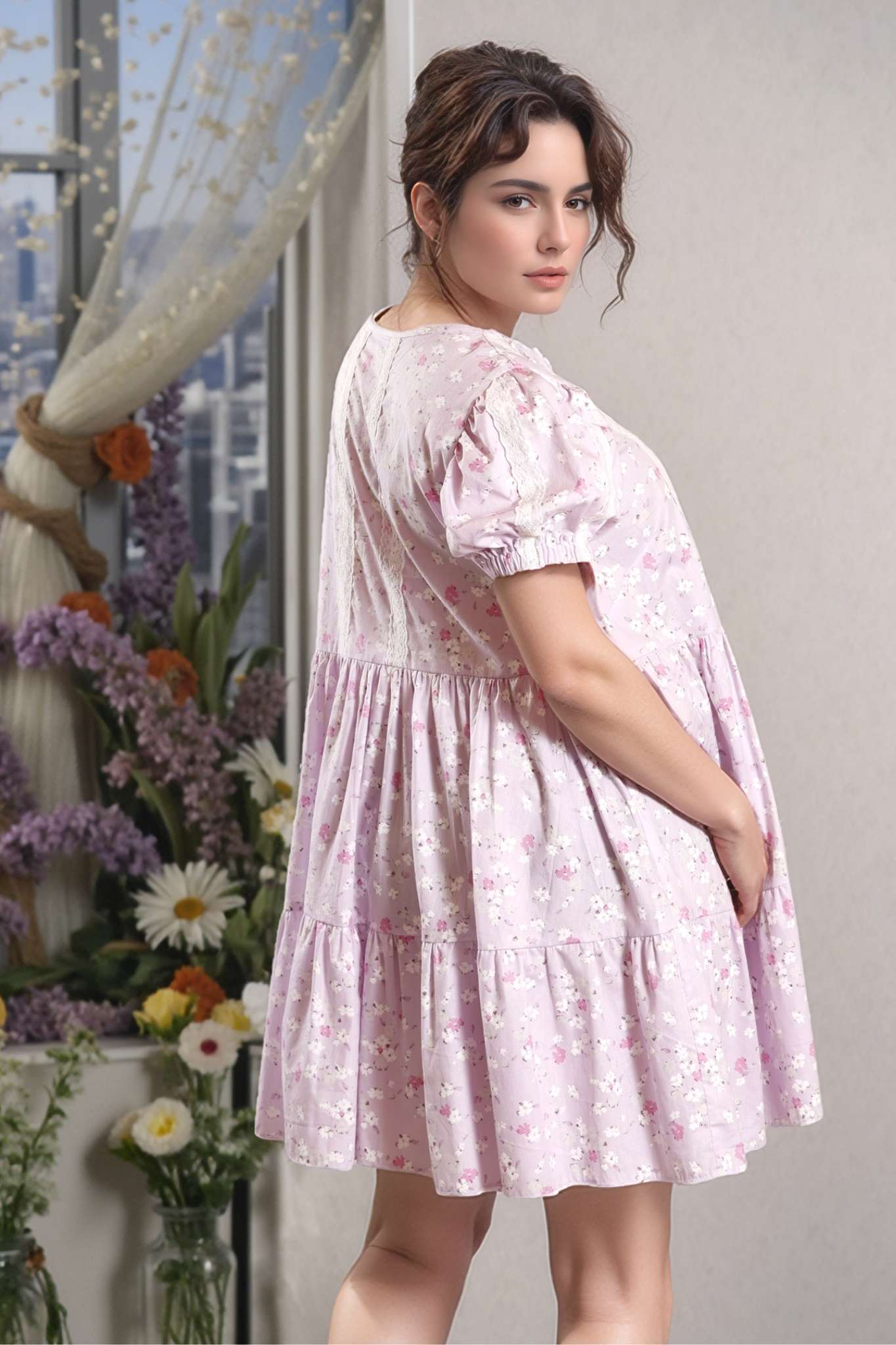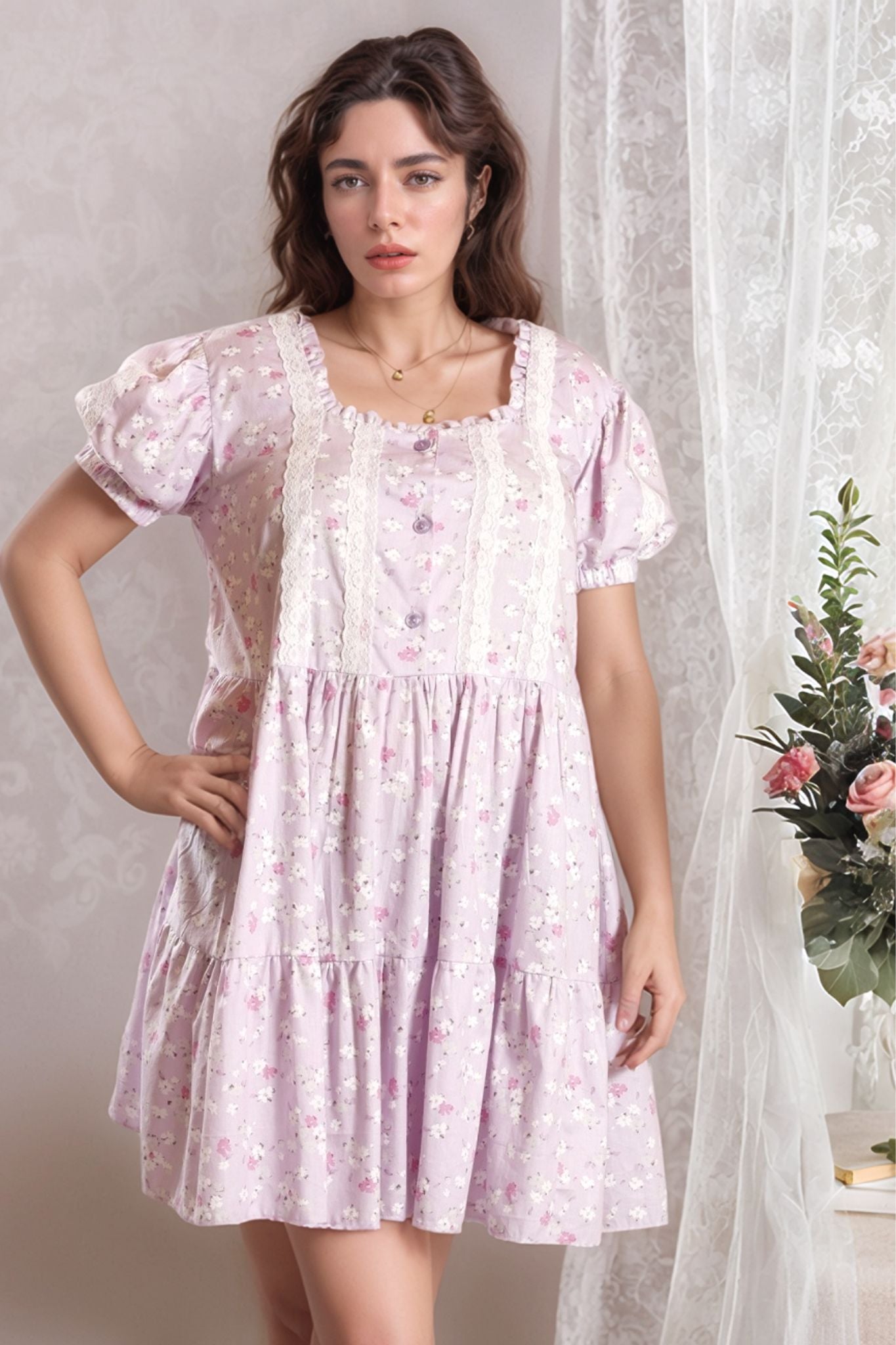 PLUS SIZE and ALL SIZES pure cotton high waisted mini dress in gorgeous lilac print. Features are vintage style lace down the front of the bodice and front button closure. An on-trend cottage core square neckline with delicate frill, completes the romantic vibe.