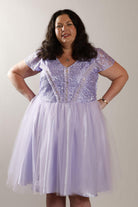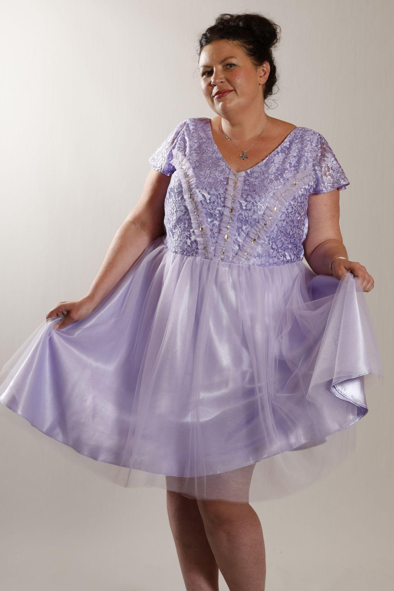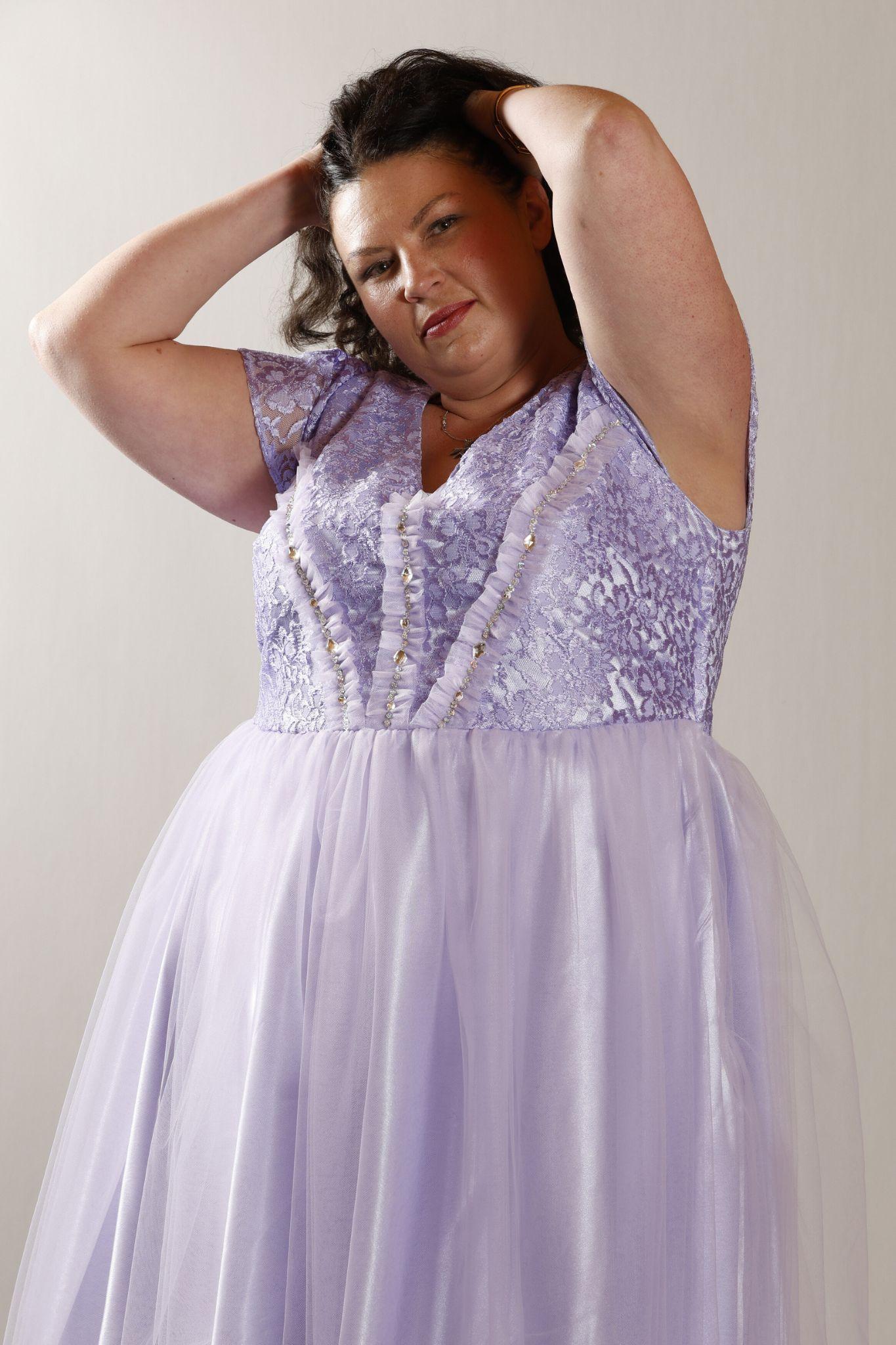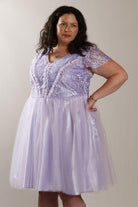 PLUS SIZE and ALL SIZES lilac rayon blend lace and nylon bridal tulle over satin waisted party or bridesmaids knee length dress.