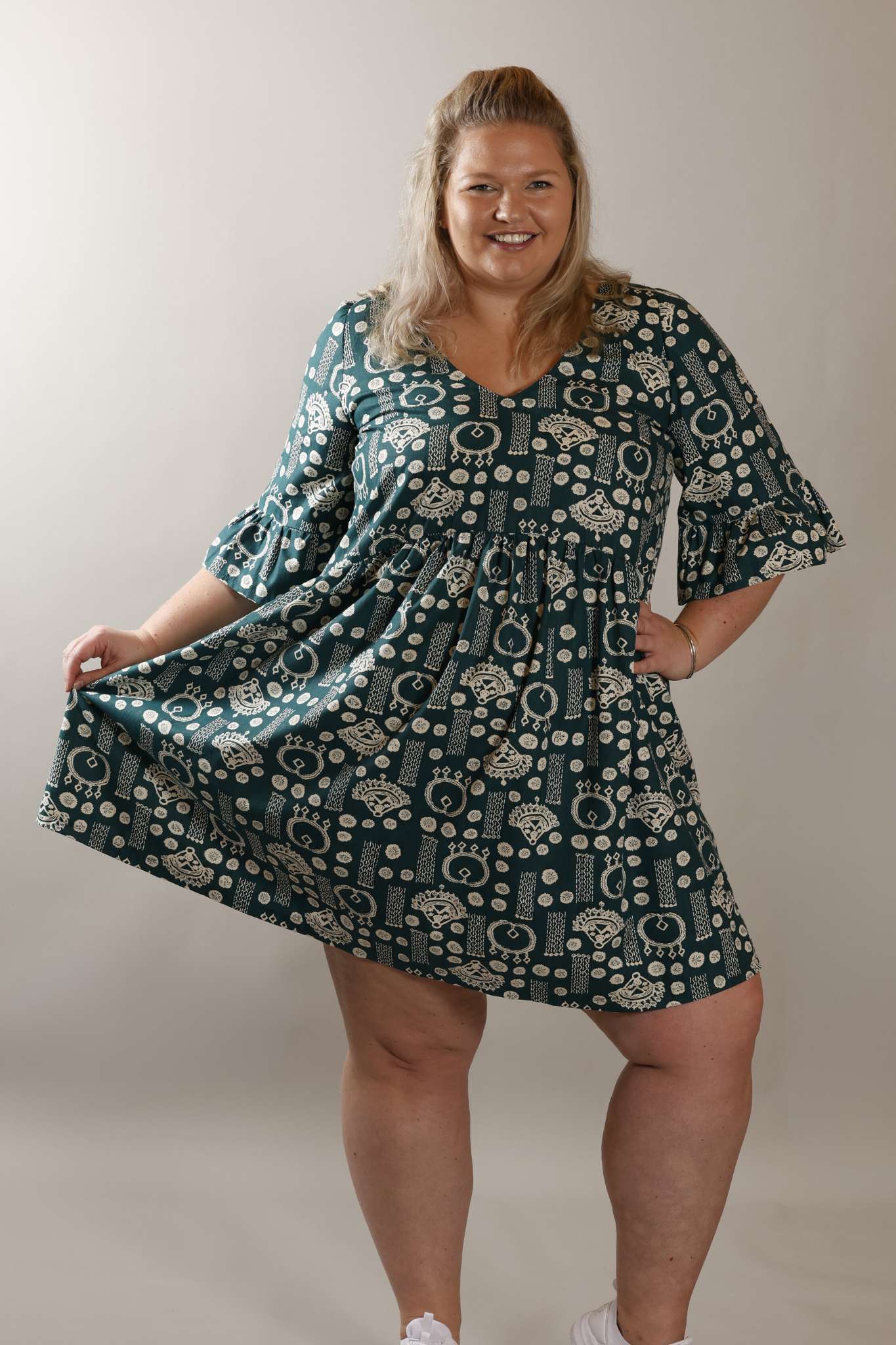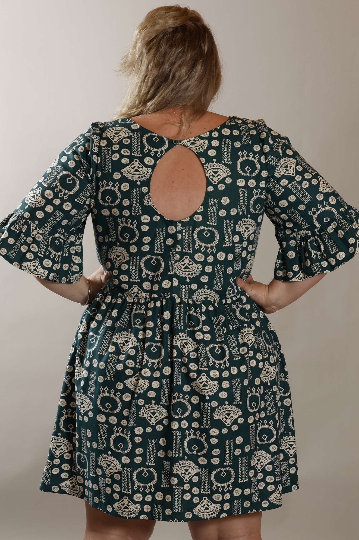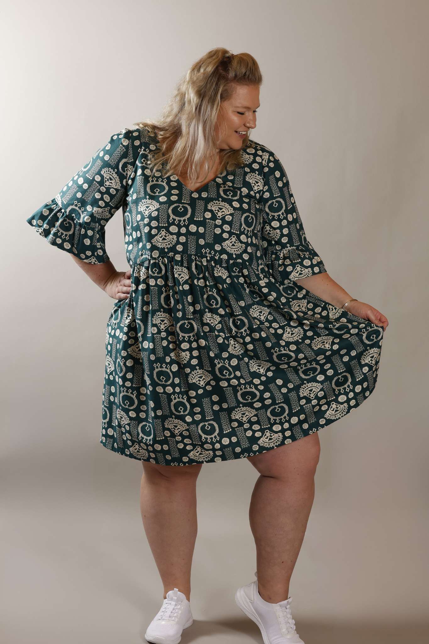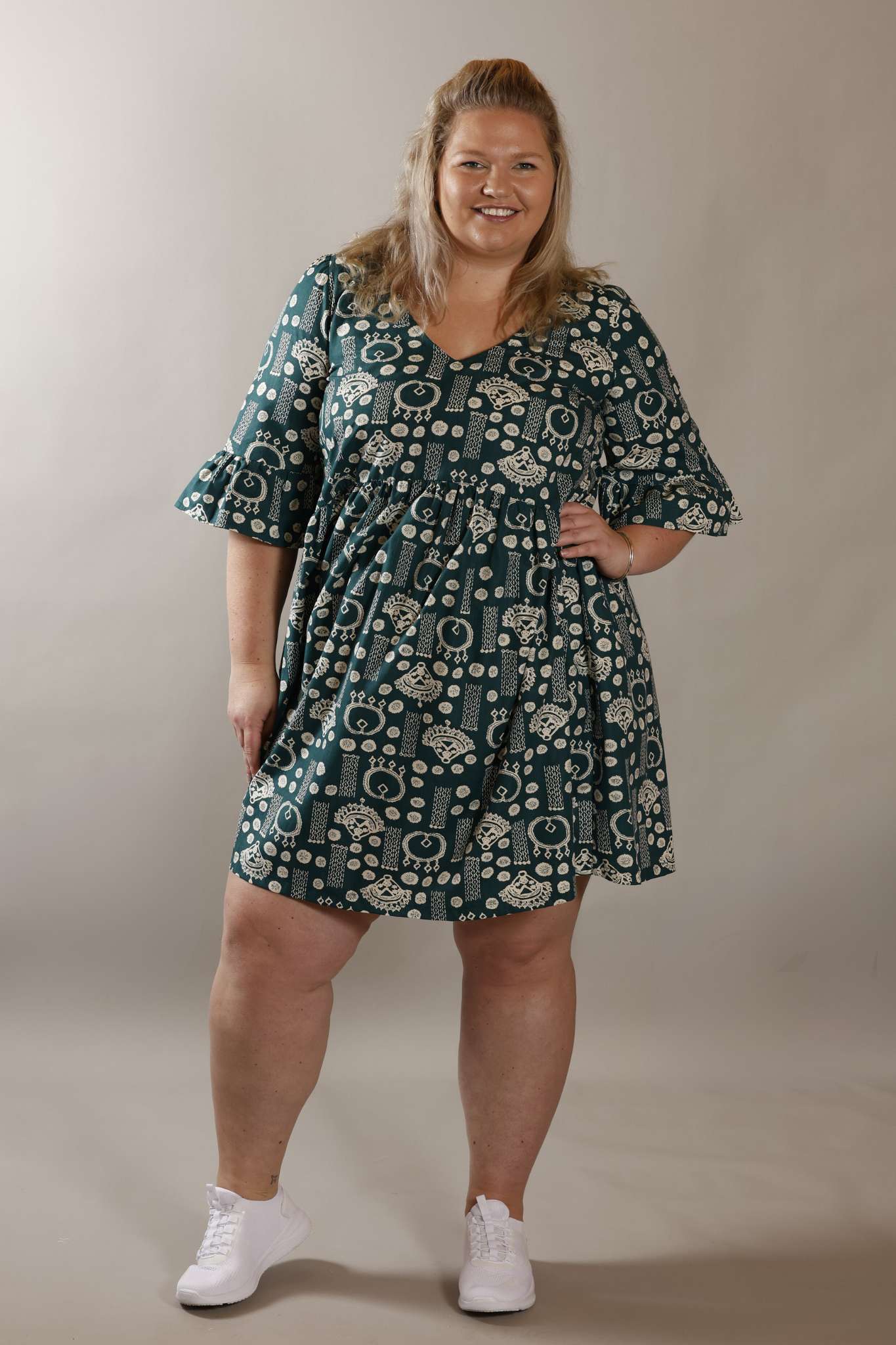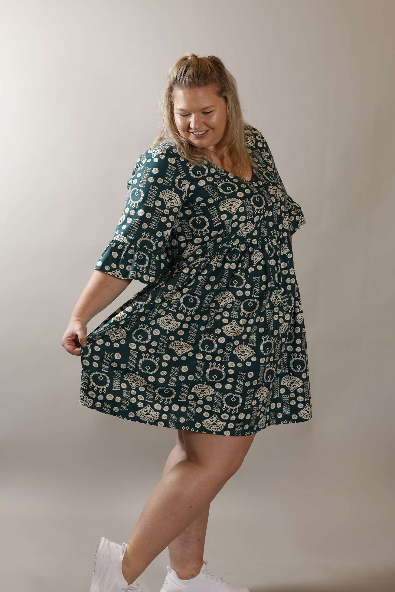 PLUS SIZE and ALL SIZES 100% cotton dress in gorgeous forest green with a white print. This dress is a loose fitting smock style, which is so easy to wear for summer or layered up for cooler weather.
