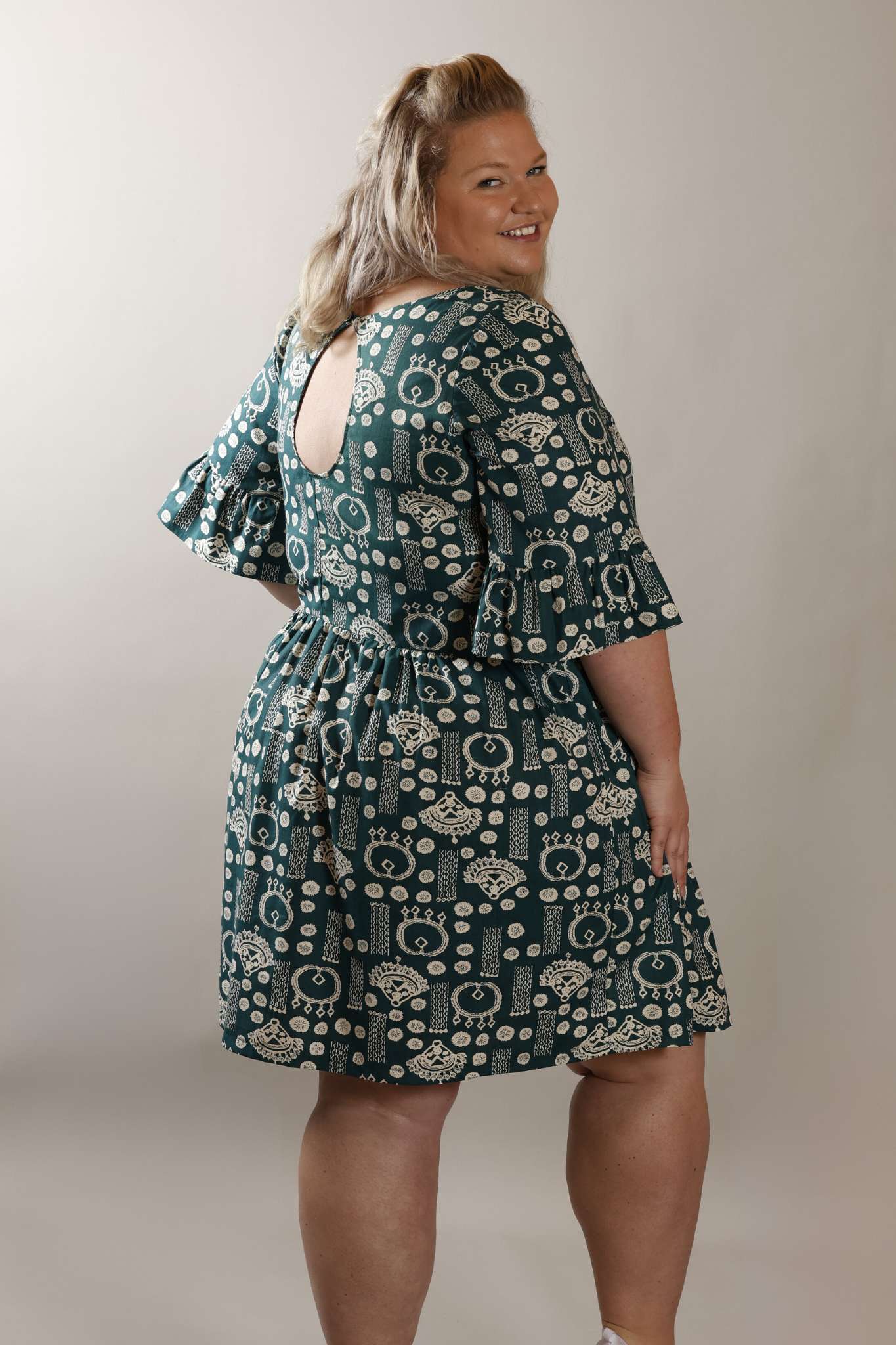 Features are a "V" neck at the front, and a curved empire waistline, with cute keyhole back. It finishes at the knee or just above, depending on your height.