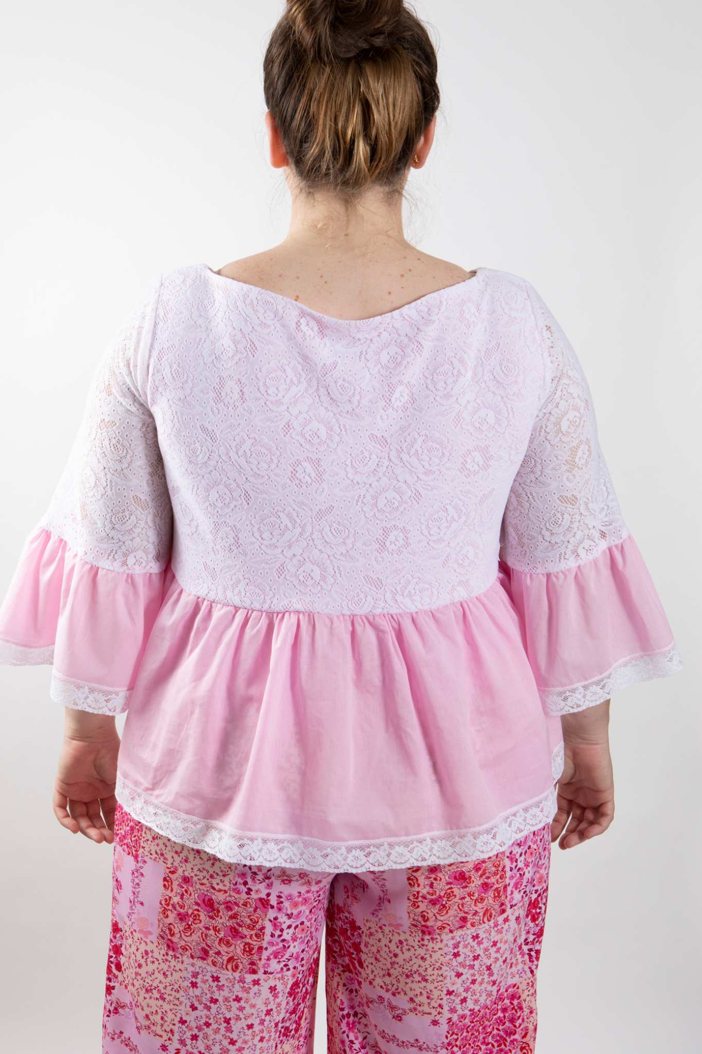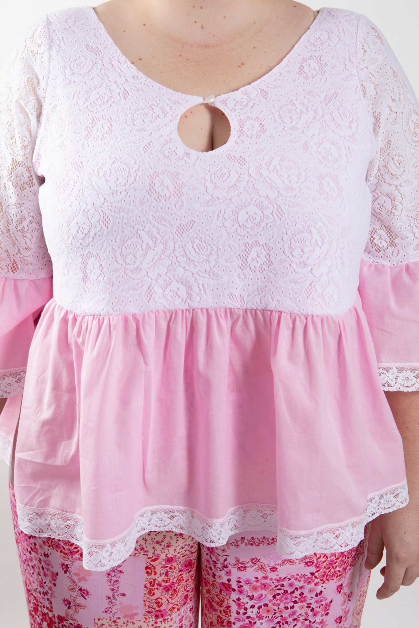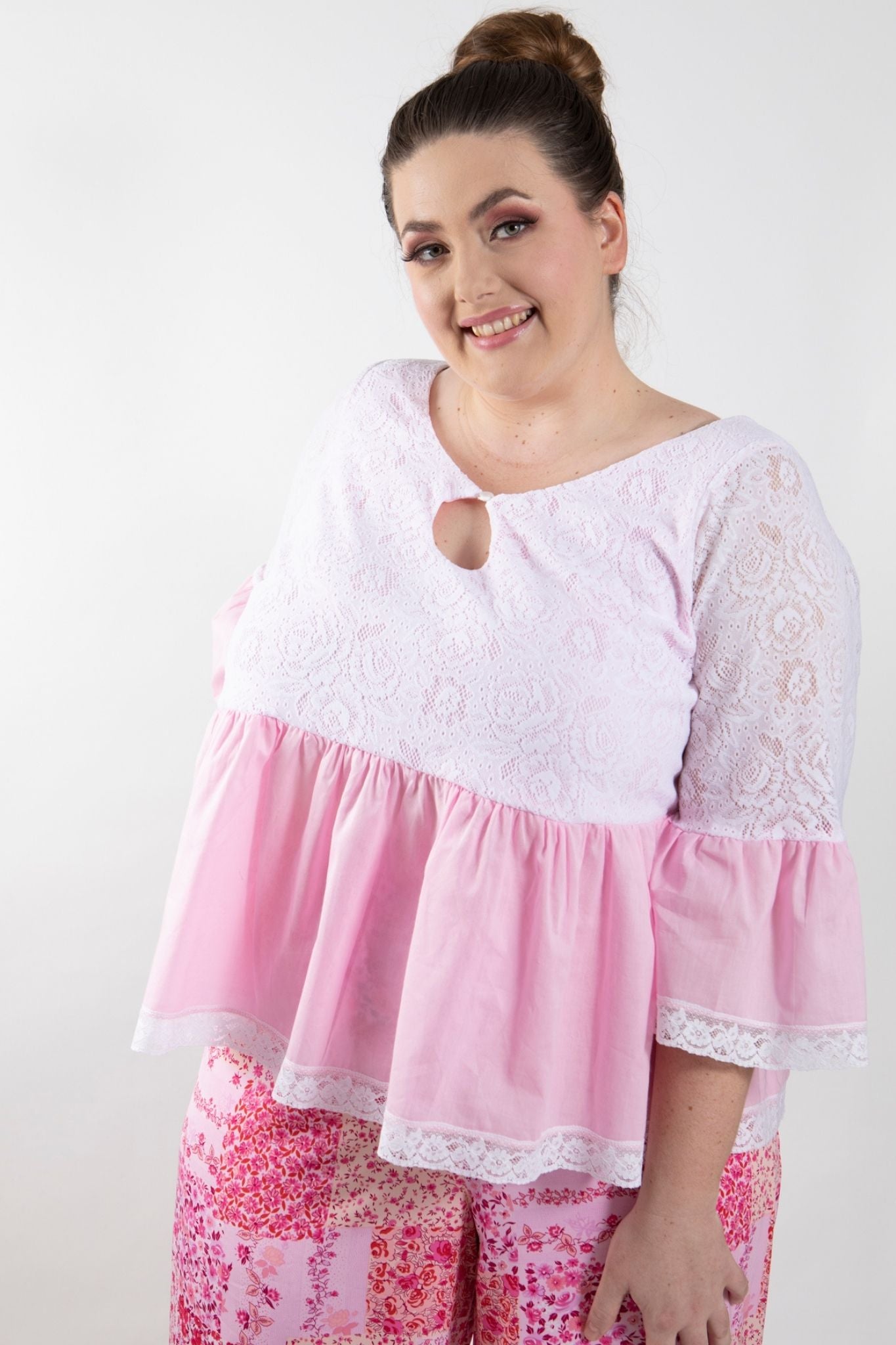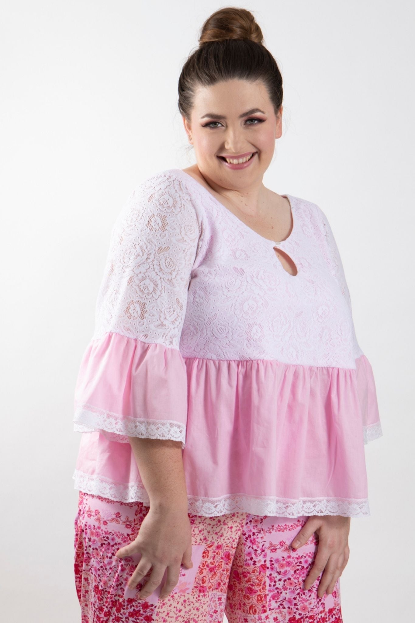 PLUS SIZE and ALL SIZES. Be a girly girl in this cute as stretch white lace top with pink lining and pink cotton frill. Sleeves have matching pink cotton frills edged with cotton lace. Keyhole neckline with pearl button and loop finishes the look.
