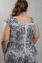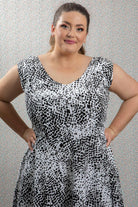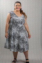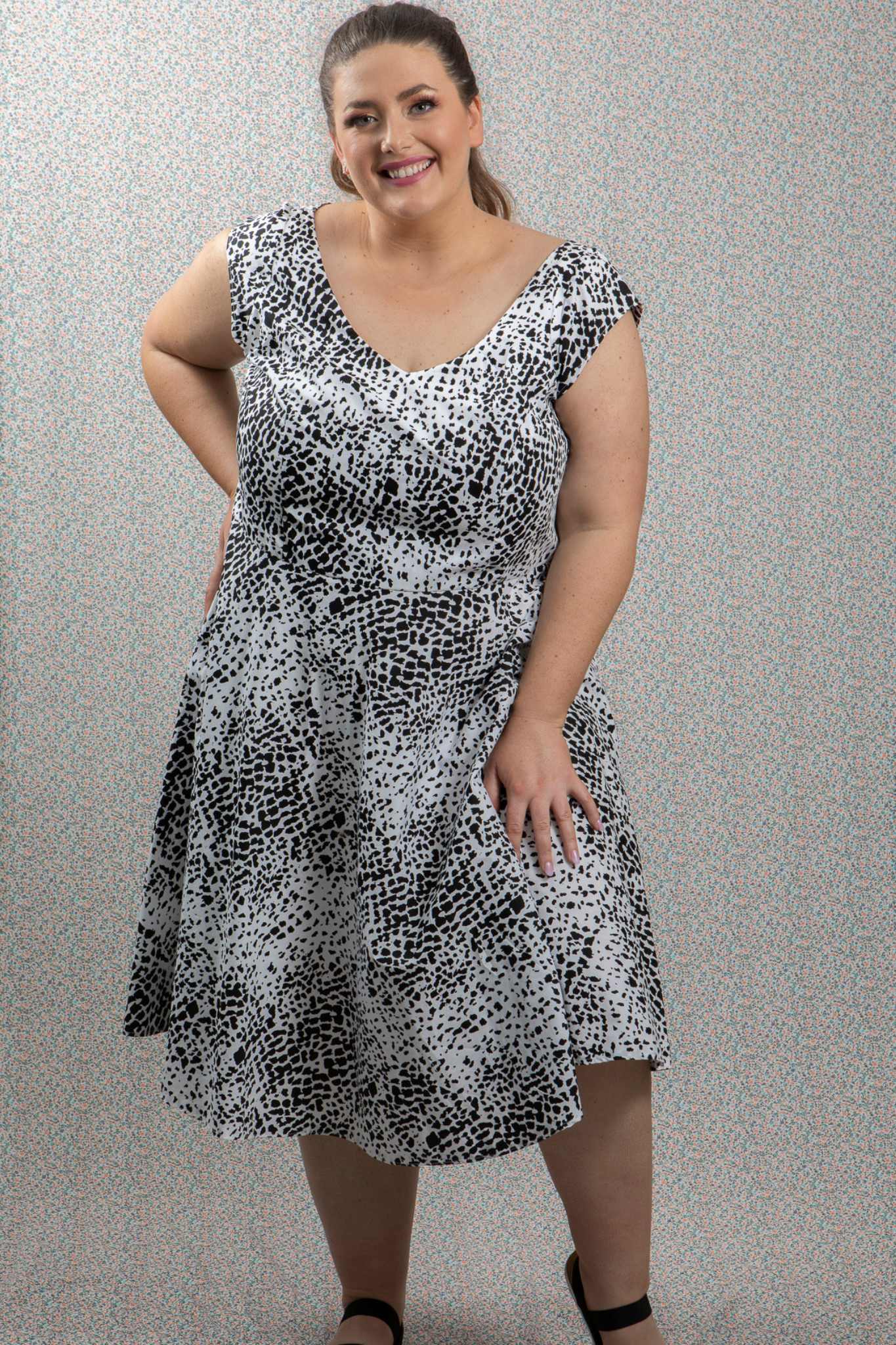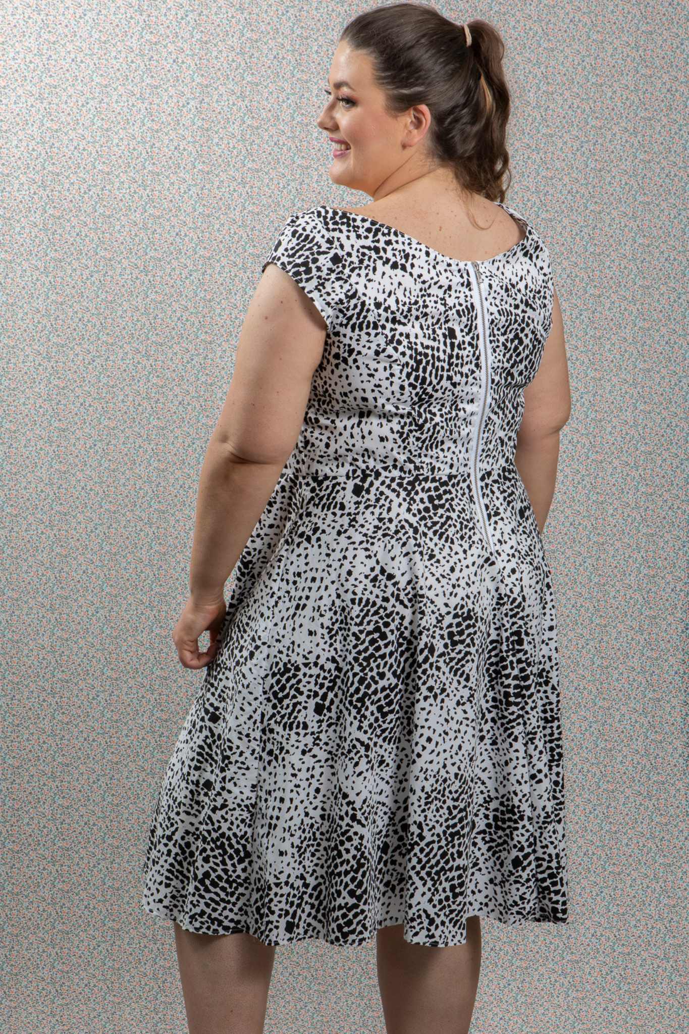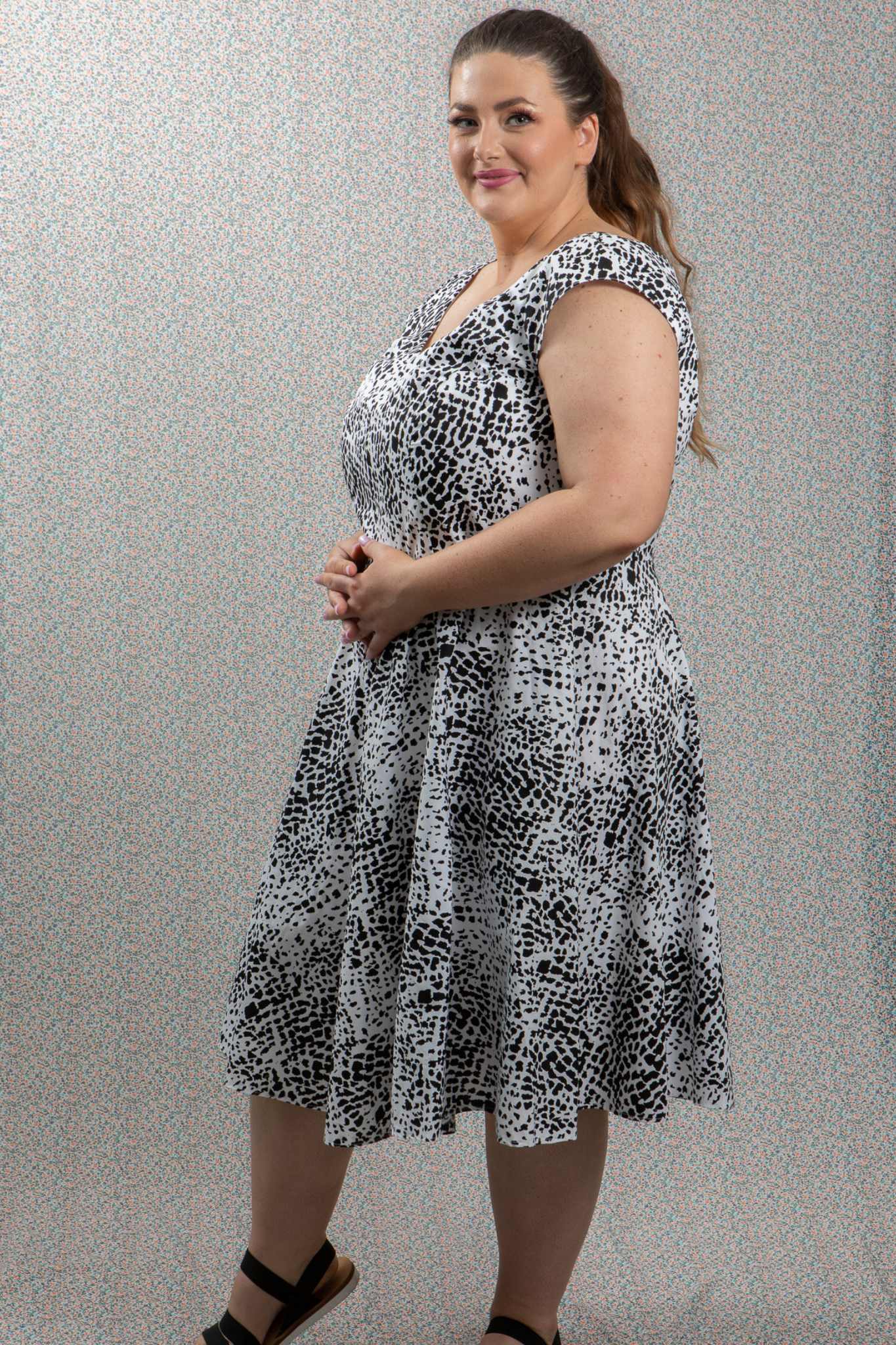 PLUS SIZE and ALL SIZES pure cotton waisted dress in black/white animal print. Features are princess seams on the bodice, with a scooped neckline and semi circular skirt. Cute cap sleeves and an on trend exposed zip at the back finish the look.
