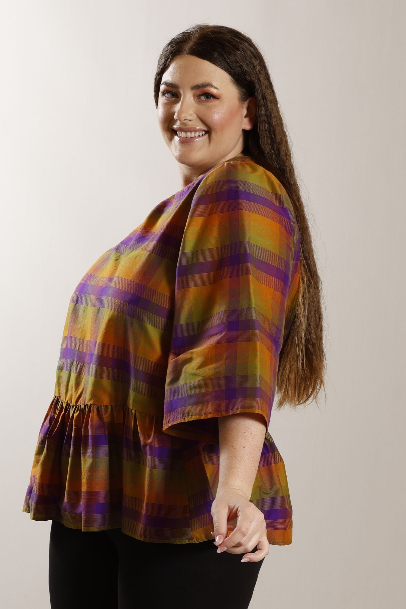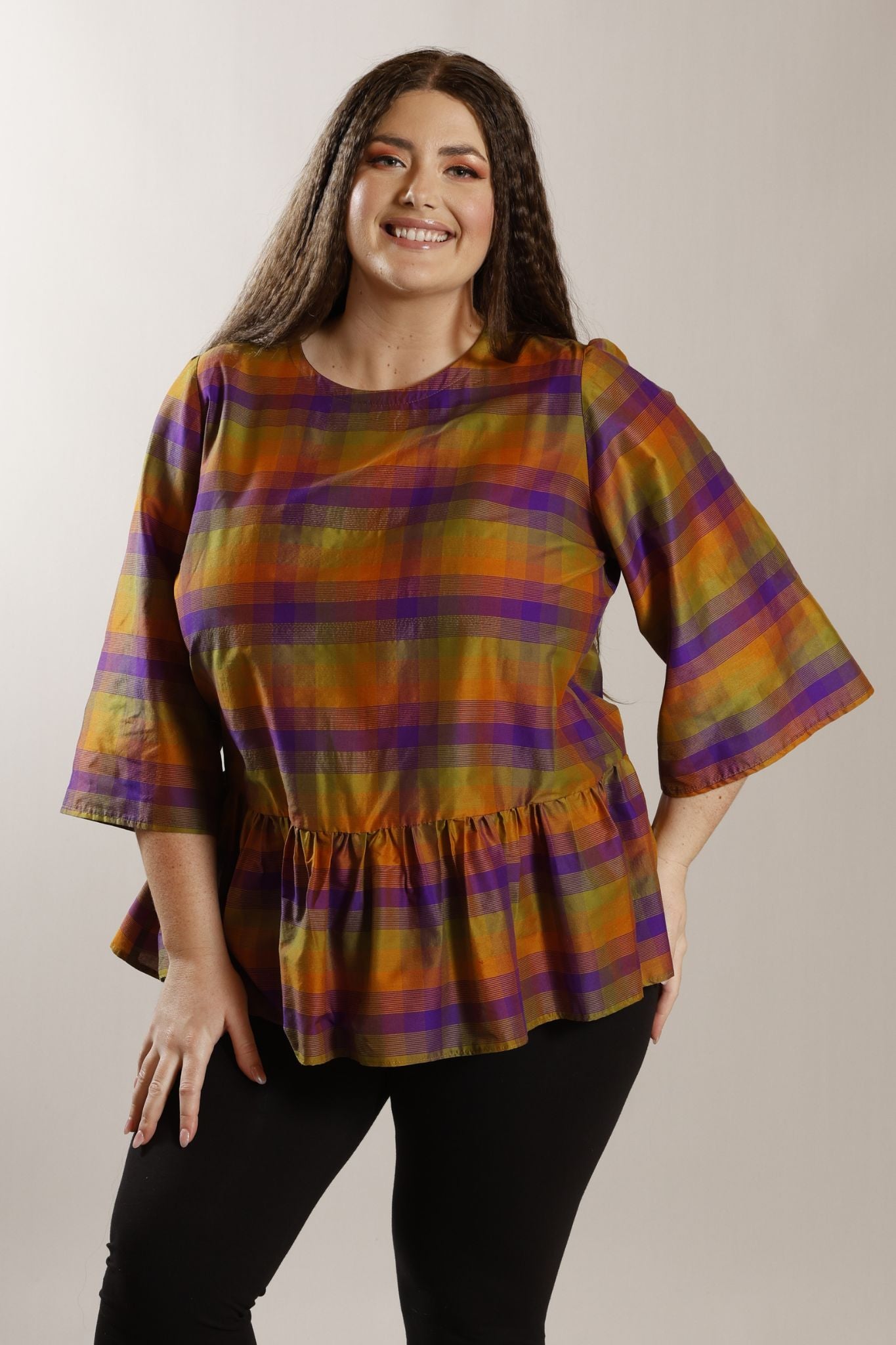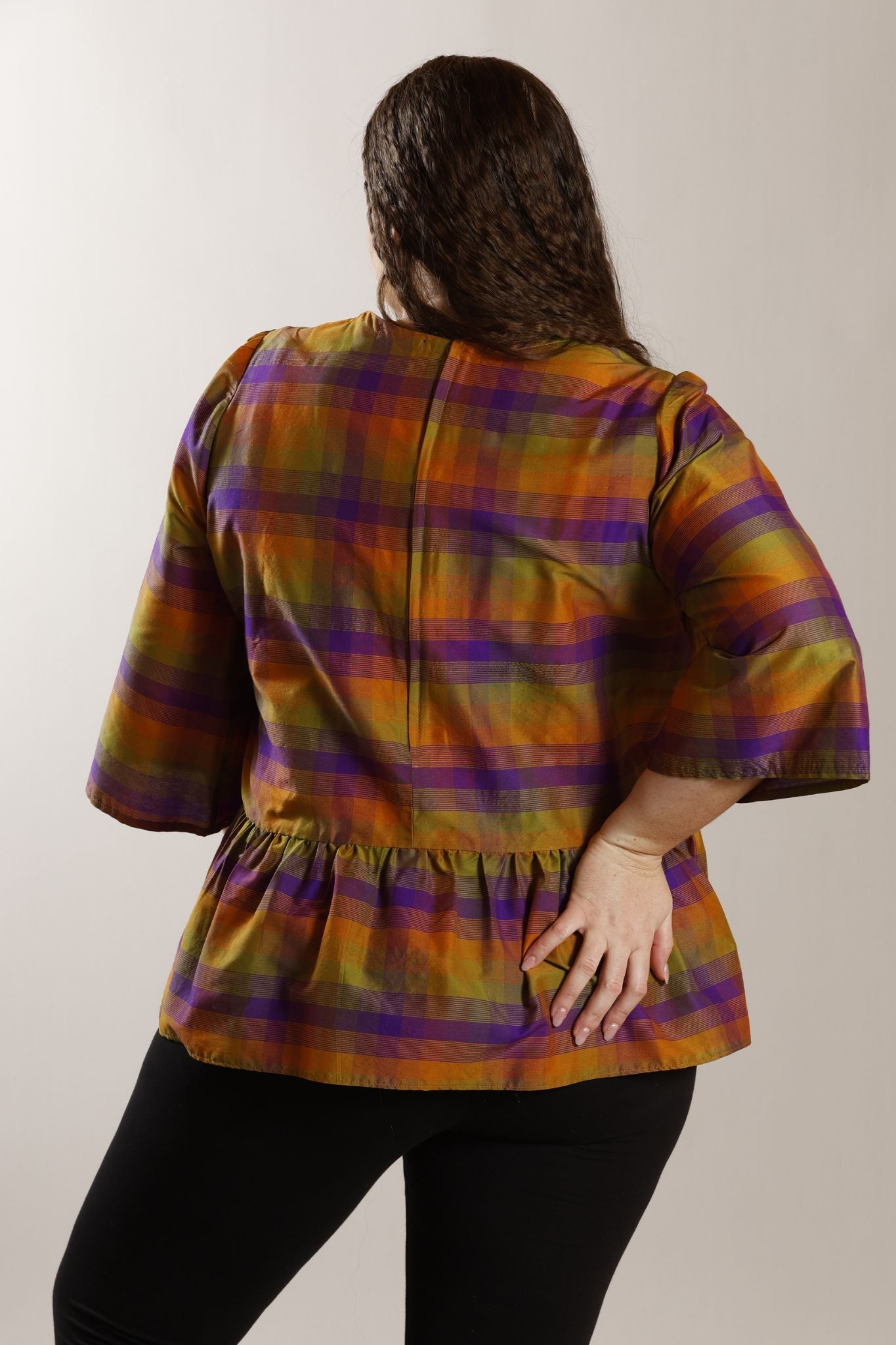 PLUS SIZE silk/cotton check pattern top in tones of olive/purple/maize. It features bell shaped 3/4 sleeves, with a zip closure at the back. A peplum frill at the hipline, finishes the look.