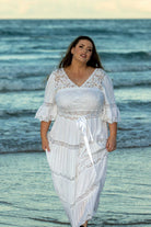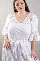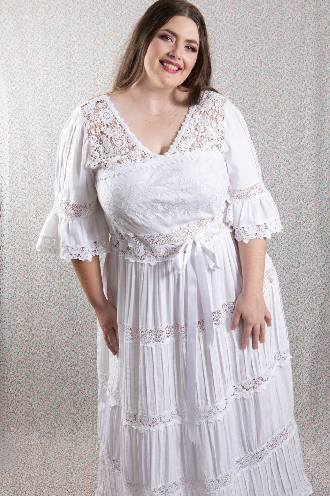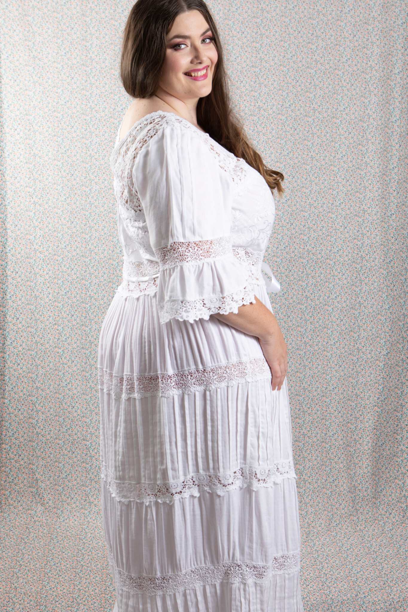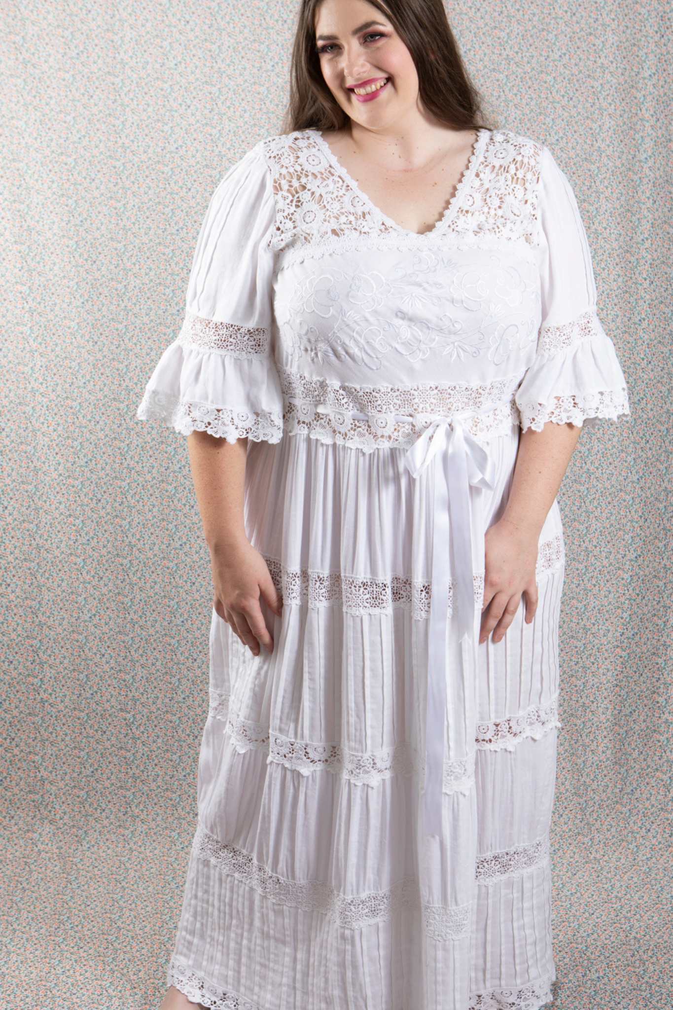 PLUS SIZE and ALL SIZES white cotton dress with embroidery, lace and pintucks make this perfect for that garden/beach/or casual wedding ceremony.